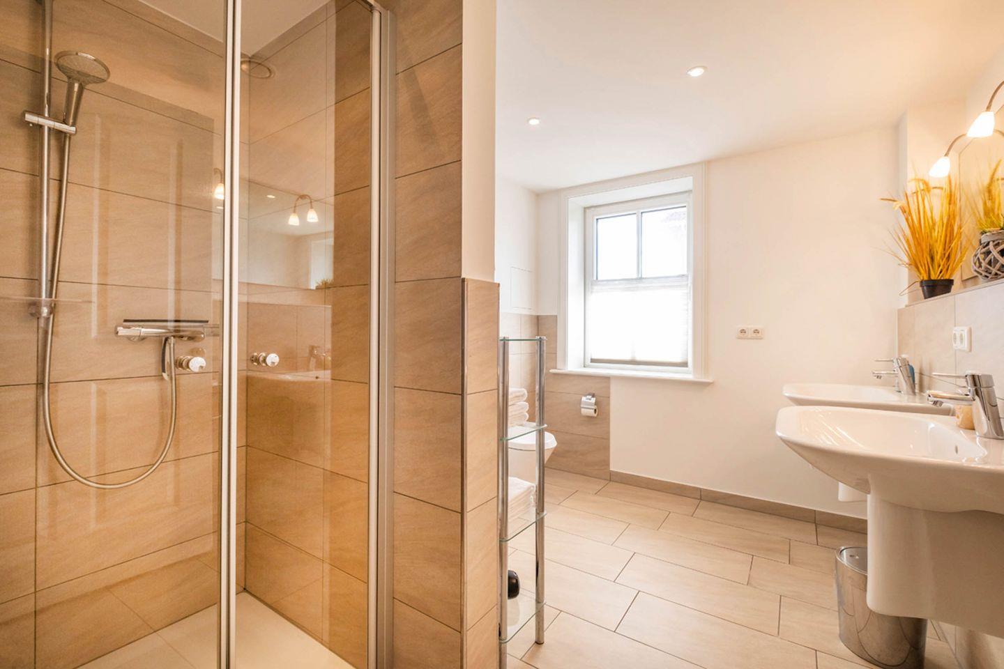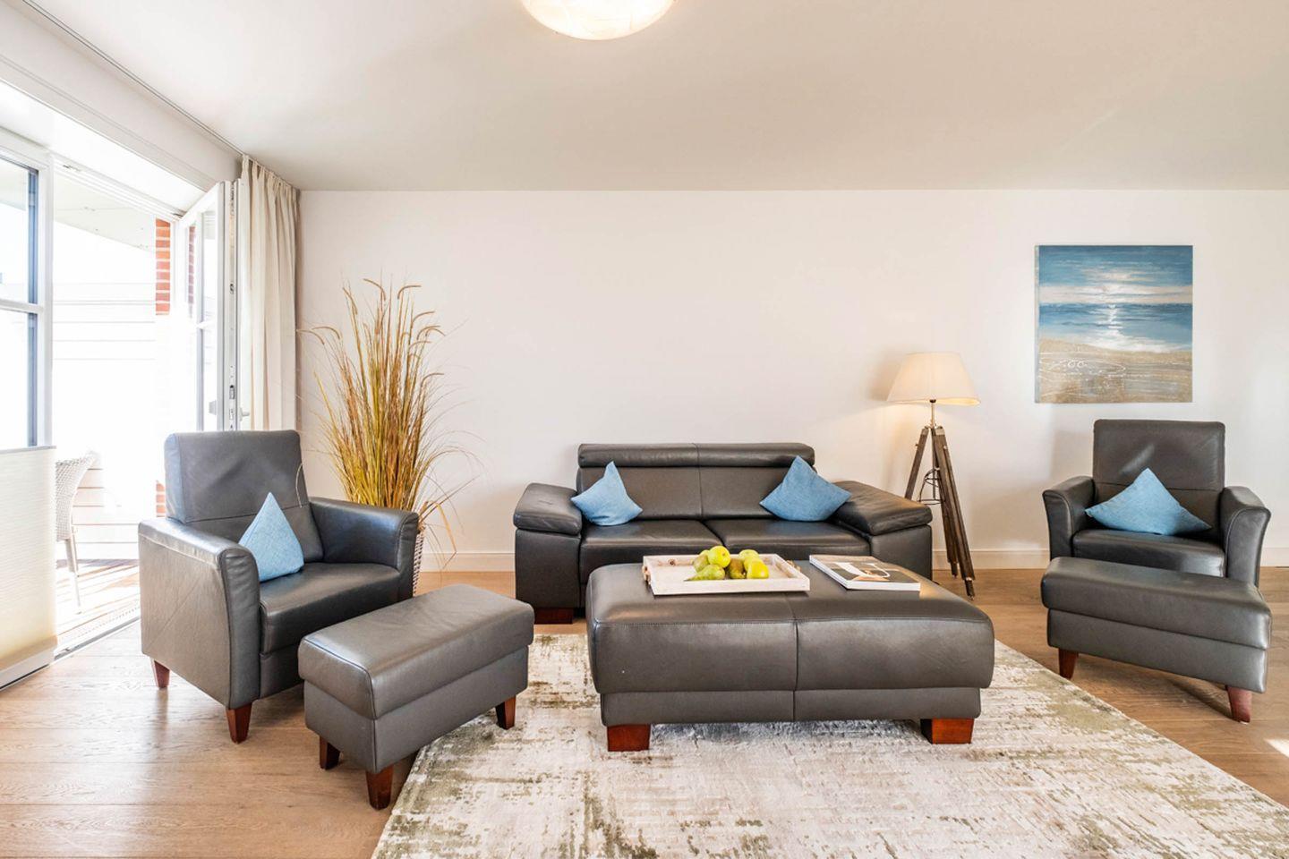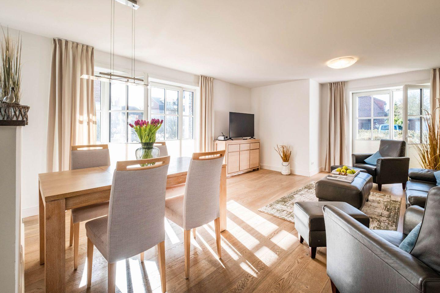 Das Appartement 1.6 befindet sich im Erdgeschoss mit Terrasse. Im Wohnraum finden Sie eine gemütliche Couchgarnitur, 2 Sessel mit Hocker. Die Küche und der Essbereich sind im Wohnbereich integriert. Beide Schlafzimmer sind mit Doppelbetten und TV ausgestattet. Das Bad verfügt über eine barrierefreie Dusche/WC. Das Appartement verfügt zusätzlich über ein Gäste- WC. Fußbodenheizung befindet sich im ganzen Appartement. Auf die beiden Terrassen gelangen Sie vom Wohnraum. Das Appartement verfügt über eine Gegensprechanlage mit Kamera. Im Keller finden Sie Waschmaschine und Trockner (gebührenpflichtig), Abstellraum für Fahrräder und einen gemeinschaftlichen Fitnessraum. Aufzug im Haus. Am Haus finden Sie einen weiteren abschließbaren Fahrradabstellraum und einen kleinen Spielplatz für unsere kleinen Gäste.
