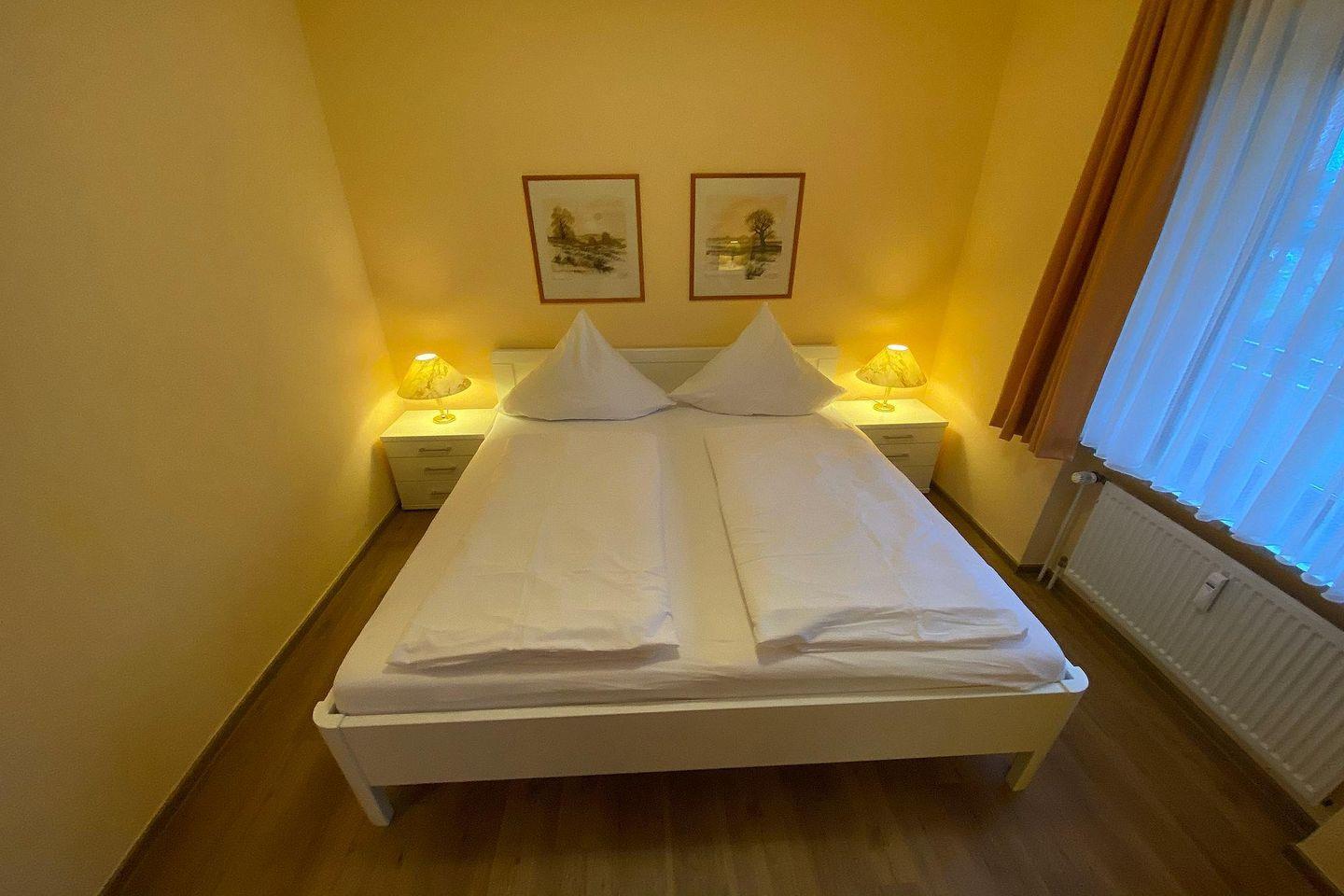 Beide Schlafzimmer sind mit Doppelbetten ausgestattet, wobei das eine Bett 1.90 m und das andere Bett 2.00 m lang ist. Das Bad verfügt über eine Dusche/WC. Vom Wohnzimmer, der Küche und einem der Schlafzimmer gelangt man auf den in Südwestlage liegenden Balkon.