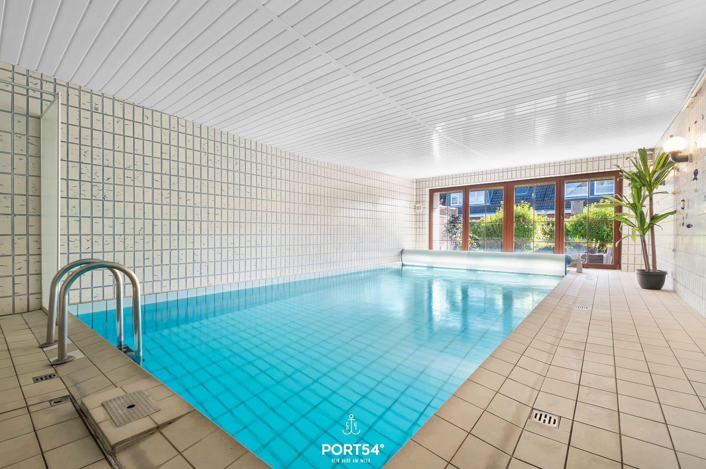 Für Entspannung und Wellness sorgt unser Indoor-Schwimmbad, welches Sie sich mit den anderen Hausbewohnern teilen. Nach einem erfrischenden Bad können Sie sich unter der zusätzlichen Dusche im Schwimmbadbereich erfrischen. Darüber hinaus haben Sie Zugang zu einer großzügigen Gemeinschaftsterrasse, die perfekt zum Sonnenbaden geeignet ist.