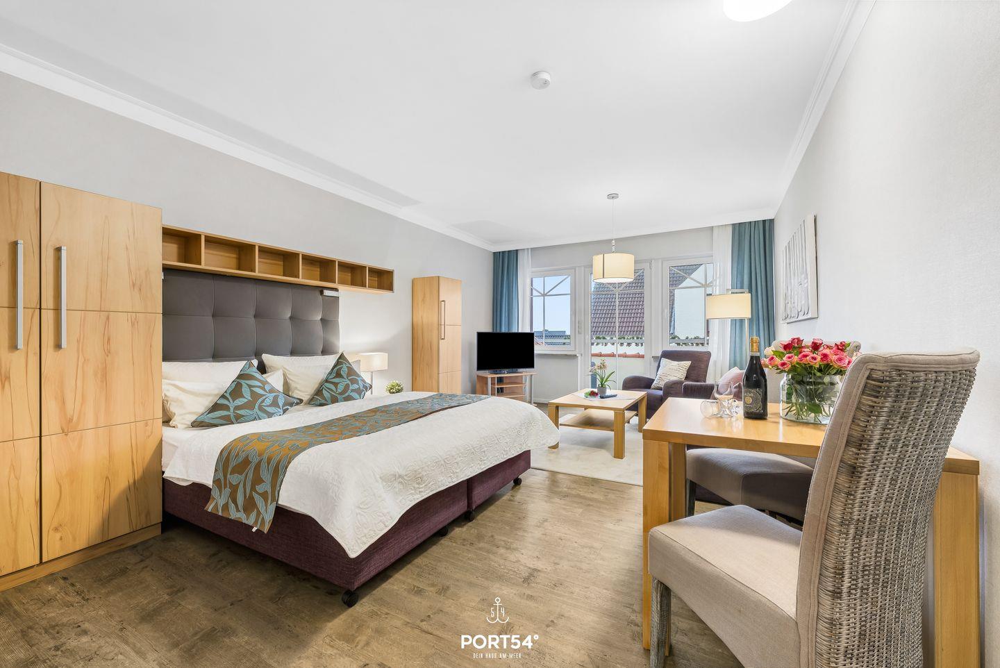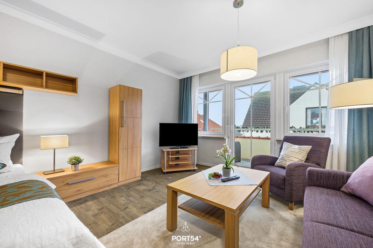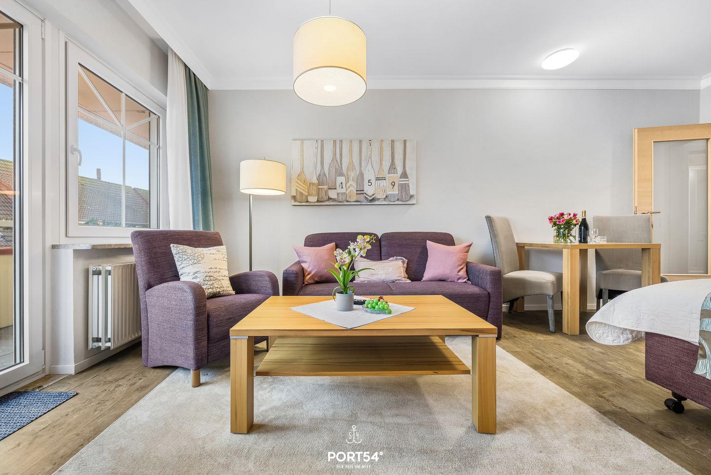 Der helle Wohnraum ist gemütlich eingerichtet und verfügt über eine Sofaecke mit Sofa und Sessel, einen Esstisch sowie einen TV. Hier kannst du nach einem erlebnisreichen Tag an der Nordsee entspannen oder den Abend gemütlich ausklingen lassen. WLAN mit einer Geschwindigkeit ab 100 Mbit/s steht dir ebenfalls zur Verfügung.