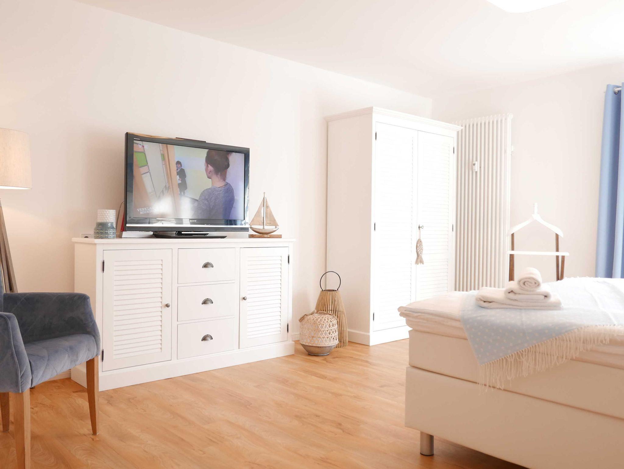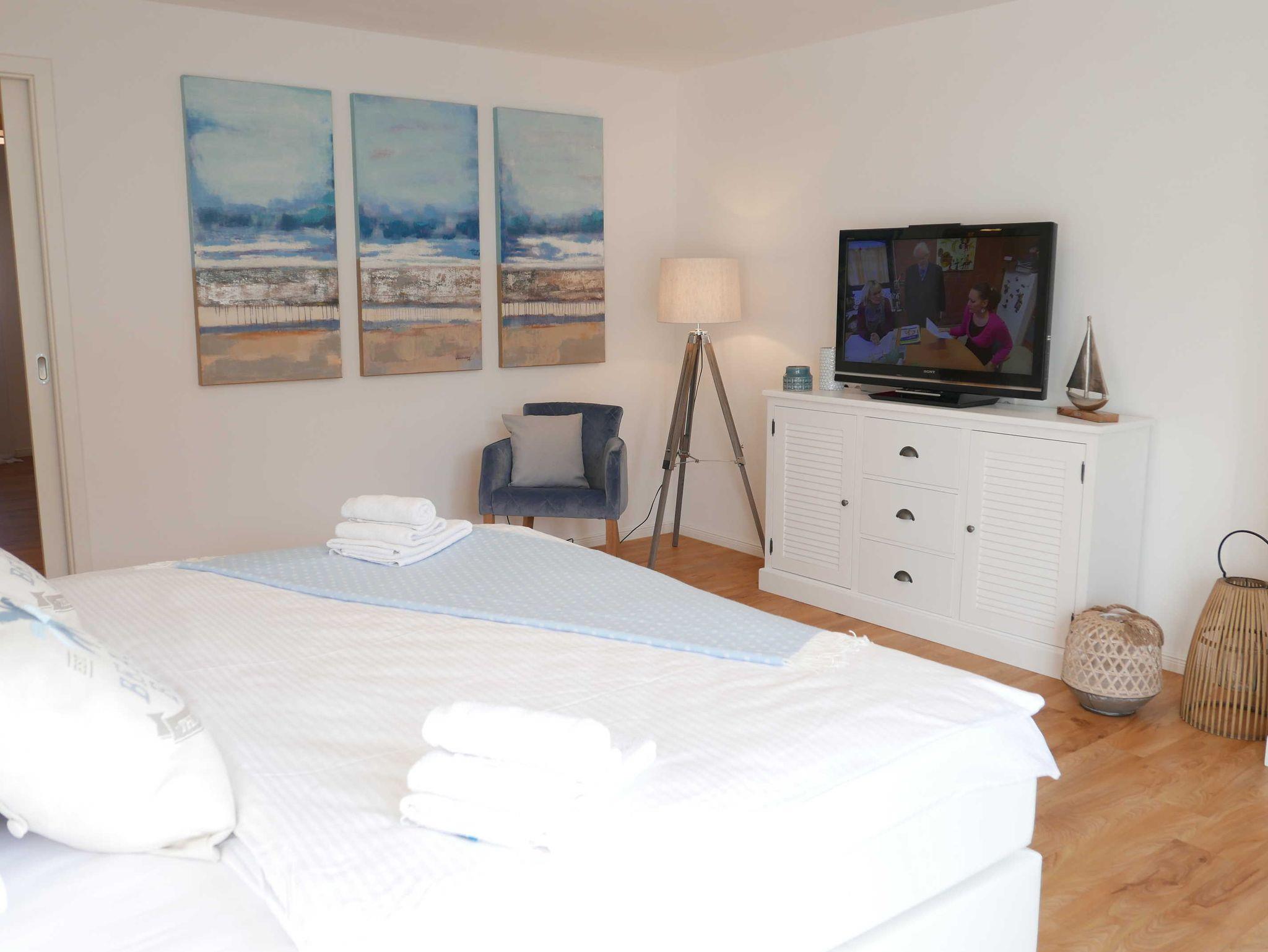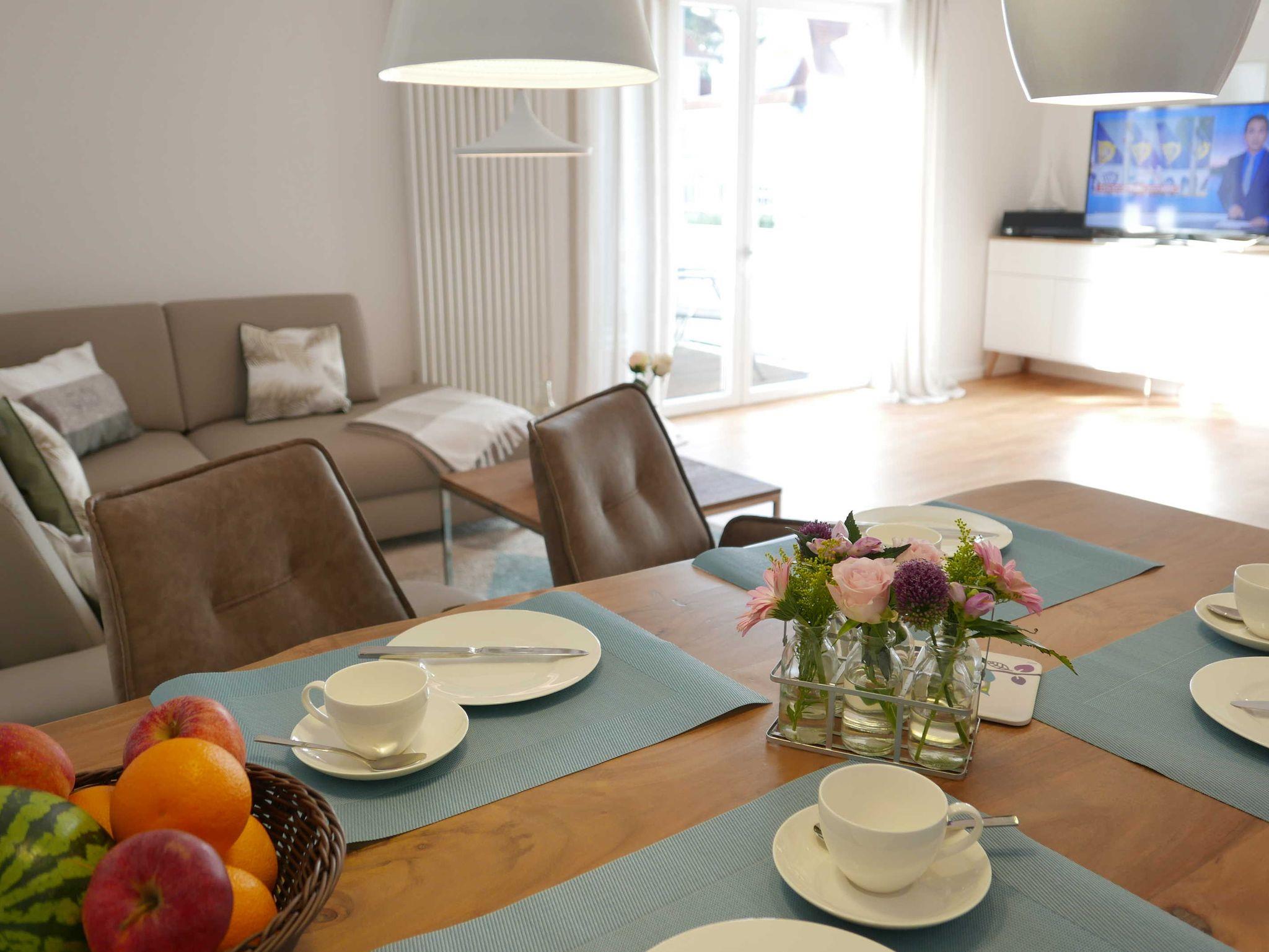 In dieser hellen und freundlichen 3-Zimmer-Ferienwohnung bleiben keine Wünsche offen! Liebevoll eingerichtet und mit maritimen Accessoires gespickt lässt sich der Urlaub auf 103qm in vollen Zügen genießen. Das großzügig und hochwertig ausgestattete Wohn-/Esszimmer bietet sowohl einen Essbereich als auch einen gemütlichen Sofabereich. Auch die technische Ausstattung ist vorzeigbar: 2 Fernseher mit SAT-Anschluss, eine Musikstation mit Radio, CD, und Anschluss für MP3-Player und bluetoothfähige Geräte sorgen für Vergnügen.