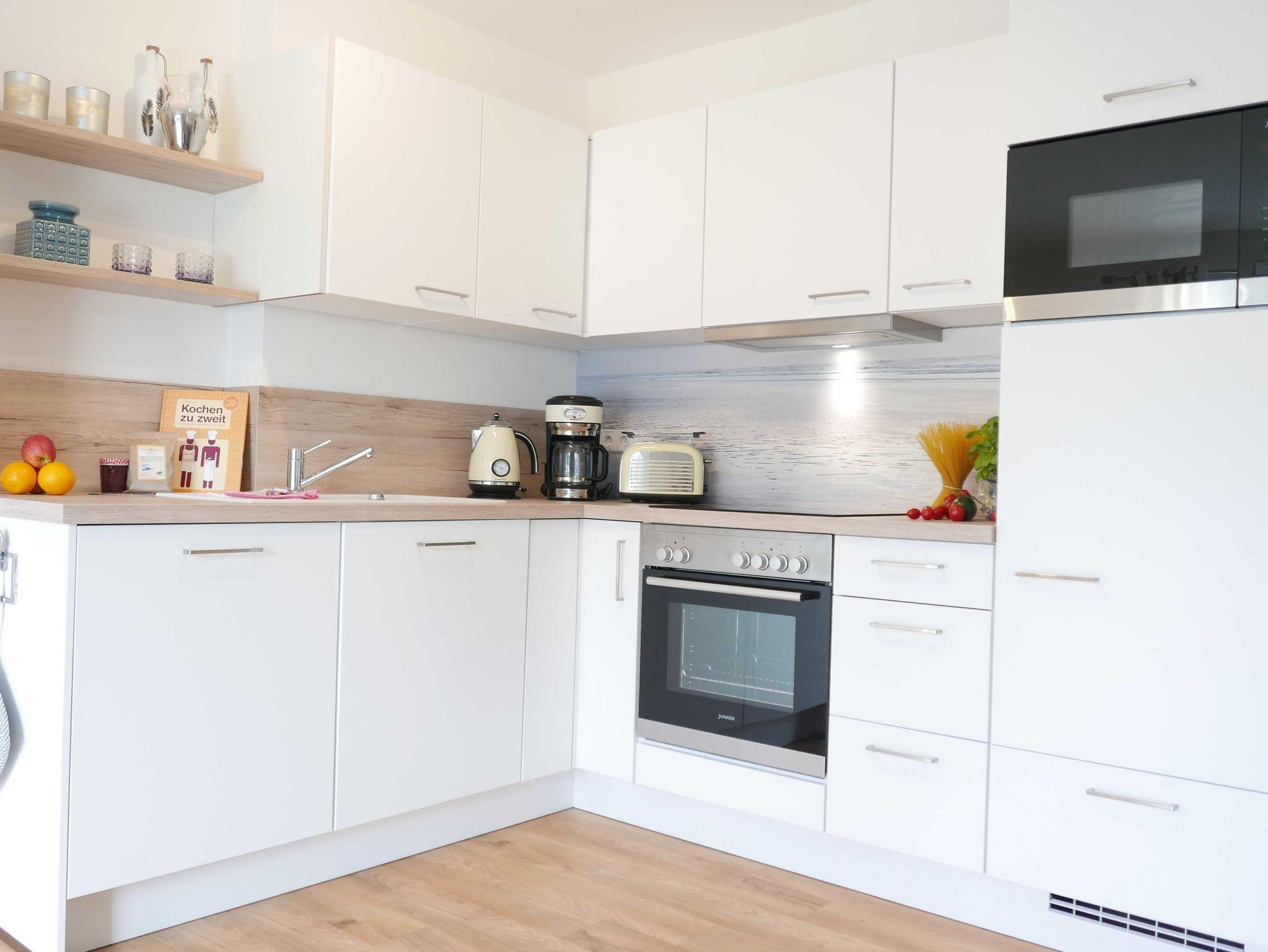 In der modernen Küchenzeile befindet sich ein Ceranfeld, ein Backofen, ein Kühlschrank mit Gefrierfach, eine Kaffeemaschine, ein Wasserkocher, ein Toaster, ein Rührgerät und diverse Kochutensilien.