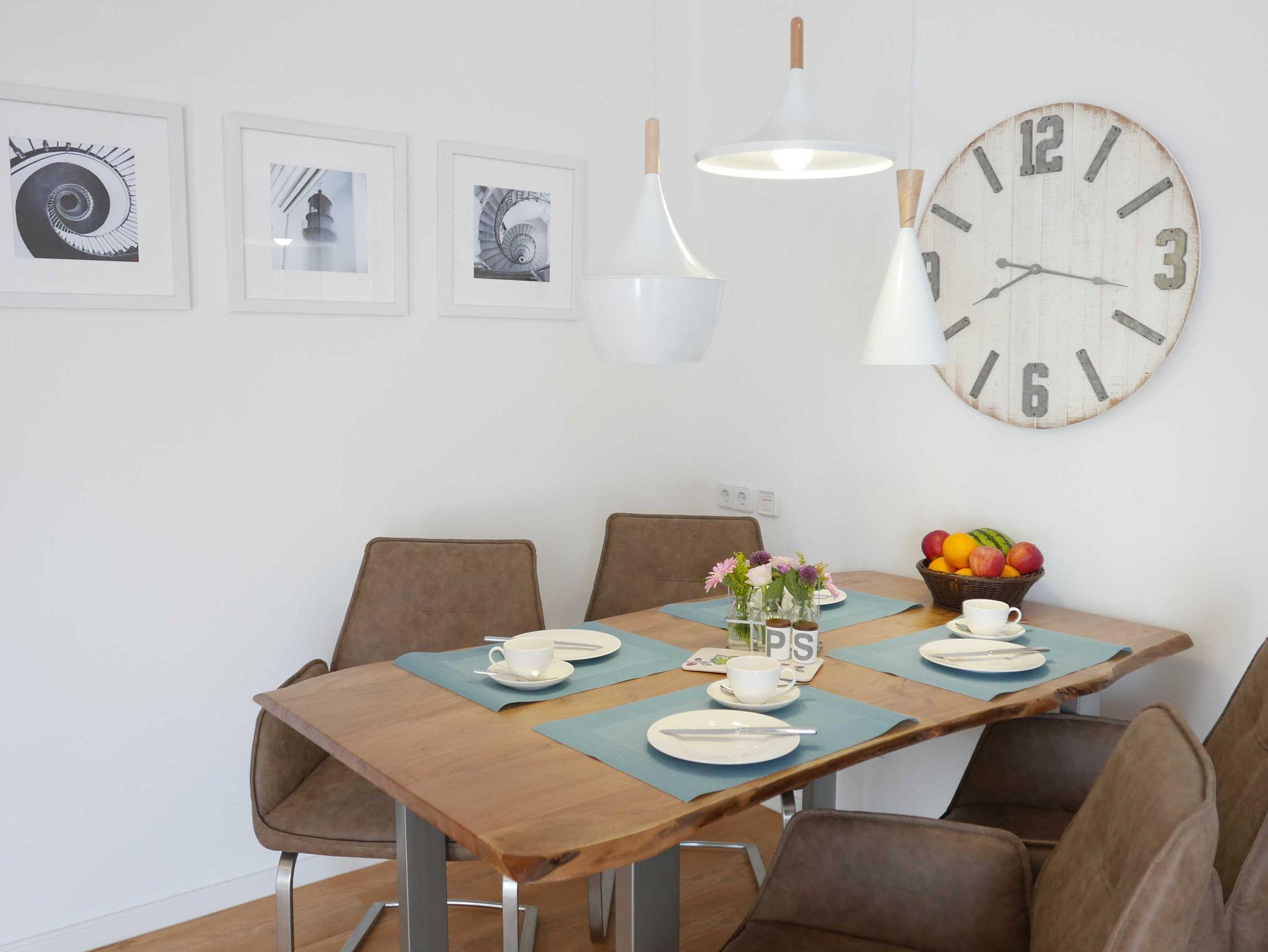 In dieser hellen und freundlichen 3-Zimmer-Ferienwohnung bleiben keine Wünsche offen! Liebevoll eingerichtet und mit maritimen Accessoires gespickt lässt sich der Urlaub auf 103qm in vollen Zügen genießen. Das großzügig und hochwertig ausgestattete Wohn-/Esszimmer bietet sowohl einen Essbereich als auch einen gemütlichen Sofabereich.