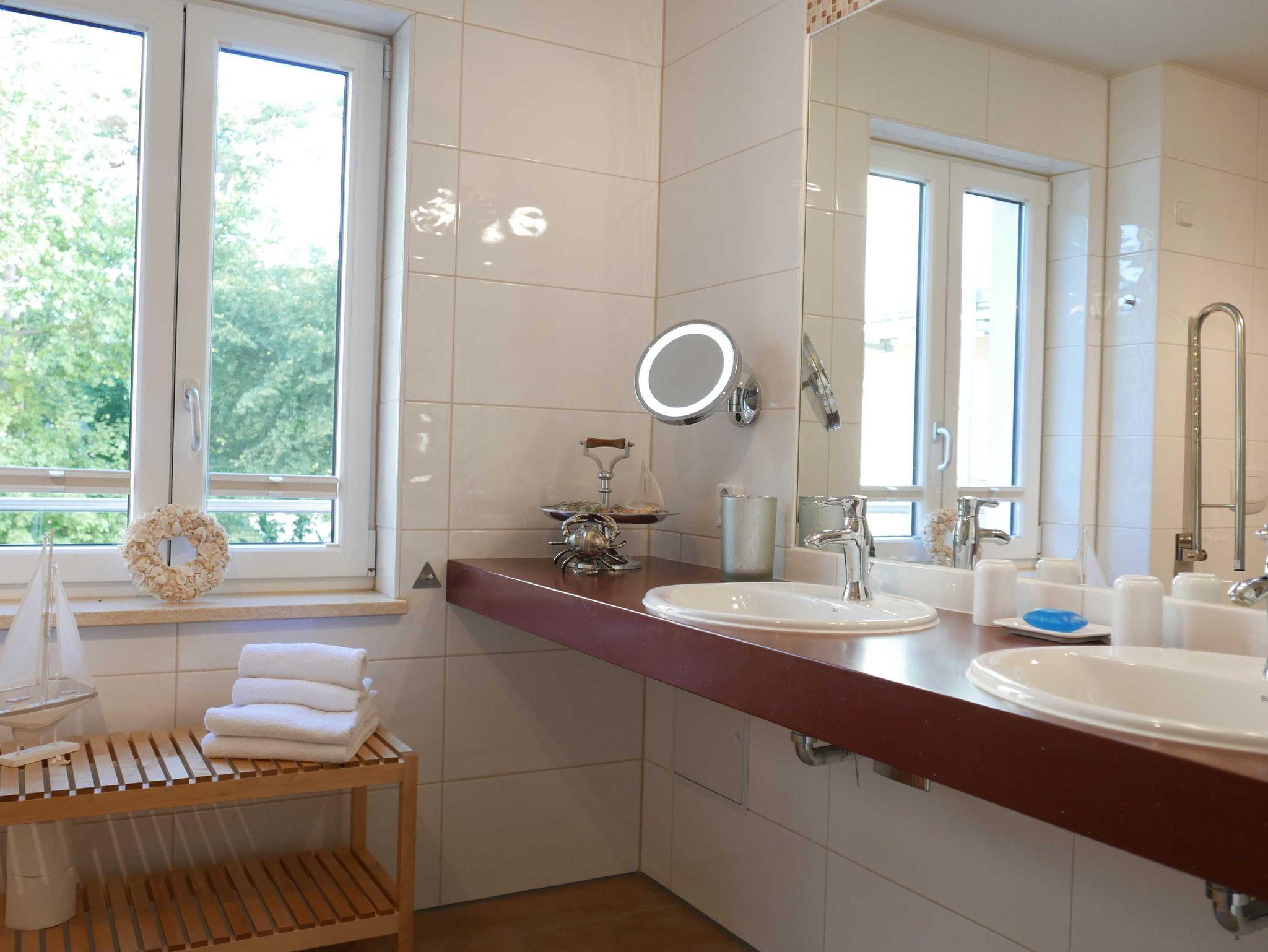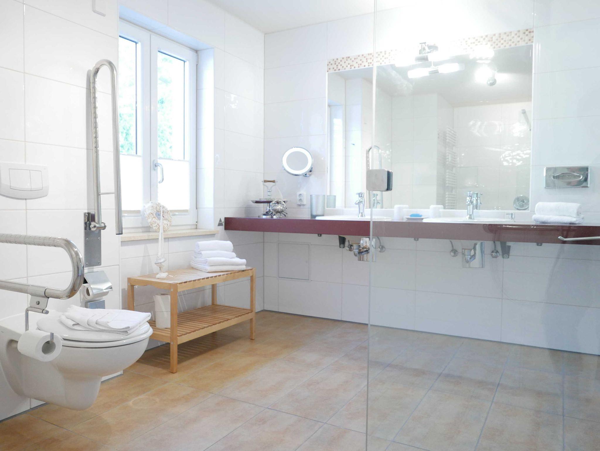 Das geräumige Bad verfügt über eine rollstuhlfreundliche Dusche, WC mit Haltegriffen sowie 2 unterfahrbare Waschtische.