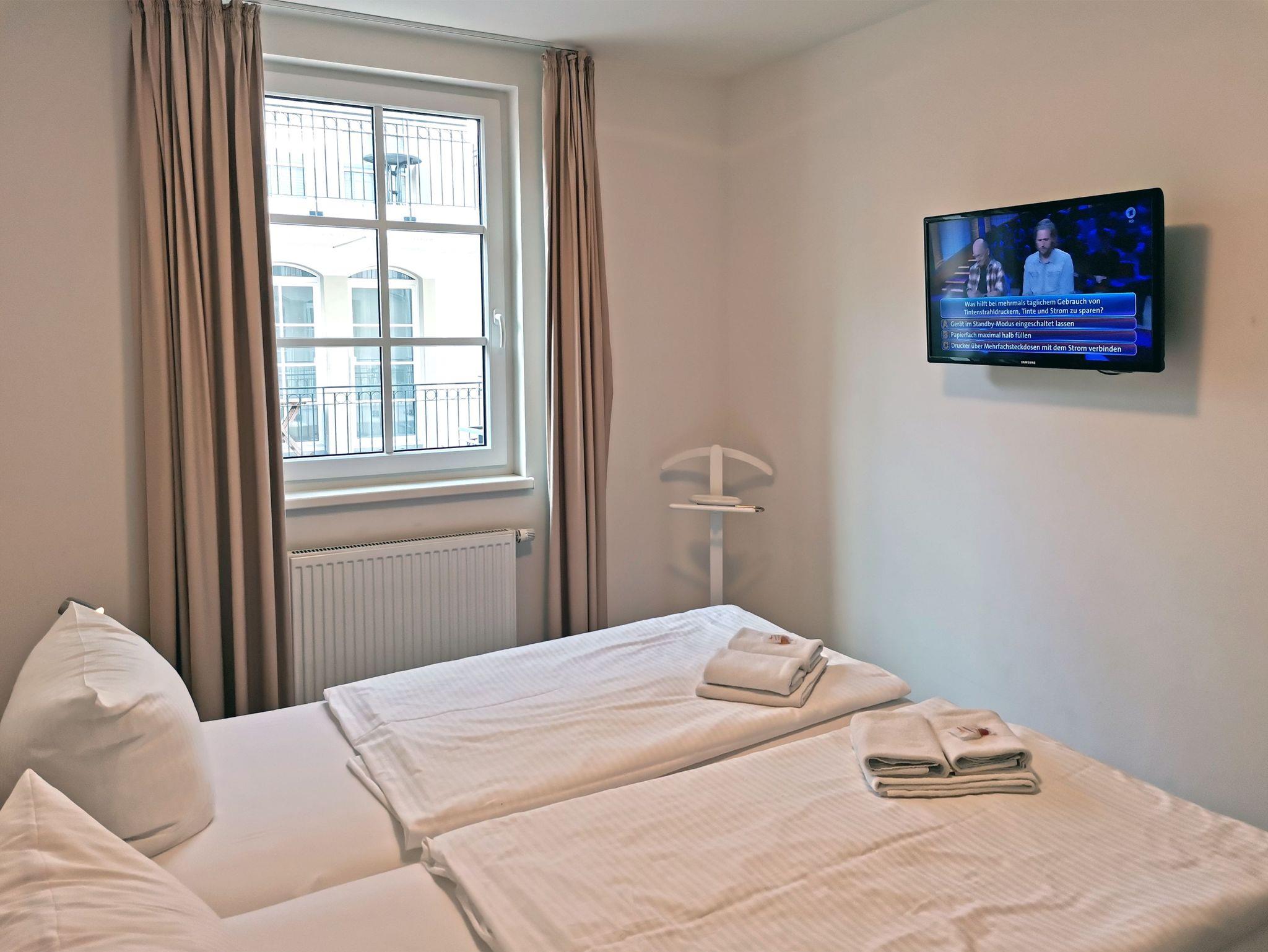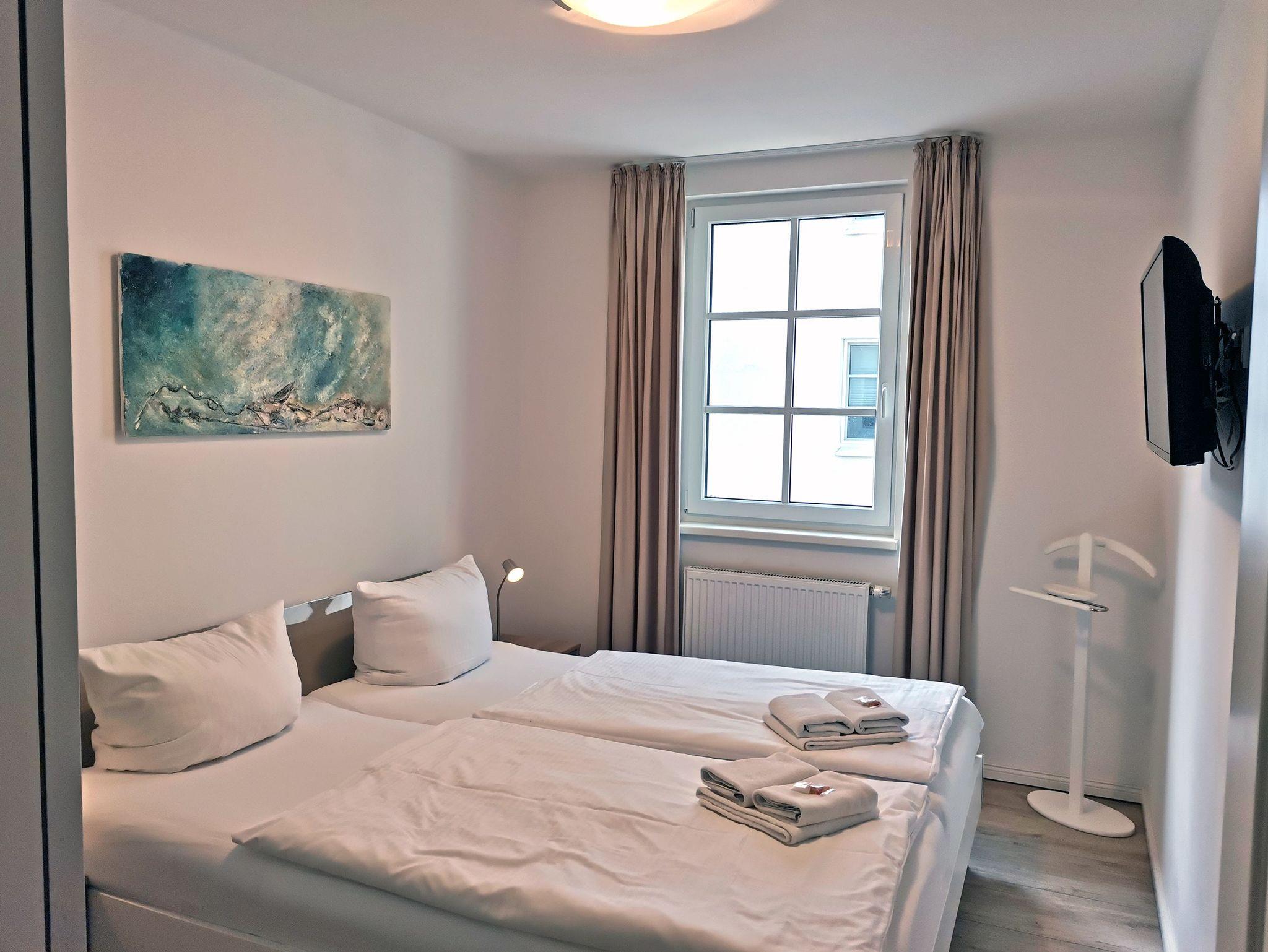 Kompletteinrichtung für bis zu 4 Personen: In der Ferienwohnung Gezeiten haben Sie 2 separate Schlafzimmer zur Verfügung - eines mit einem Doppelbett, Kleiderschrank und zweitem Fernseher. Im zweiten Schlafzimmer befindet sich ein Doppelschlafsofa (140x200).