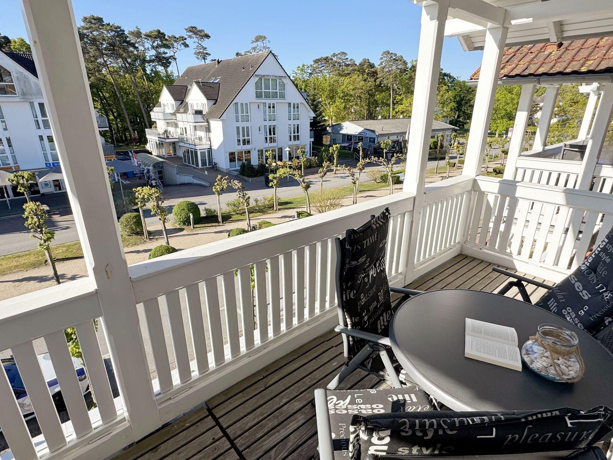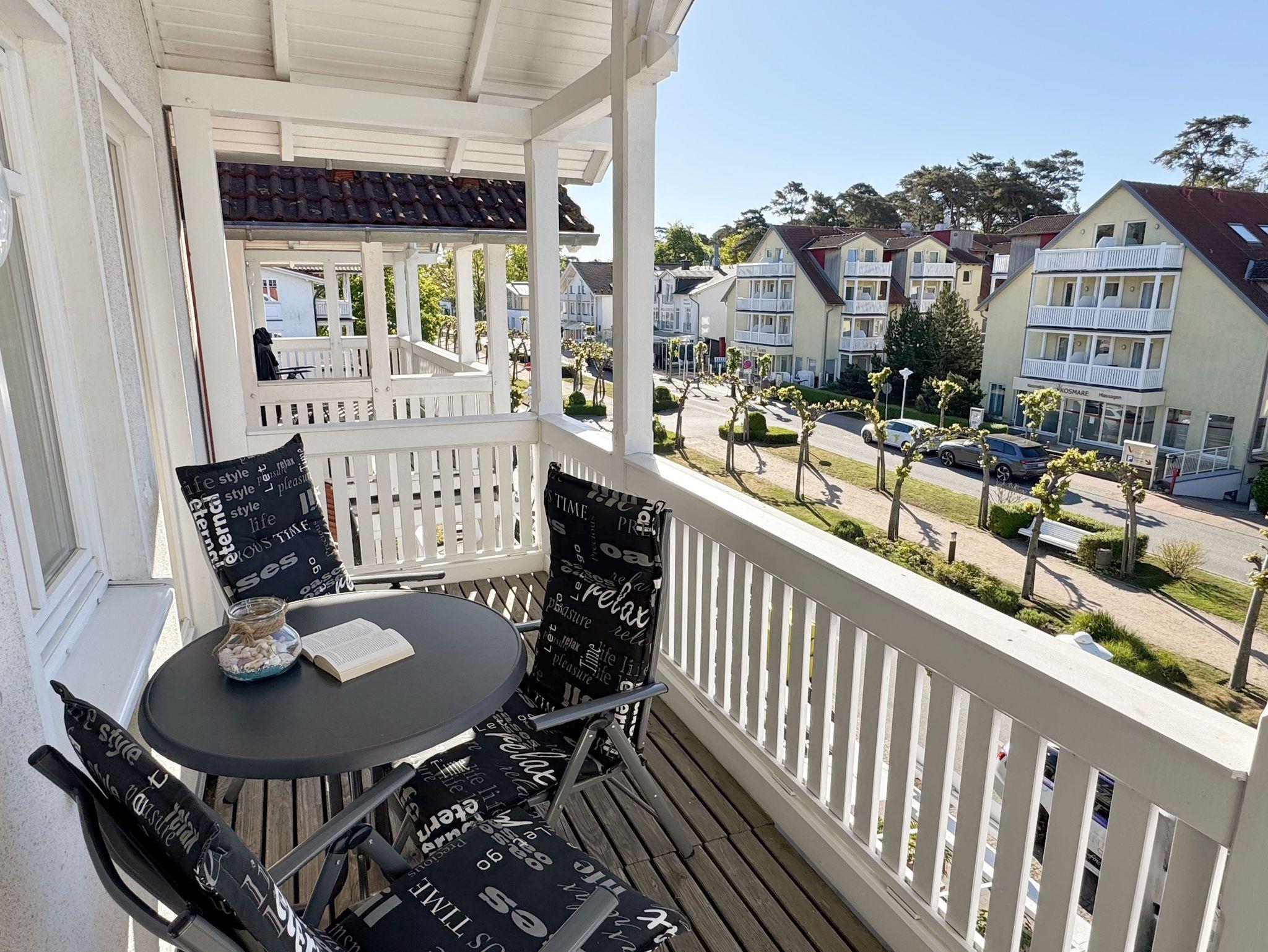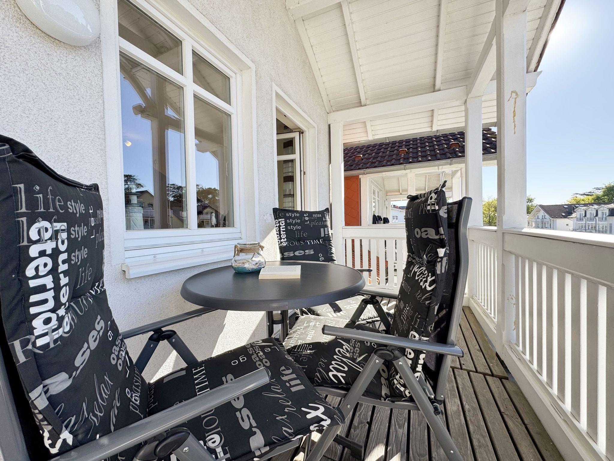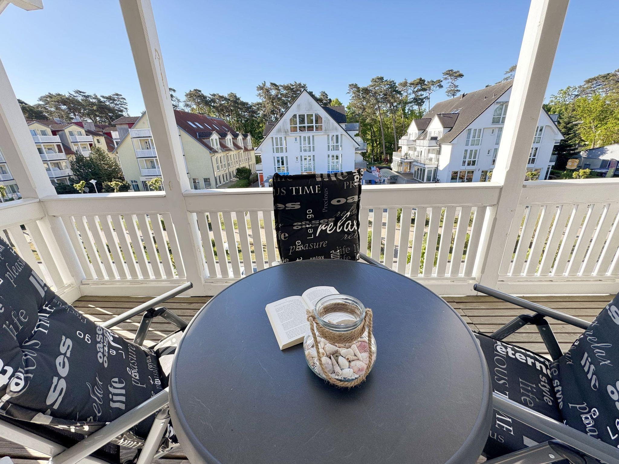 Die ca. 50 m² große gemütliche Ferienwohnung befindet sich im Dachgeschoss. Es ist eine komfortable Nichtraucherwohnung für 2 bis 3 Personen. Die Wohnung hat einen kombinierten Wohn-, Küchen- und Essbereich, einen Flur, ein Schlafzimmer und ein Bad. Die moderne Küchenzeile verfügt über ein Cerankochfeld mit Backofen und Abzugshaube, Kühlschrank mit Gefrierfach, Geschirrspüler, Mikrowelle, Kaffeemaschine, Senseo Padmaschine, Wasserkocher, Eierkocher, Toaster und weitere Küchenutensilien. Im Wohnbereich steht eine Couch mit Schlaffunktion und einer Liegefläche von 2,00 m x 1,60 m, die komplett mit Lattenrost und Federkern ausgestattet ist. Auf dem beleuchteten Sideboard stehen ein Smart-TV, ein DVD-Player und eine kleine Stereoanlage mit CD-Spieler und DAB-Radio. Zum Essbereich zählt ein Tisch mit 4 komfortabel und gepolsterten Stühlen. Der nach Süden ausgerichtete Balkon ist vom Wohn- sowie vom Schlafbereich aus begehbar und verfügt über Balkonmöbel sowie einen Wäscheständer. Dort kann der Tag mit dem Blick über die Promenade der Strandstraße beim Frühstück beginnen oder bei einem Glas Wein ausklingen. Im Schlafbereich stehen ein Doppelbett mit 2 Matratzen je (0,90m x 2,00m) mit Nachttischkonsolen, TV sowie ein großer Kleiderschrank. Der Sanitärbereich wird durch eine Dusche, WC, Waschtisch und Haartrockner abgerundet Auch in Ihrem Urlaub brauchen Sie auf einen Internetzugang (WLAN) nicht verzichten, dieser ist vorhanden und inklusive. Der zur Wohnung gehörende PKW-Stellplatz Nr.06 befindet sich hinter dem Haus. Haustiere sind nicht erlaubt. Die Erstausstattung eines Wäschepaketes (komplette Bettwäsche, 1 Duschhandtuch, 1 kleines Handtuch) können Sie bis 14 Tage vor Anreise gegen einen Aufpreis dazu buchen oder durch eigene ergänzen. Ab 2 gebuchten Paketen erhalten Sie einmalig 1 Geschirrhandtuch und 1 Duschvorleger hinzu.