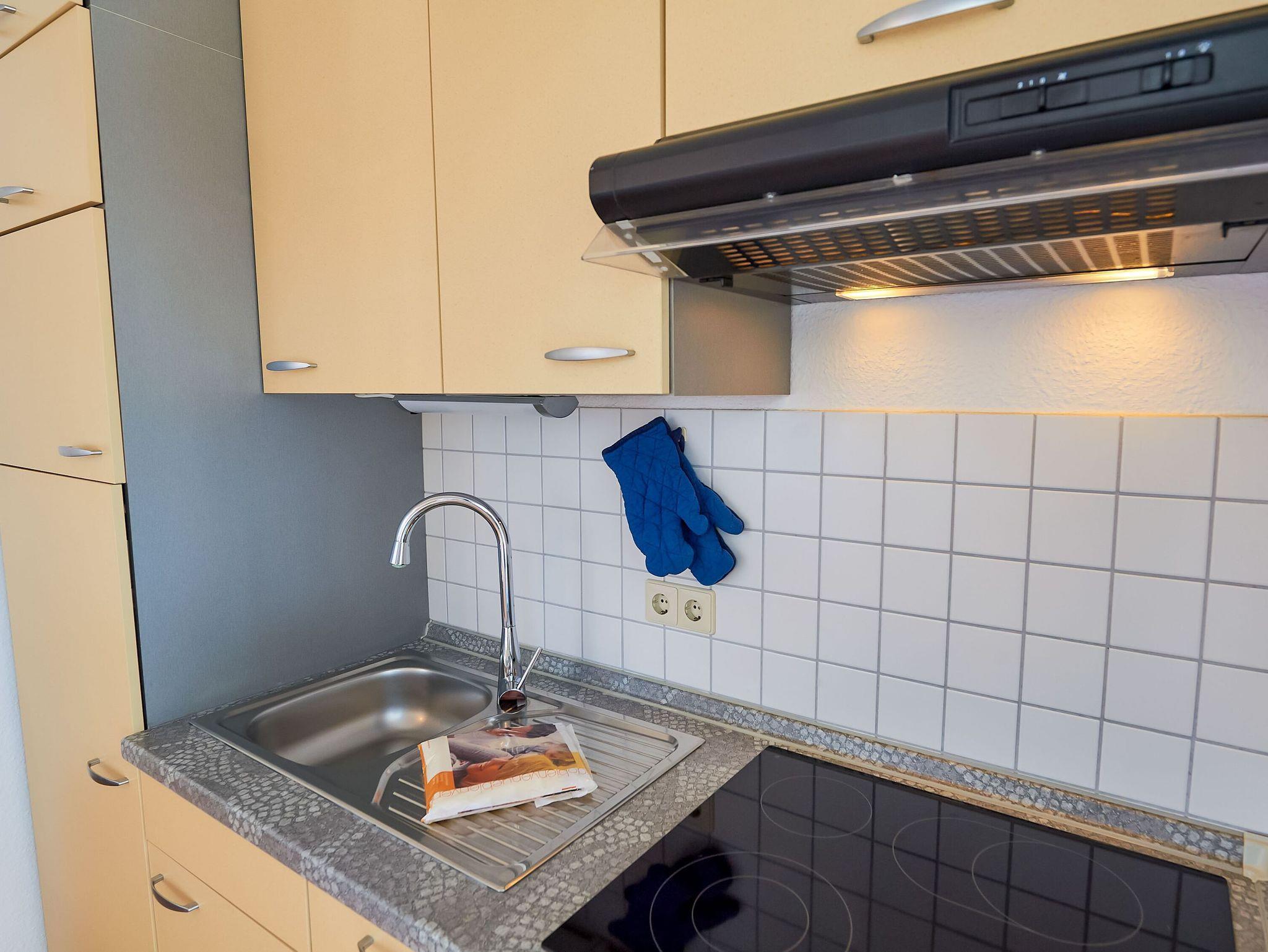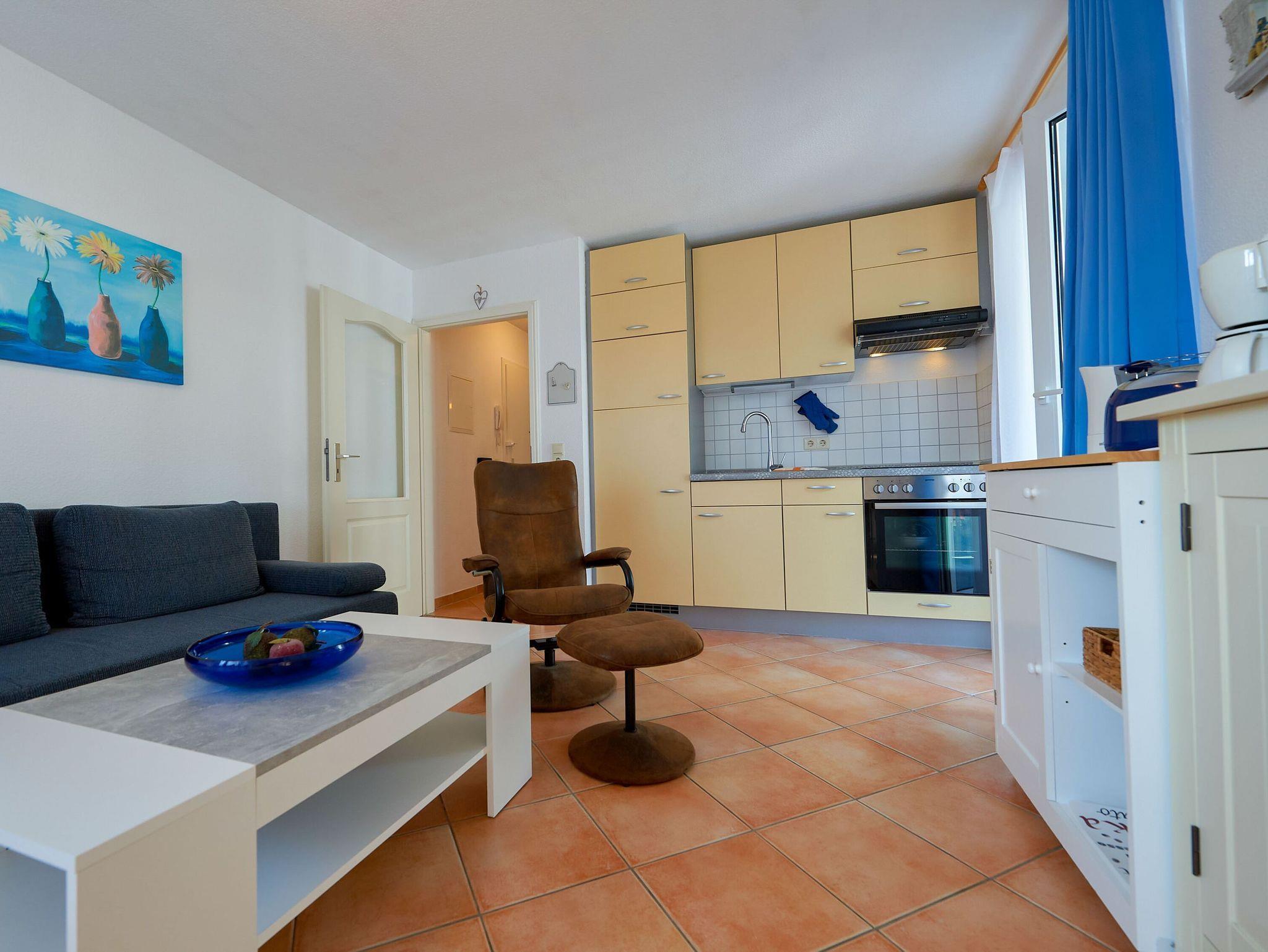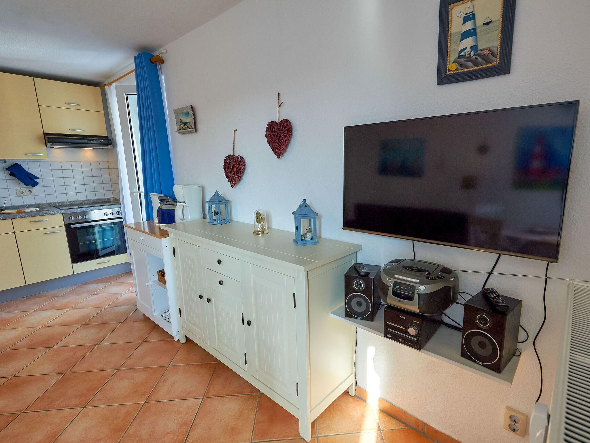 Das überaus geräumige Wohn-/Esszimmer ist mit einer gemütlichen Couch, einem Relaxsessel, einem Flachbild-TV, Internetradio, einer Essecke und einer Küchenzeile eingerichtet. Hier stehen Ihnen u.a. ein Ceranherd inkl. Backofen, ein Kühlschrank mit Gefrierfach, eine Filterkaffee- und eine Tassimo-Kaffeemaschine, ein Wasserkocher, ein Toaster und diverses weiteres Kleininventar zur Verfügung. Einen Bäcker für die frischen Brötchen am Morgen gibt es direkt im Haus, auch zum nächsten Einkaufsmarkt ist es nicht weit.