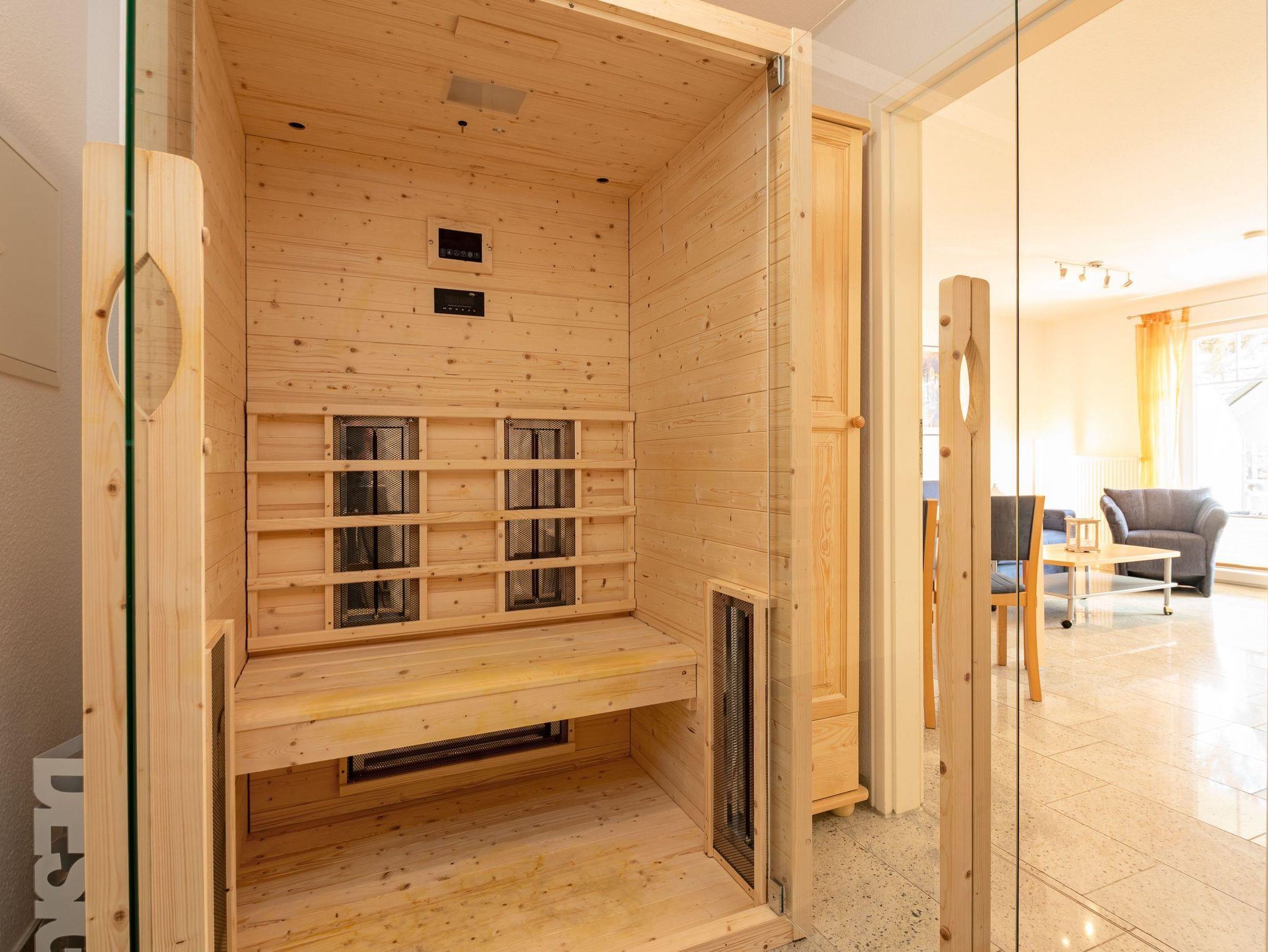 Besonderes Extra: Eine moderne Infrarotsauna befindet sich direkt in der Wohnung und lädt zum Entspannen in privater Atmosphäre ein der perfekte Ausklang nach einem Tag am Meer oder einer ausgedehnten Fahrradtour.