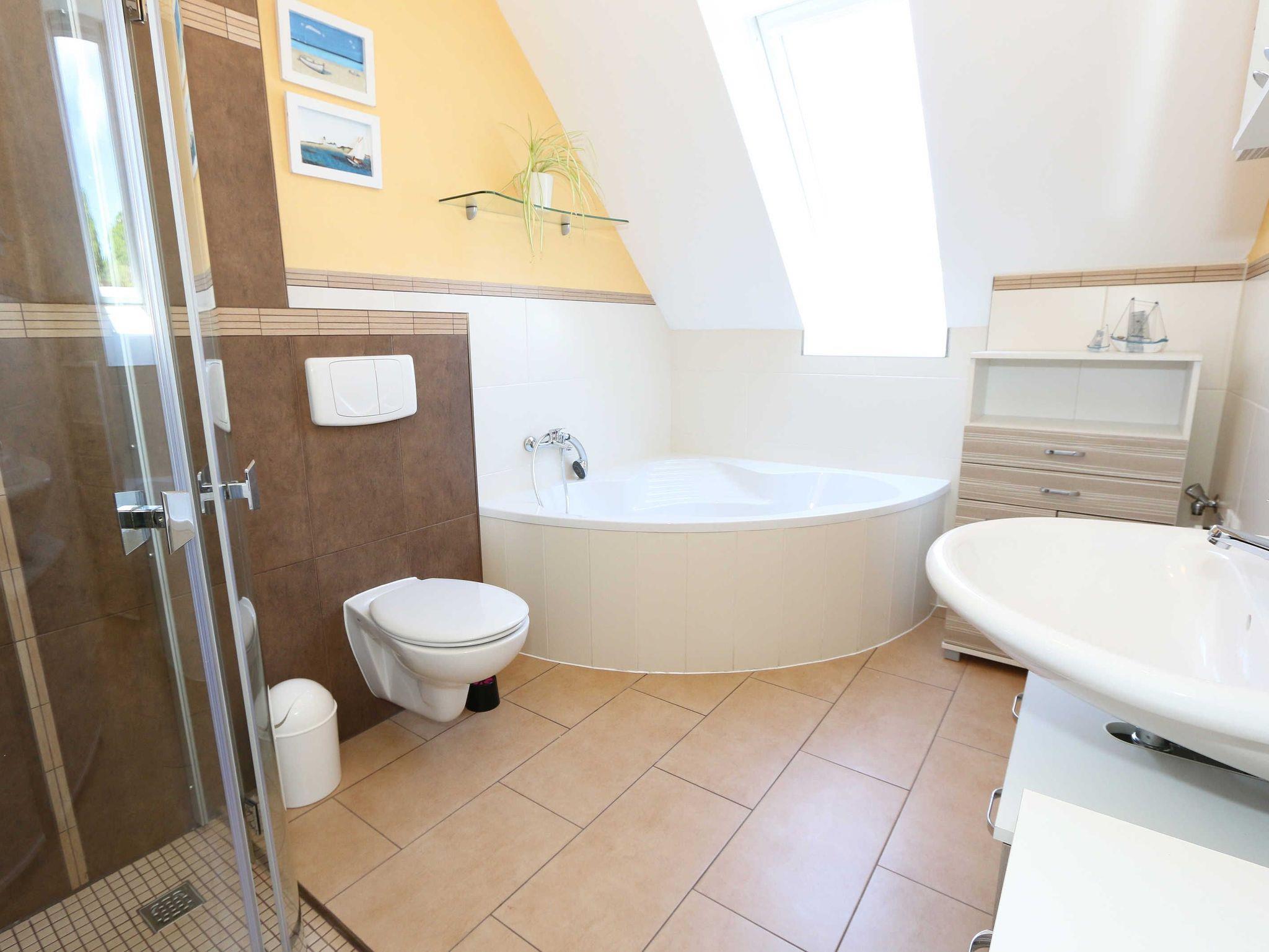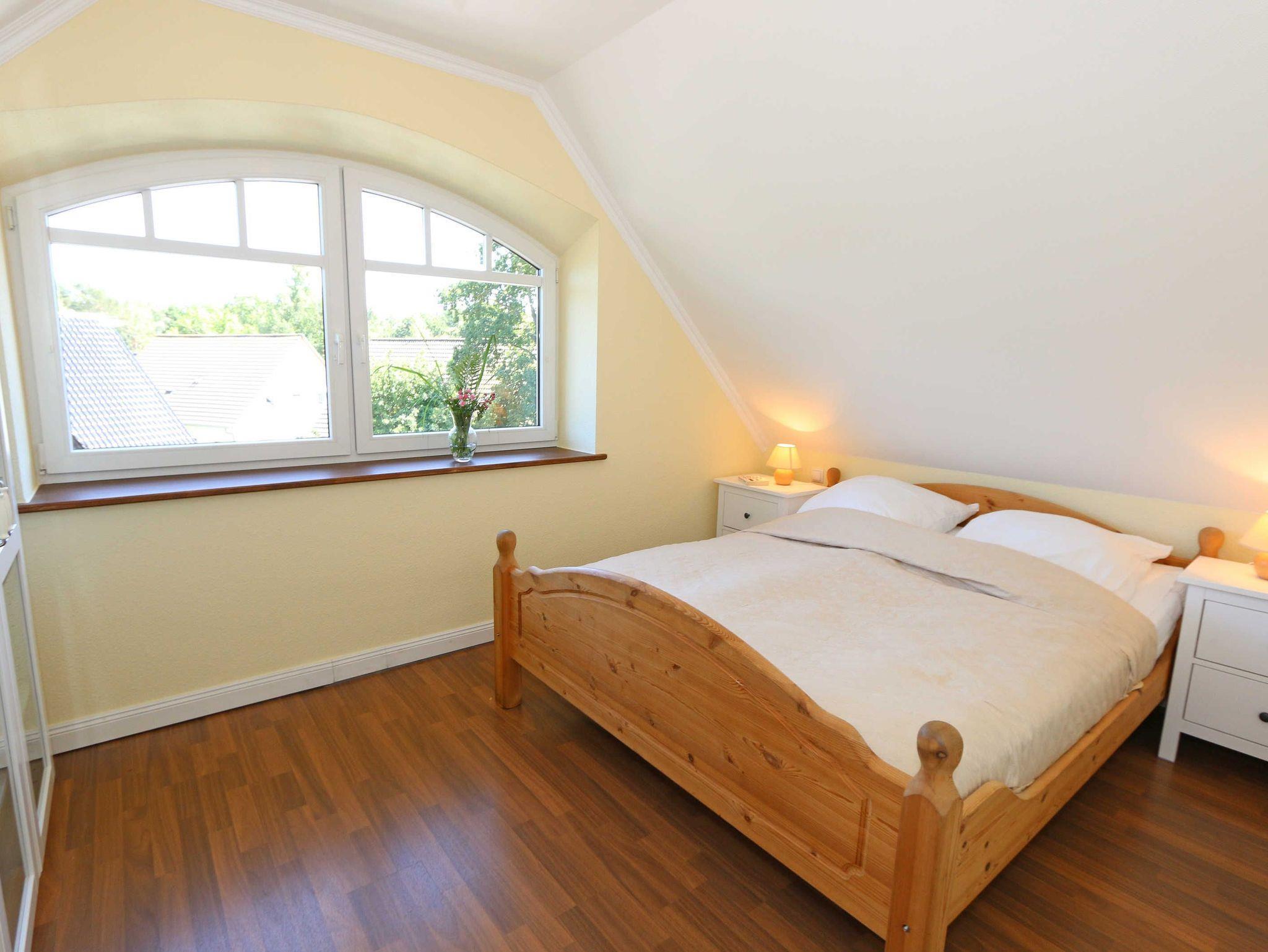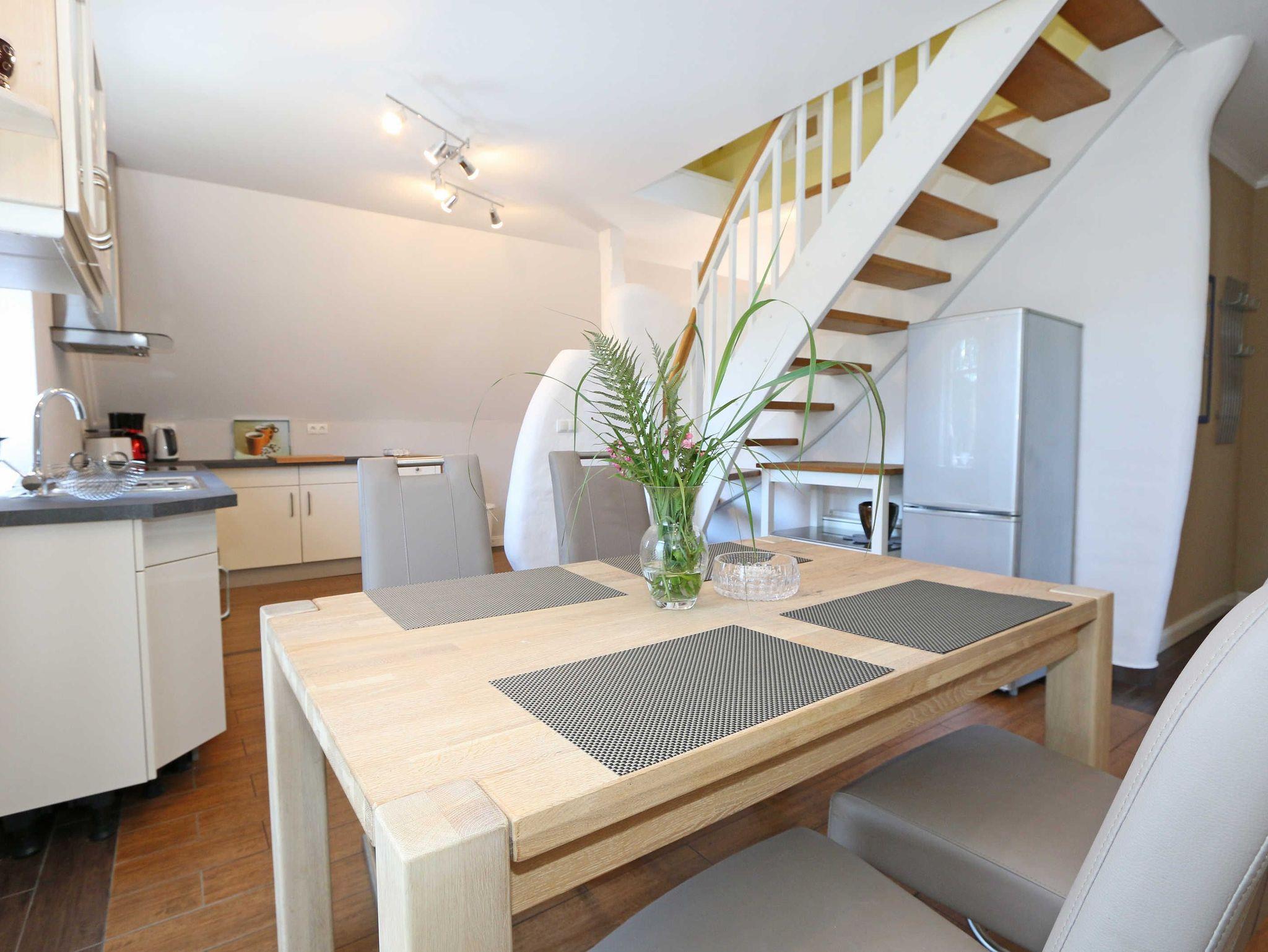 Die großzügige Nichtraucherferienwohnung 02, welche sich über 2 Etagen erstreckt, befindet sich in der 1. Etage des Hauses. Mit Ihren ca. 90 m² bietet Sie ausreichend Platz für max. 6 Erwachsene + 2 Kleinkinder bis 3 Jahre im Kinderreisebett. Auf einer Ebene befinden sich ein Schlafzimmer, ein großes Bad sowie die großzügige Küche mit angrenzendem Wohnbereich. Der gemütliche Wohnbereich umfasst eine große Couchecke mit Couchtisch, Leselampe, Sideboard, Smart-TV sowie eine Mini-Stereo-Anlage. An kühleren Tagen sorgt ein Kamin für Gemütlichkeit und Wärme. Auch auf einen Internetanschluss (WLAN) brauchen Sie im Urlaub nicht verzichten. Dieser ist inklusive für Sie. Von hier gelangen Sie auf den bestuhlten Süd/West Balkon. Die angrenzende und vollausgestattete Küche verfügt über einen Geschirrspüler, Backofen mit Ceranfeld und Abzugshaube, einen großen Kühlschrank mit Eisfach, Mikrowelle, Kaffeemaschine, Toaster, Wasserkocher und diverse Küchenutensilien. Ein Esstisch rundet diesen Bereich ab. Das 1. Schlafzimmer verfügt über ein Doppelbett (1,80 m x 2,00 m), verstellbare Lattenroste, Nachttischablagen, einen Kleiderschrank, Verdunklungsmöglichkeit sowie ein Smart-TV. Das großzügige Tageslicht-Bad umfasst eine Eckbadewanne, eine Dusche, ein WC, einen Waschtisch sowie einen Fön. Über eine Treppe vom Küchenbereich gelangen Sie in die obere Etage. Das 2. Schlafzimmer mit Dachschrägen verfügt über ein Doppelbett (1,80 m x 2,00 m), einen Kleiderschrank, Verdunklungsmöglichkeiten sowie einen Schreibtisch. Das 3. Schlafzimmer verfügt über ein Doppelbett (1,60 m x 2,00 m), verstellbare Lattenroste, Nachttischablagen, einen Kleiderschrank, Verdunklungsmöglichkeiten sowie einen Smart-TV. Ein Gäste-WC mit kleinem Waschbecken rundet die obere Etage ab. Alle Räumlichkeiten wurden mit Fliesen sowie einer Fußbodenheizung ausgestattet. Mit einem eigenen und mitgebrachten Schlafplatz sind max. 2 Haustiere gegen eine Gebühr gern gesehene Gäste. Ihre mitgebrachten oder auch geliehenen Fahrräder können Sie im Schuppen unterstellen. Im separaten Waschhaus können Sie gegen eine Kasse des Vertrauens eine Waschmaschine und einen Trockner nutzen. Ein PKW-Stellplatz mit Ladestation befindet sich direkt am Haus. Die Erstausstattung eines Wäschepaketes (komplette Bettwäsche, 1 Duschhandtuch, 1 kleines Handtuch) können Sie bis 14 Tage vor Anreise gegen einen Aufpreis dazu buchen oder durch eigene ergänzen. Ab 2 gebuchten Paketen erhalten Sie einmalig 1 Geschirrhandtuch und 1 Duschvorleger hinzu.