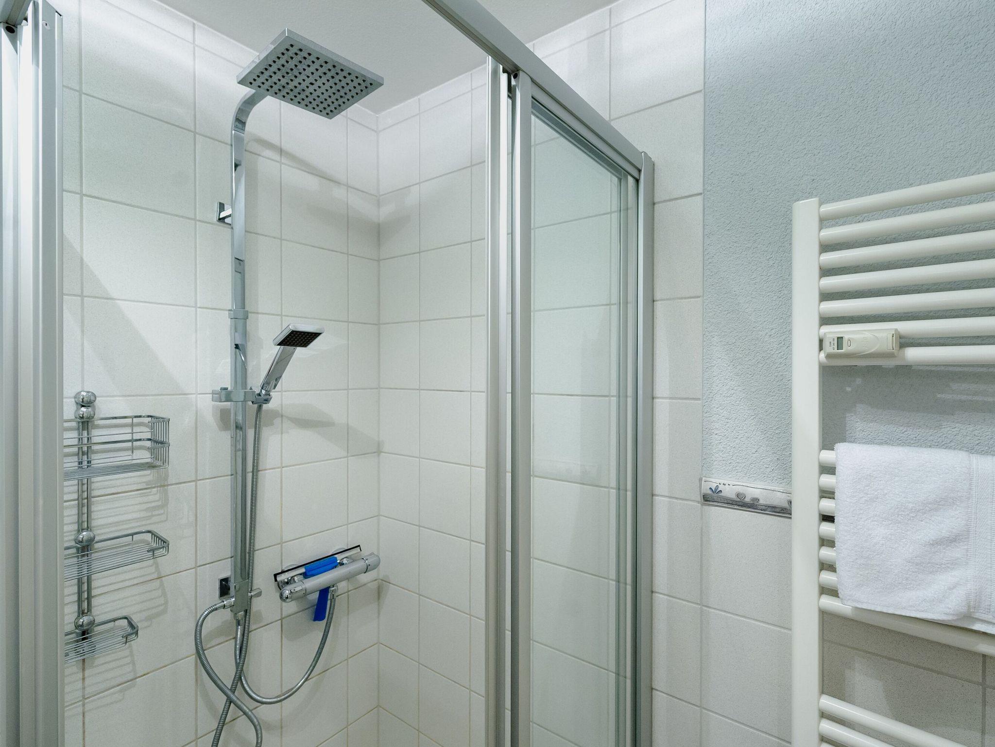Das geflieste Badezimmer Ihres Urlaubsdomizils überzeugt mit Dusche/WC, einem beleuchteten Waschtisch, Fußbodenheizung und Fön. Für die Urlaubswäsche zwischendurch stehen im Untergeschoss des Hauses eine gemeinschaftlich nutzbare Waschmaschine sowie Bügelutensilien bereit. Die Nutzung ist kostenfrei.
