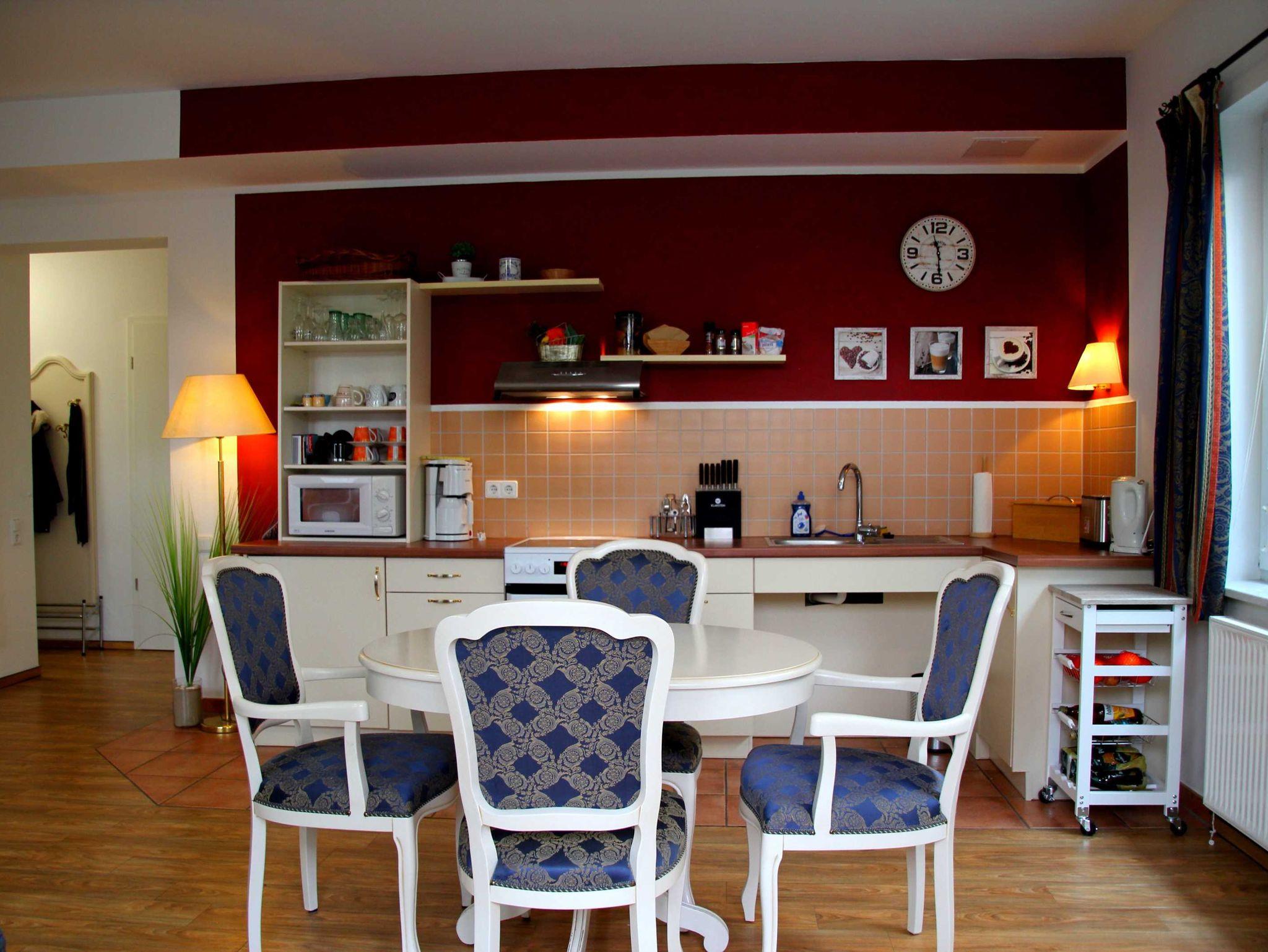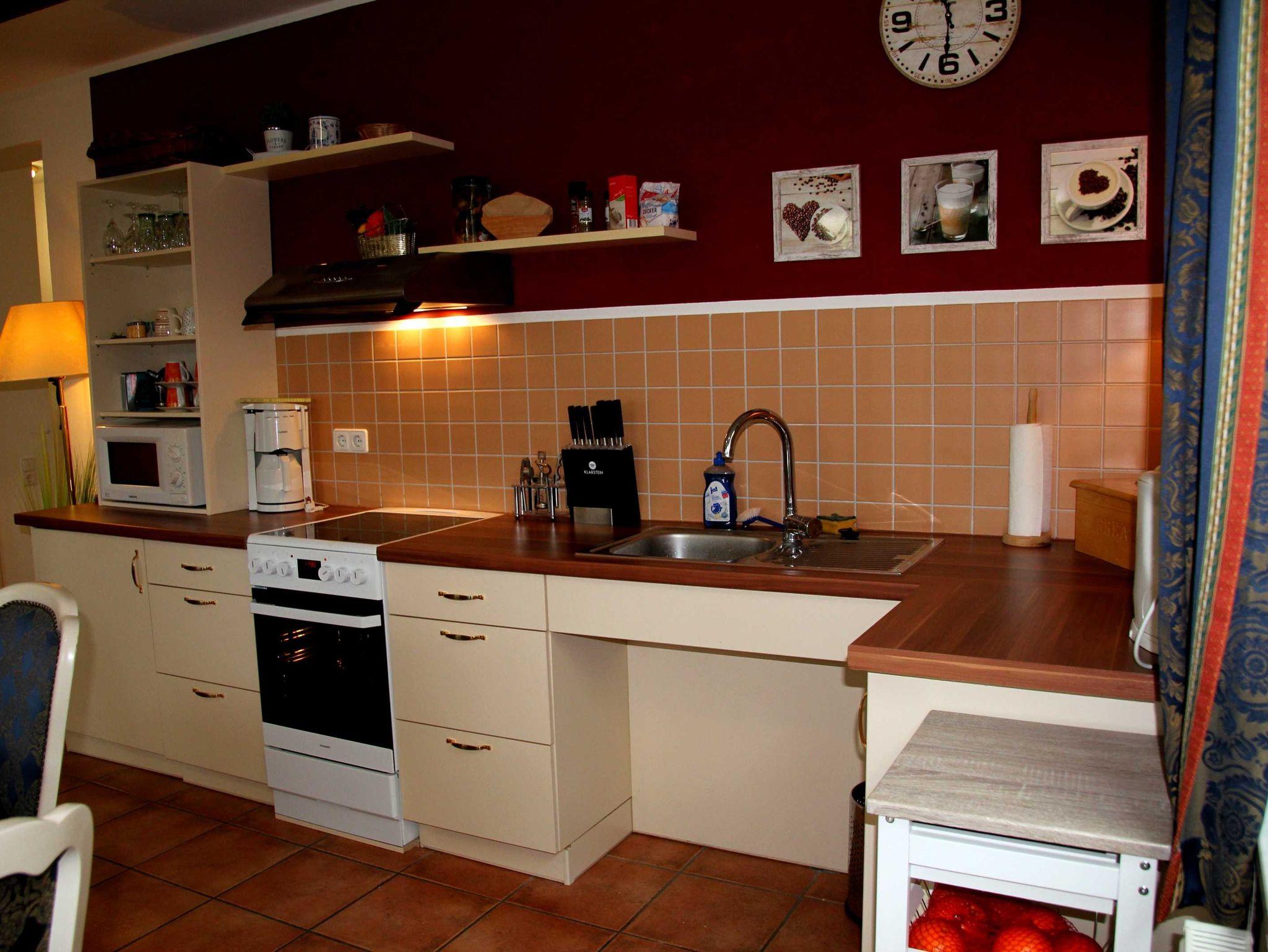 Zur Ferienwohnung gehört eine voll ausgestattete Küchenzeile mit 4er Ceranfeld und Backofen, Mikrowelle, Toaster, Wasserkocher, Kaffeemaschine, Geschirr, Besteck, Töpfen und Pfannen, sodass einer Selbstversorgung nichts im Wege steht. Eine integrierte Waschmaschine mit Wäscheständer ermöglicht zusätzlich Flexibilität vor Ort. Schminkspiegel und Haartrockner sind im Bad vorhanden. Mit Tisch und Stühlen auf der Terrasse können Sie ab Nachmittags bis in den Abend hinein die Tage in der Sonne angenehm ausklingen lassen.