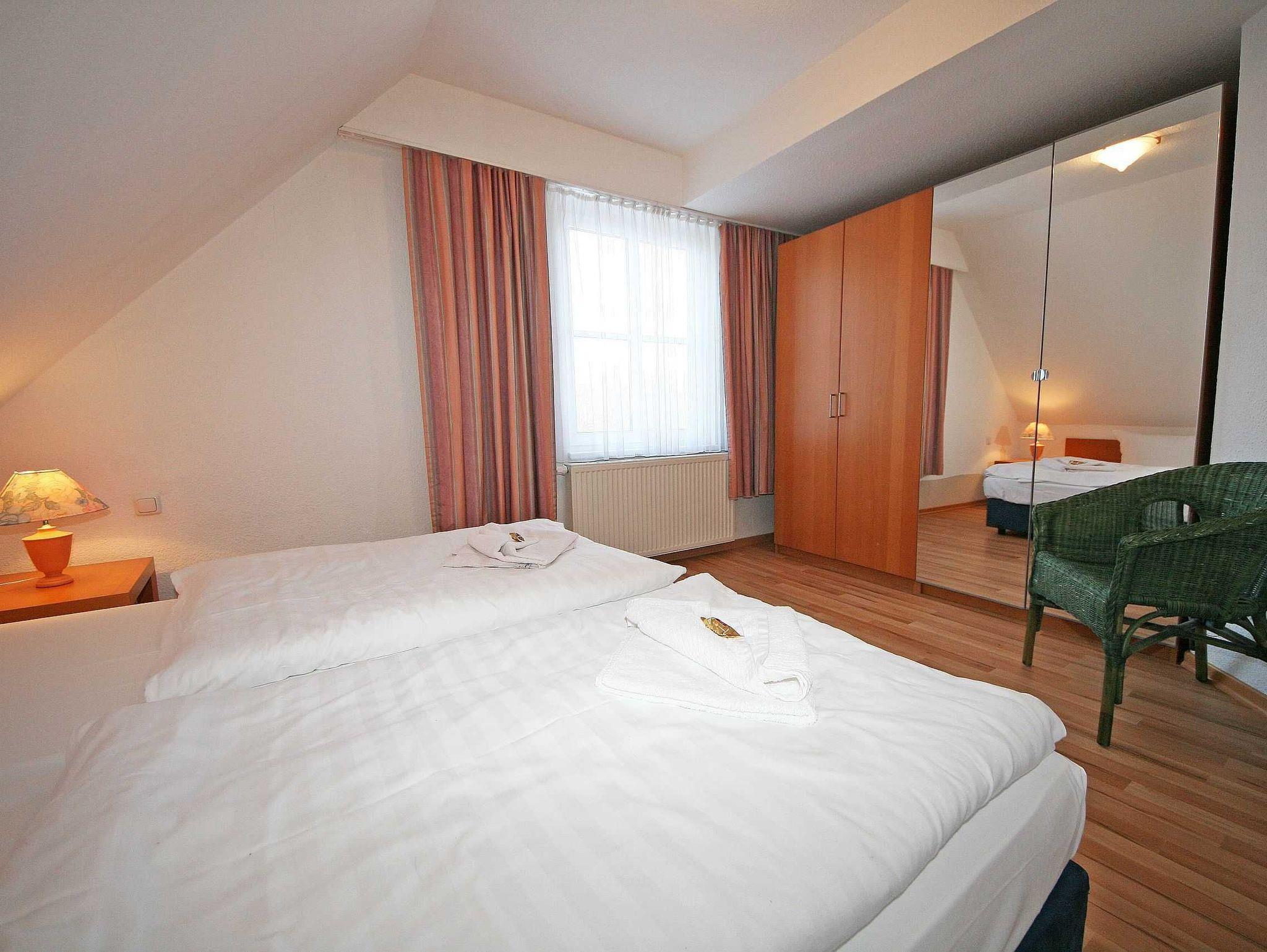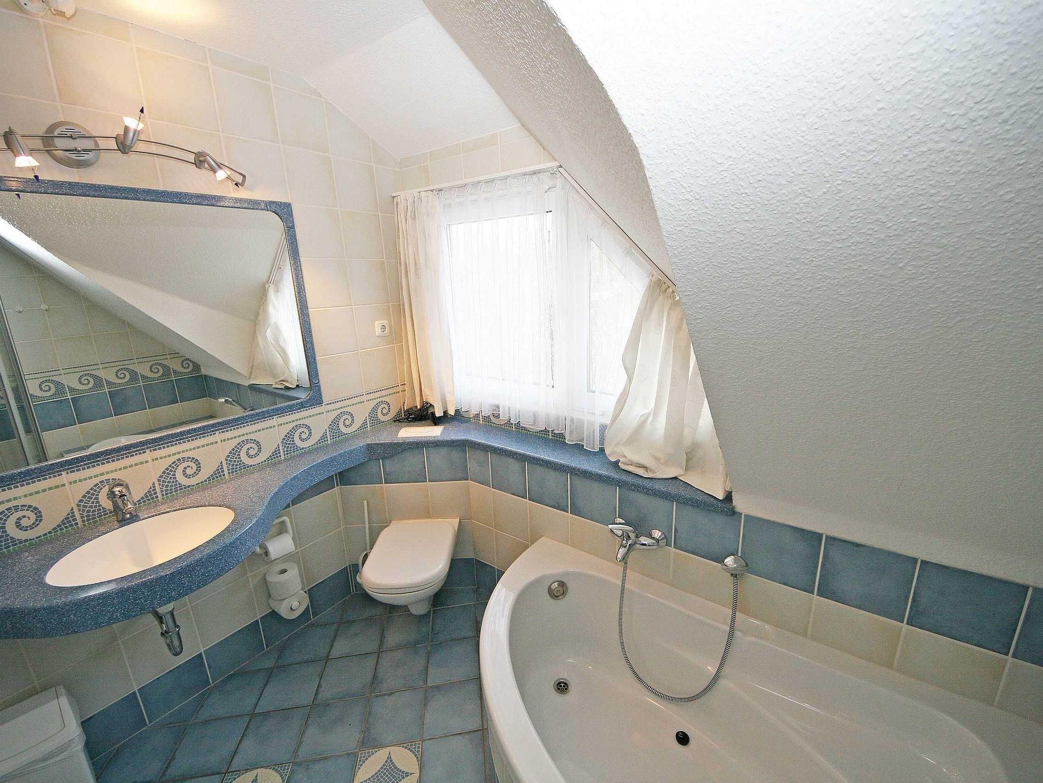 Die gemütliche und komfortable 3-Raum-Nichtraucherwohnung ist eine Maisonette mit ca. 65qm Wohnfläche und befindet sich in der 1. Etage. Sie bietet ausreichend Platz für 5 Erw. + 1 Kleinkind bis 3 Jahre im Kinderreisebett. Die im Rügener Stil behaglich eingerichtete Ferienwohnung bietet einen großzügigen Wohn- Essbereich die über eine komplett eingerichtete Küchenzeile mit Geschirrspüler, Backofen, 4 Herdplatten, Kaffeemaschine, Toaster, Wasserkocher sowie diverse Küchenutensilien verfügt. Angrenzend zum Wohnbereich haben Sie einen Esstisch mit Bestuhlung sowie eine Couch mit Couchtisch, einem Sideboard mit LCD Sat-TV in HD-Qualität für eine hohe Programmvielfalt, CD & DVD-Player mit Radio USB-Anschluss und SD-Kartenleser. Für gemütliche Abende sorgt der Kamin. Vom Wohnbereich gelangen Sie auf den überdachten im Bäderstil gehaltenen und bestuhlten Balkon (Richtung Süden). Das 1. Schlafzimmer befindet sich auf einer Ebene wie der Wohnbereich und verfügt über 1 Doppelbett (2x90x200 cm) mit Nachtischkonsolen und einen viertürigen Kleiderschrank. Durch die Großzügigkeit des Raumes, könnte man auch ein Kinderreisebett mit aufstellen. Das 2. Schlafzimmer im Dachgeschoss erreichen Sie durch eine Treppe im Wohnbereich, wo Sie 2 Einzelbetten (je 0,80m x 2,00m) welche Sie zusammenzustellen können, 1 Einzelbett (0,80m x 2,00m), ein Wandschrank sowie ein Schreibtisch. Beide Schlafzimmer sind abdunkelbar. Das geflieste Tageslicht-Bad bietet Ihnen eine Dusche, WC, Fön, einen Waschtisch sowie eine Badewanne. Auch im Urlaub brauchen Sie in der Wohnung nicht auf einen Internetanschluss (WLAN) verzichten. Dieser ist für Sie inklusive!!! In einem Gemeinschaftsraum können Sie eine Waschmaschine gegen eine Extragebühr nutzen (in den Monaten: November bis Ende März nicht im Betrieb). Ein Parkplatz Nr. 04 befindet sich vor dem Haus Rügenwelle und ist für Sie inklusive. Ihre mitgebrachten oder geliehenen Fahrräder können Sie auf dem Grundstück anschließen. Auf Wunsch kann auch 1x Kinderreisebett (mit Matratze, ohne Bett Inlett) / 1x Hochstuhl gestellt werden. 2 kleine Haustiere können gegen eine Gebühr dazu gebucht werden. Die Erstausstattung eines Wäschepaketes (komplette Bettwäsche, 1 Duschhandtuch, 2 kleine Handtücher) können Sie bis 14 Tage vor Anreise gegen einen Aufpreis dazu buchen oder durch eigene ergänzen. Ab 2 gebuchten Paketen erhalten Sie einmalig 1 Geschirrhandtuch und 1 Duschvorleger hinzu.