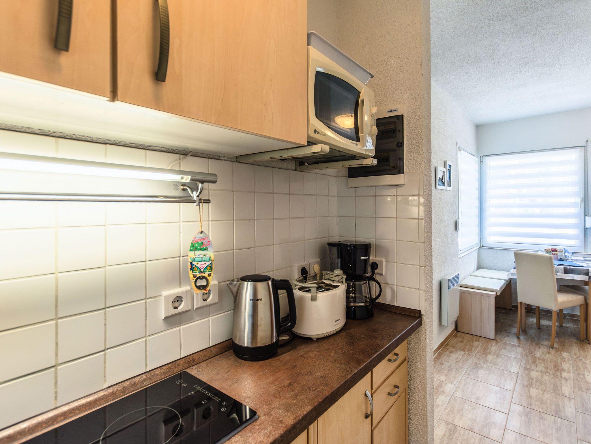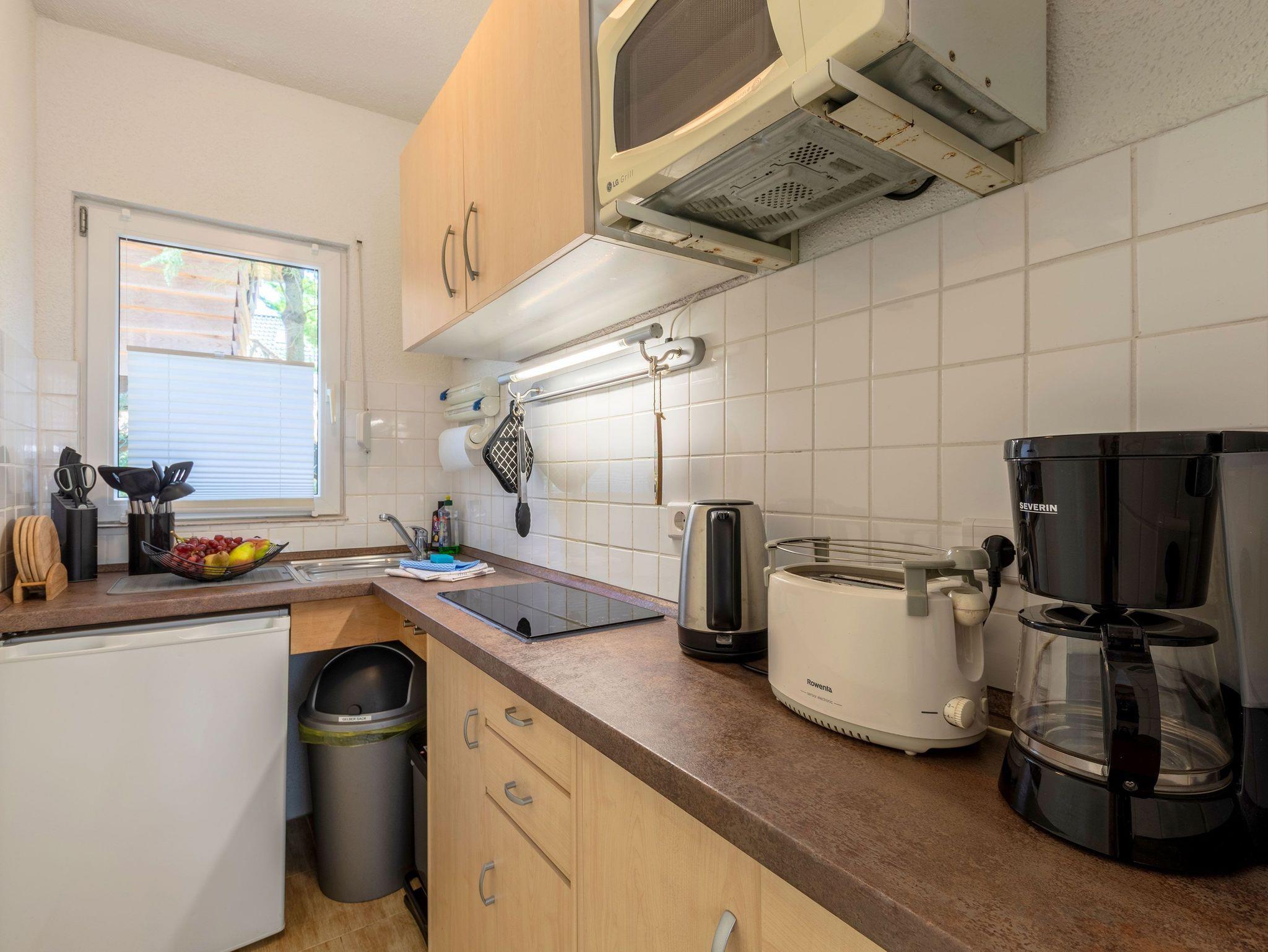 Die offene Küche ist mit einem kleinen Kochfeld, einem Kühlschrank, Kaffeefiltermaschine, Wasserkocher, Toaster sowie einer Mikrowelle ausgestattet. Ein kleiner Essbereich rundet das Gesamtangebot ab. Im Schlafbereich befindet sich ein Doppelstockbett, ein Einzelbett und ein Kleiderschrank.