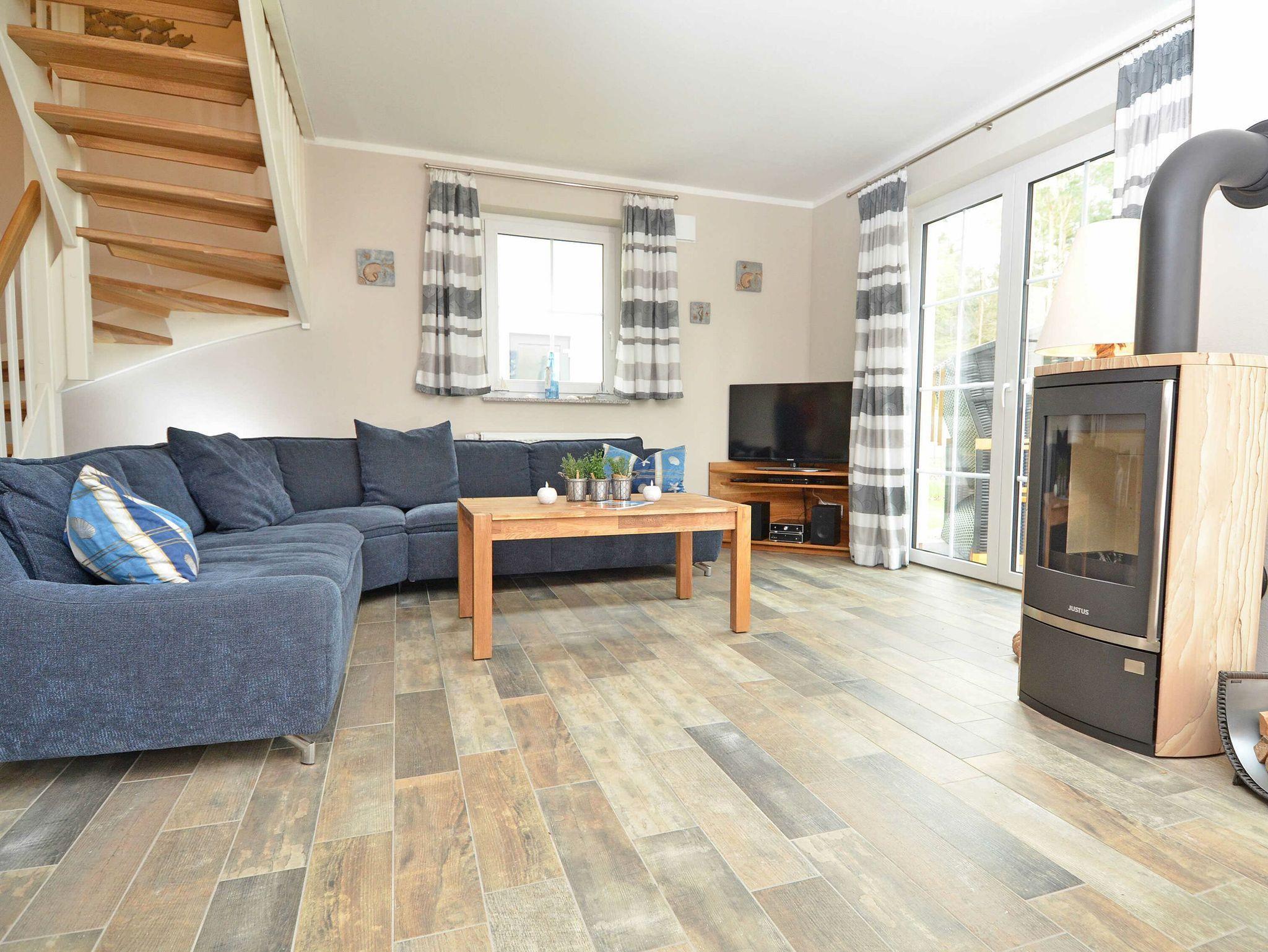 Im Erdgeschoss befindet sich das sehr geräumige, hochwertig eingerichtete Wohn- und Esszimmer mit einem großen Esstisch. Der Wohnbereich sorgt mit einer modernen Sitzecke und Möbeln aus Echtholz für viel Gemütlichkeit sowie mit einem Kamin für kuschlige Tage. Für den Kamin steht Ihnen kostenfrei Kaminholz vor Ort zur Verfügung. Für gute Unterhaltung nach einem erlebnisreichen Urlaubstag sorgt hier ein Flachbild-Fernseher, eine Musikanlage mit CD-, DVD-, USB- und IPod Anschluss.