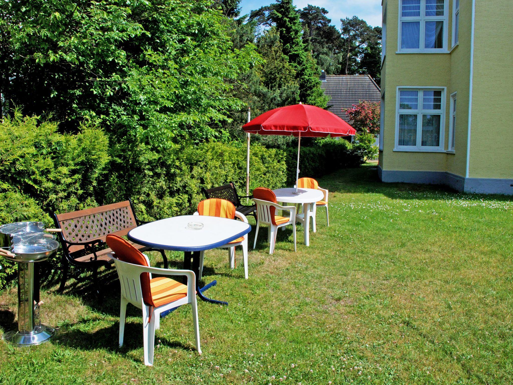 Hinter der Villa können Gäste dieser Ferienwohnung einen Platz mit Gartenmöbeln und Grillmöglichkeit mit nutzen.
