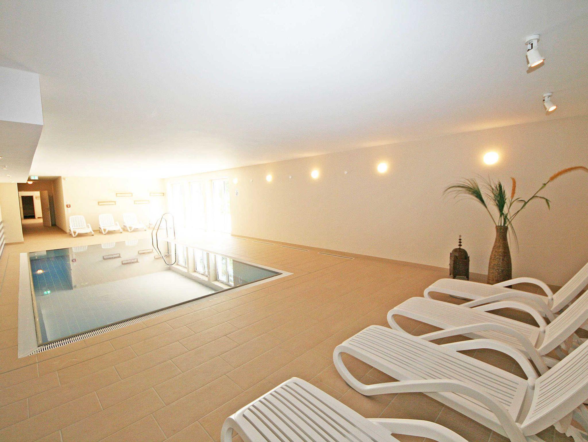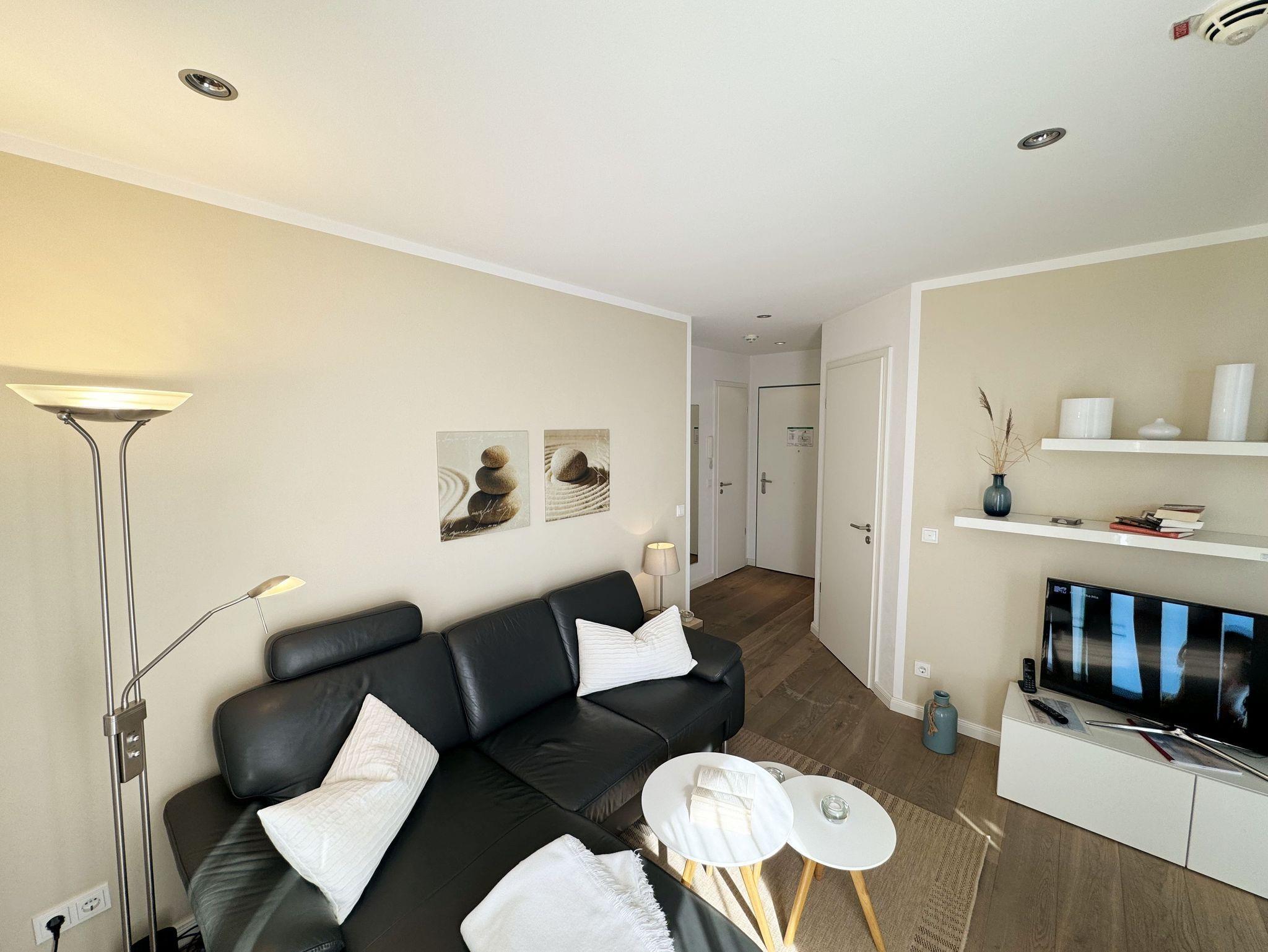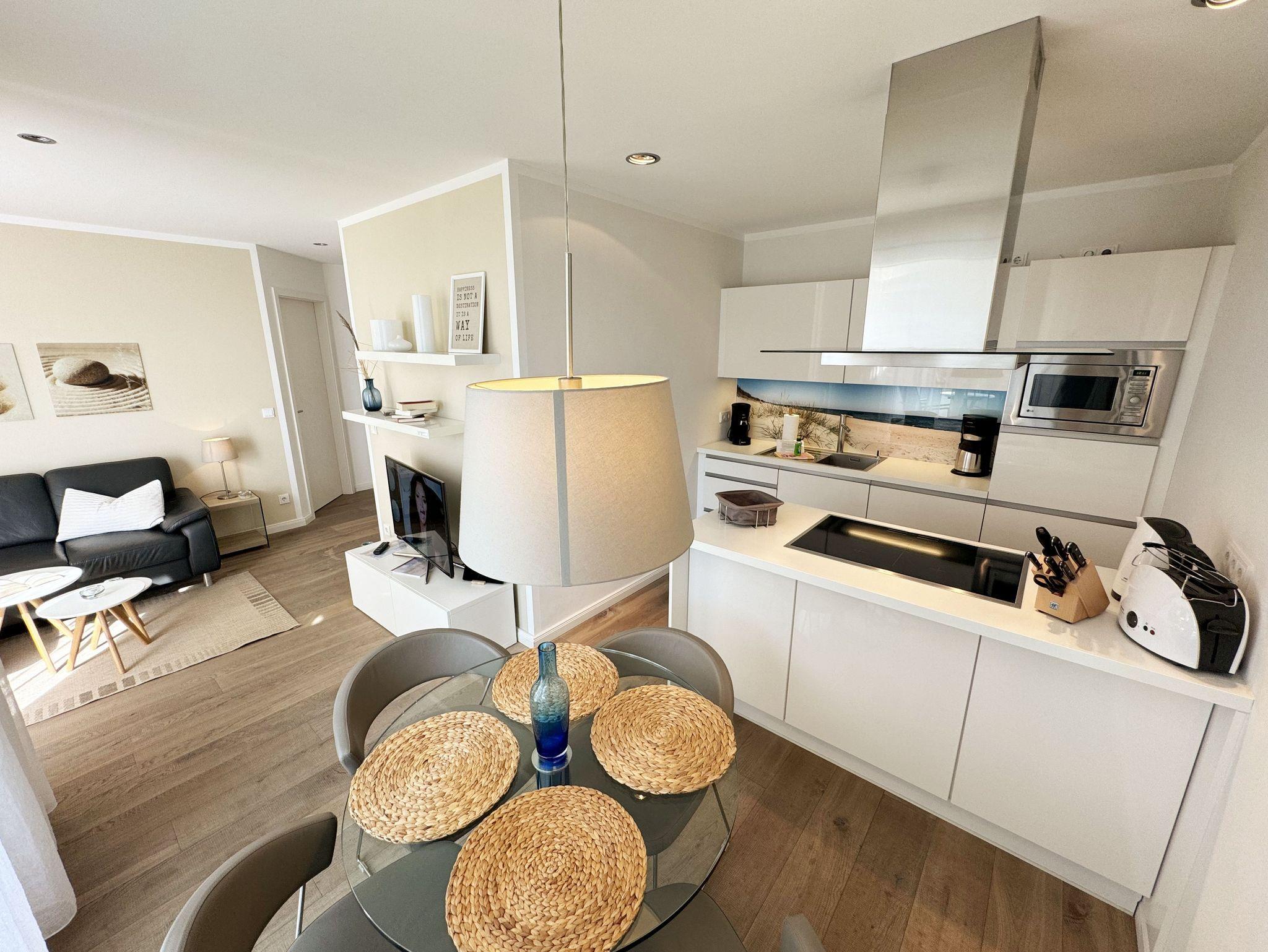 Herzlich willkommen in Ihrer Ferienwohnung direkt am Meer. Sie wohnen in einer Zweizimmerwohnung (Nichtraucher) mit ca. 45 Quadratmetern im obersten Stockwerk, welche exklusiv für max. 2 Personen ausgestattet ist. Neben Echtholzparkett, einer erstklassig eingerichteten Küche mit Kochinsel, Induktionsherd, Spülmaschine, Backofen, Mikrowelle, Kühlschrank auf Augenhöhe mit Gefrierfach, Wasserkocher, Toaster, Kaffeemaschine, Senseo Padmaschine und anderen praktischen Helfern, erwartet Sie ein Essplatz mit 4 Stühlen und Blick durch lichtdurchflutete bodentiefe Fenster ins Grüne. Im separaten Schlafzimmer mit Einbauschrank und einem komfortablen Doppelbett (1,80m x 2,00m) können Sie entspannt Ihrem nächsten Urlaubstag an der Ostsee entgegenträumen. Im Badezimmer finden Sie unter anderem eine bodentiefe Echtglasdusche, einen Kosmetikspiegel, einen Fön, einen Handtuchtrockner sowie eine Lichtkuppel, die diesen Raum schon ab dem frühen Morgen erhellt und so für Vorfreude auf den Urlaubstag sorgt. Ein weiteres Highlight ist die von außen nicht einsehbare, nach Westen ausgerichtete, Dachterrasse mit Bangkireiboden und Terrassenmöbeln. Genießen Sie hier den Sonnenuntergang mit Blick in die Baumwipfel. Vom Tiefgaragenstellplatz (Nr.112, Einfahrtshöhe 2,00m) gelangen Sie mit dem Aufzug bequem in das dritte Obergeschoss. Nun trennt Sie nur noch eine Treppe von der Endetage, in der Sie Ihre mit viel Liebe zum Detail eingerichtete Wohnung erwartet. Platz für Ihr Reisegepäck finden Sie im separaten Abstellraum, in dem Ihnen auch ein Safe für Ihre Wertgegenstände zur Verfügung steht. Zur elektronischen Ausstattung gehören ein Smart-TV, ein IPad Air, eine Sonos-Musikanlage mit DAB-Radio, ein kostenfreier WLAN-Zugang sowie ein Festnetztelefon. Dies alles können Sie auf Ihrer großzügigen und bequemen Sofaecke im Wohnbereich genießen. In Ihrer Nichtraucherwohnung sind Tiere nicht erlaubt. Insektenschutzgitter befinden sich im Wohn-/Schlafbereich. Im Keller des Hauses haben Sie die Möglichkeit eine Waschmaschine/Trockner gegen Gebühr zu nutzen. Mit dem Fahrstuhl des Hauses A gelangen sie in das Untergeschoss der Meeresblickanlage, wo Sie ein großzügiger und heller Wellnessbereich erwartet. Hier können sie in einem Pool kleine Bahnen schwimmen, in 2 Saunen Ihren Kreislauf in Schwung bringen, in einem dazugehörigen Ruheraum Ihren Körper wieder beruhigen, in einer Schneckendusche sowie weiteren Duschen das kühle Nass genießen und auf einer Außenterrasse mit Außendusche die frische Luft einatmen. Die Erstausstattung von Bettwäsche ist pro Person inklusive. Handtücher (1 Duschhandtuch, 2 kleine Händehandtücher sowie einmalig 1 Duschvorleger und 1 Geschirrhandtuch) sind entweder selbst mitzubringen oder Sie buchen Sie bis 14 Tage vor Ihrer Anreise gegen einen Aufpreis dazu.