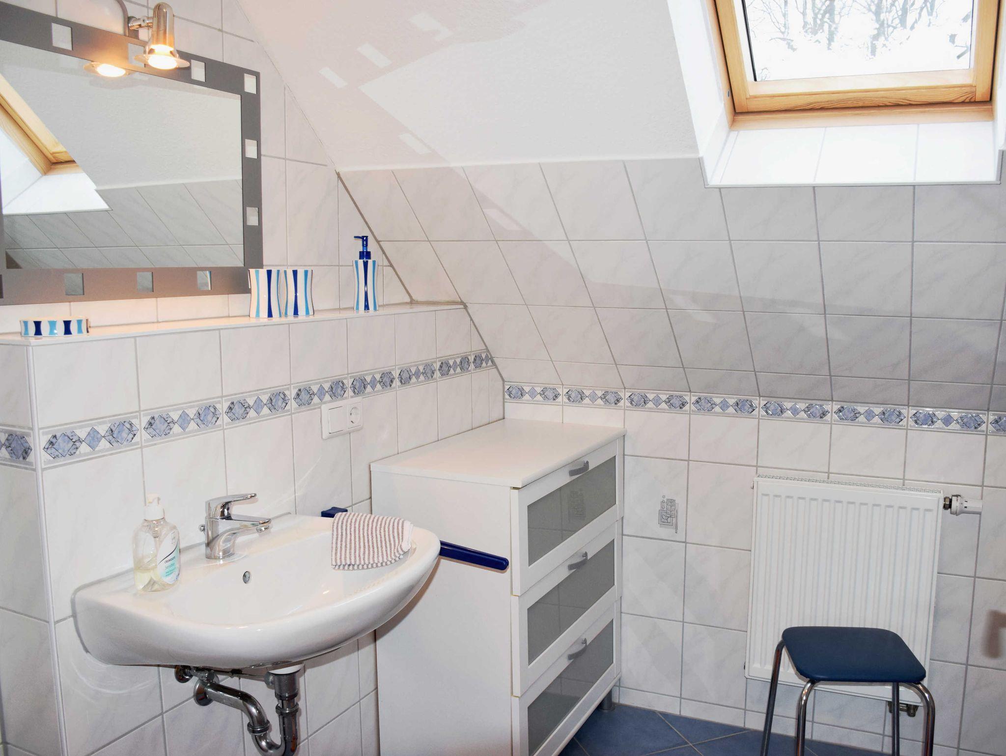 Das Bad ist mit Dusche, WC und Waschtisch ausgestattet und verfügt über Tageslicht. Zu dieser Ferienwohnung gehört auch ein kleiner Balkon mit Gartenmöbeln.