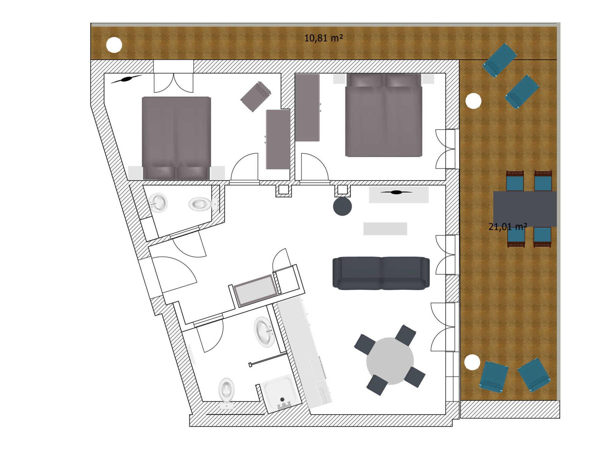 In der obersten Etage gelegen, trumpft diese Wohnung mit fantastischem Ausblick auf Baabe und die Ostsee auf und lädt zum Träumen und Entspannen ein. Tolle Stunden lassen sich auf der umlaufenden Dachterrasse verbringen, denn bei dieser Aussicht wird es bestimmt nie langweilig. Auf 30 qm finden Sie 2 Schaukelstühle, einen Esstisch mit 4 Stühlen und 2 Liegestühle. Und sollte es einmal zu frisch werden, können Sie drinnen vor dem Kamin entspannt die Füße hochlegen. Alle Zimmer verfügen über einen direkten Zugang zu der Terrasse.