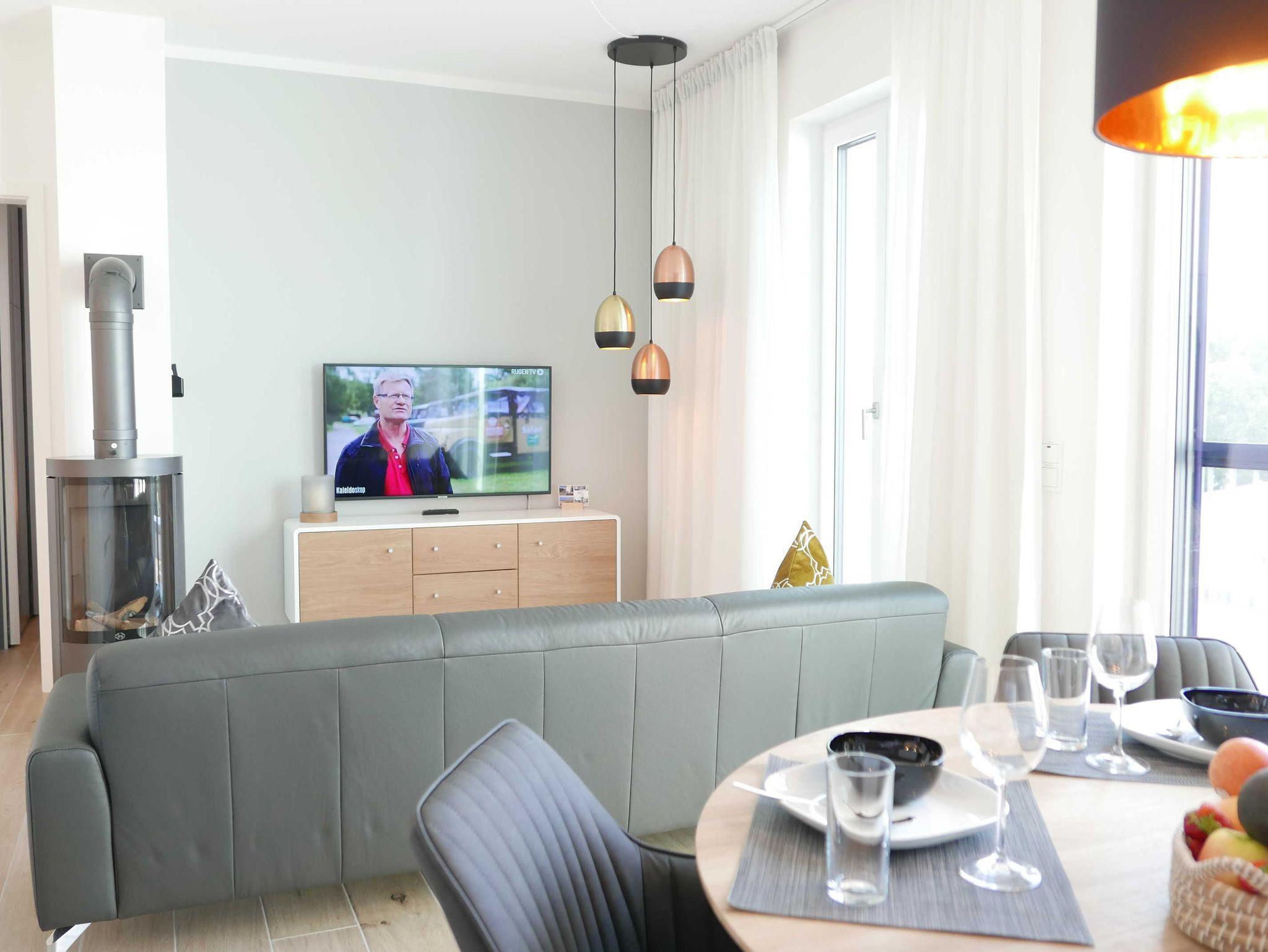 Ebenfalls befinden sich in jedem Zimmer bodentiefe Zimmer und eine Fußbodenheizung. Das offene Wohnzimmer ist hochwertig eingerichtet mit ausgewählten Designermöbeln in weißen und grauen Tönen.