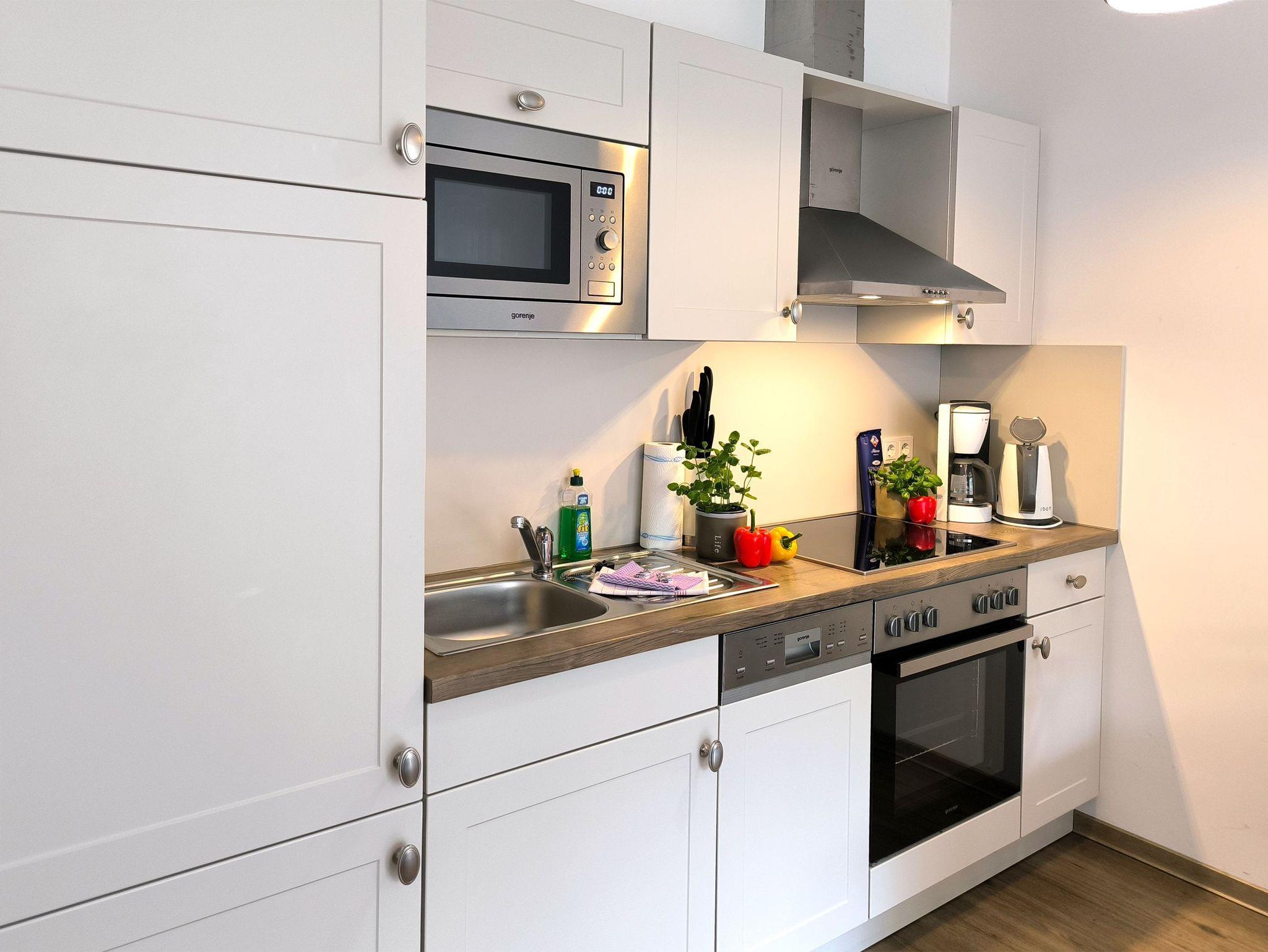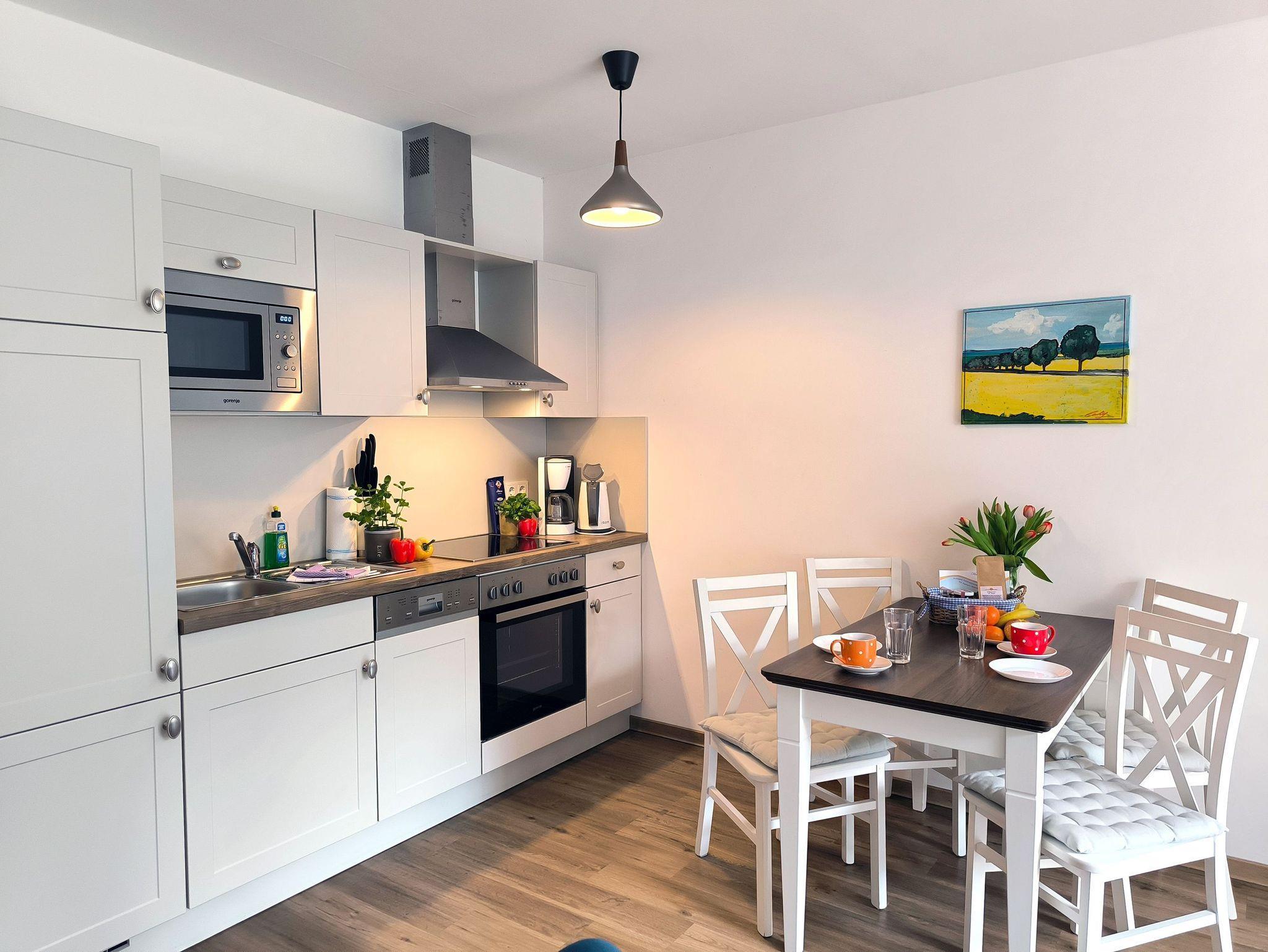 Eine helle freundliche 2 Zimmer Ferienwohnung mit geweißten Holzmöbeln und einen gemütlichen und hochwertigen Schlafsofa. Es gibt einen voll ausgestattete Küchenzeile mit allem was dazu gehört wie Geschirrspülmaschine und Backofen.