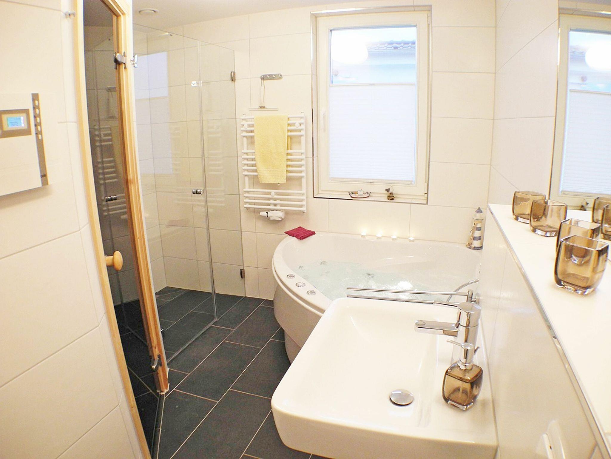 Nutzen Sie die Wellnessangebote im Dachgeschoss, um nach einem ausgiebigen Sonnenbad oder einer Entdeckungstour auf der Insel zur Ruhe zu kommen. Hierfür stehen Ihnen neben dem Whirlpool mit LED-Licht, eine Finnische Sauna mit LED-Lichteffekten und eine Relaxliege zur Verfügung.