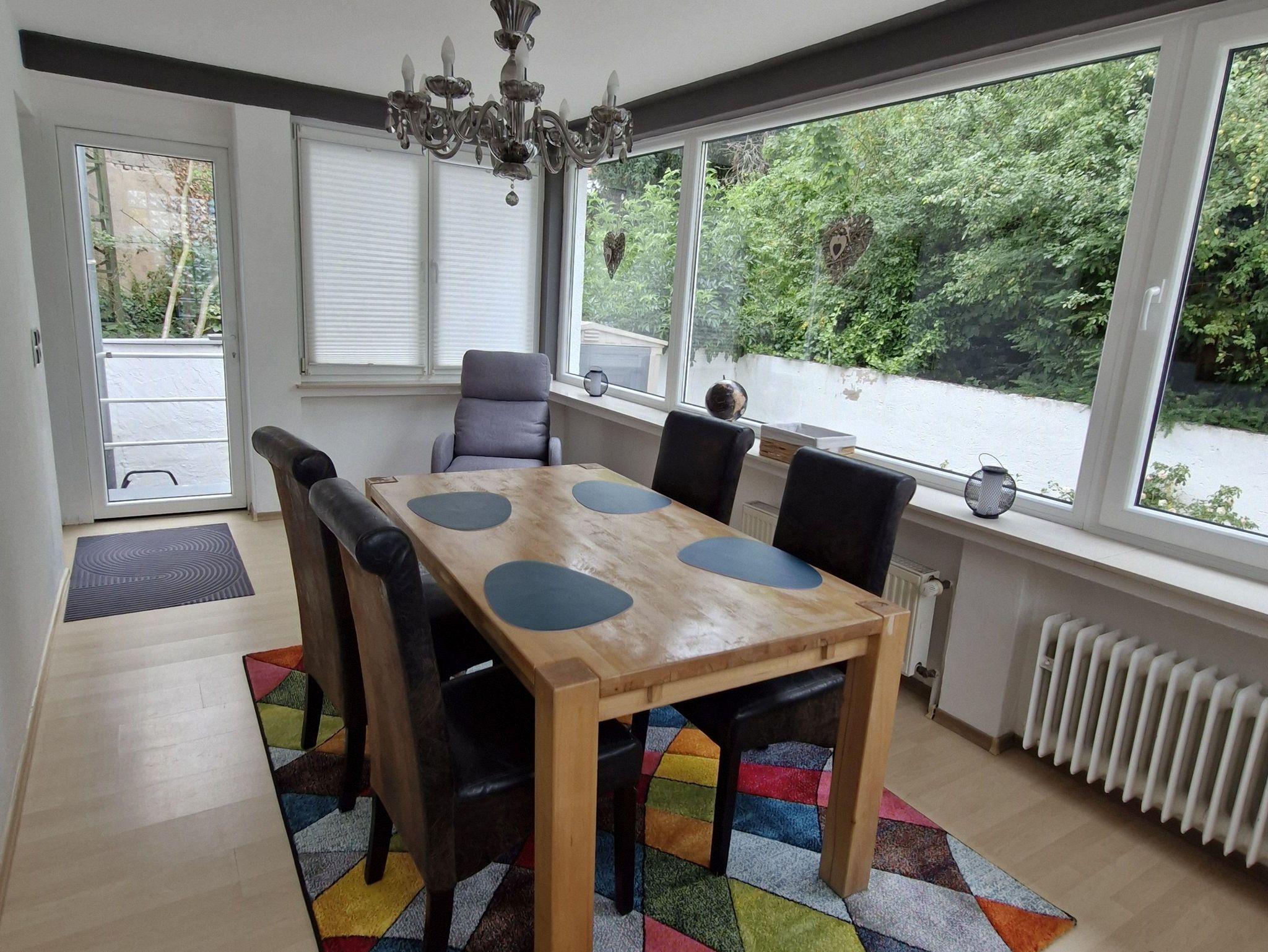 • Wintergarten (Esszimmer): Der lichtdurchflutete Wintergarten dient als gemütlicher Essbereich mit direktem Gartenblick und einem zweiten TV.