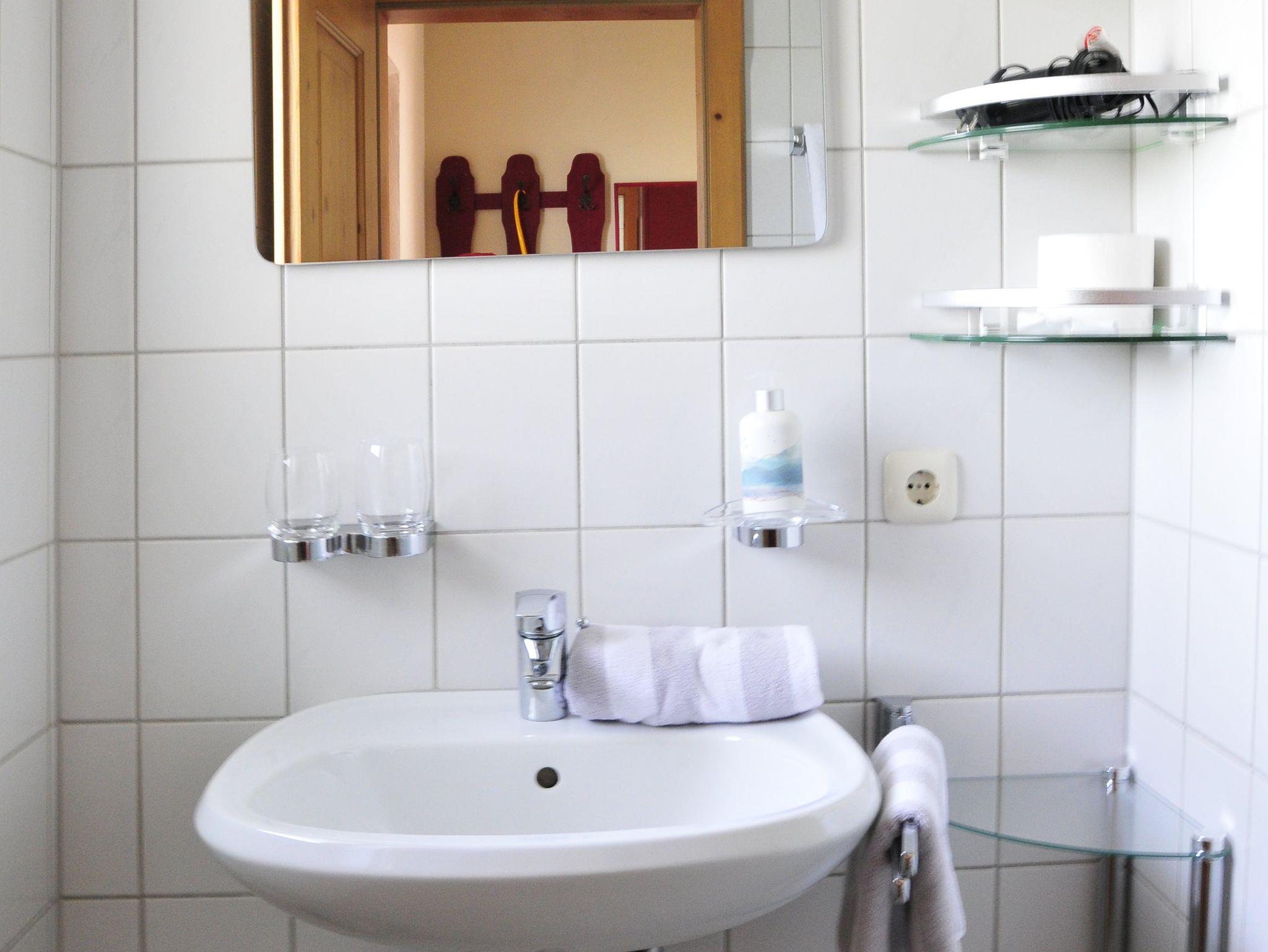 2-3 Personen, 41 m². 1. Stock nach Süden gelegen. Großer Wohnraum mit Couchgarnitur, Couch für 3. Person ausklappbar, Fernseher, Radio mit Bluetooth, Essplatz, Küchenzeile in der Diele, Mikrowelle auf Wunsch, Kaffeemaschine, Wasserkocher, Toaster, Geschirr für 3 Personen, Doppelschlafzimmer, Dusche mit WC, Föhn, Flur und Südbalkon mit Tisch und 2 Stühlen.