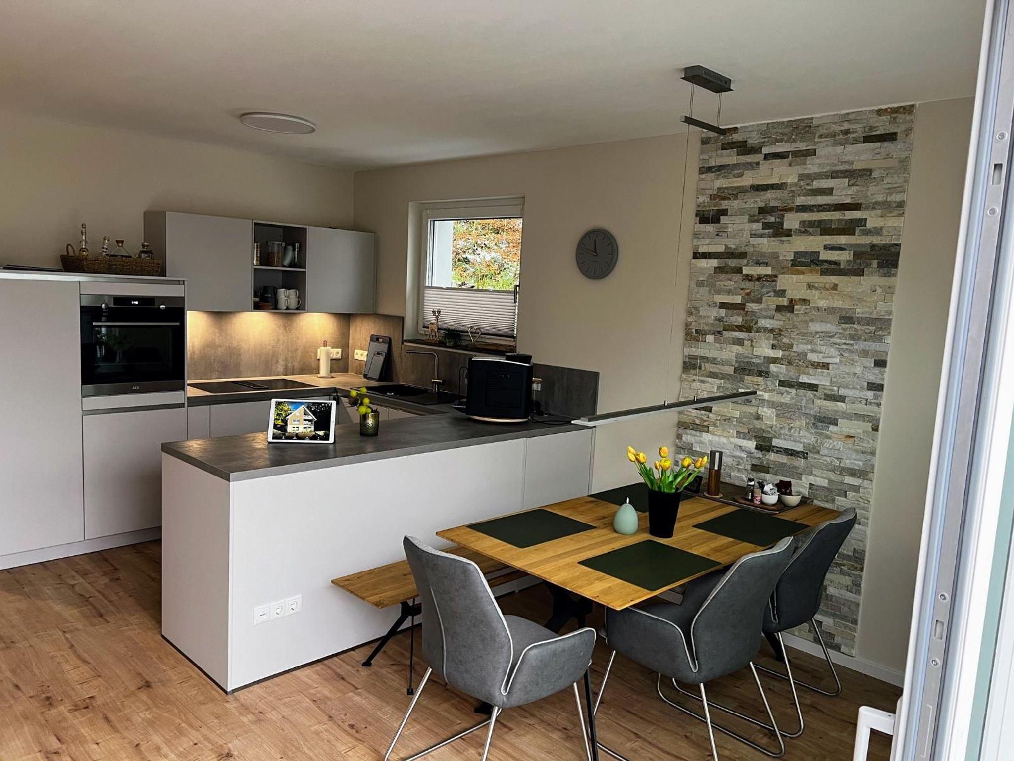 Diese neu erbaute Ferienwohnung WeltWald Harz mit 96 qm bietet Platz für max. 4 Personen. Die Ferienwohnung wurde vom DTV mit 5***** Sternen zertifiziert. Das Wohnzimmer ist mit einer gemütlichen Couch und einem Esstisch mit Stühlen ausgestattet. An den Wohnbereich schließt sich die offene Küche an. Die Küche ist ausgestattet mit einem Backofen, einem Kochfeld mit 4 Platten, einem Kühlschrank, Kaffeemaschine sowie Wasserkocher, Toaster und Geschirr sowie Küchenutensilien. Das Badezimmer ist mit DU/WC ausgestattet.
