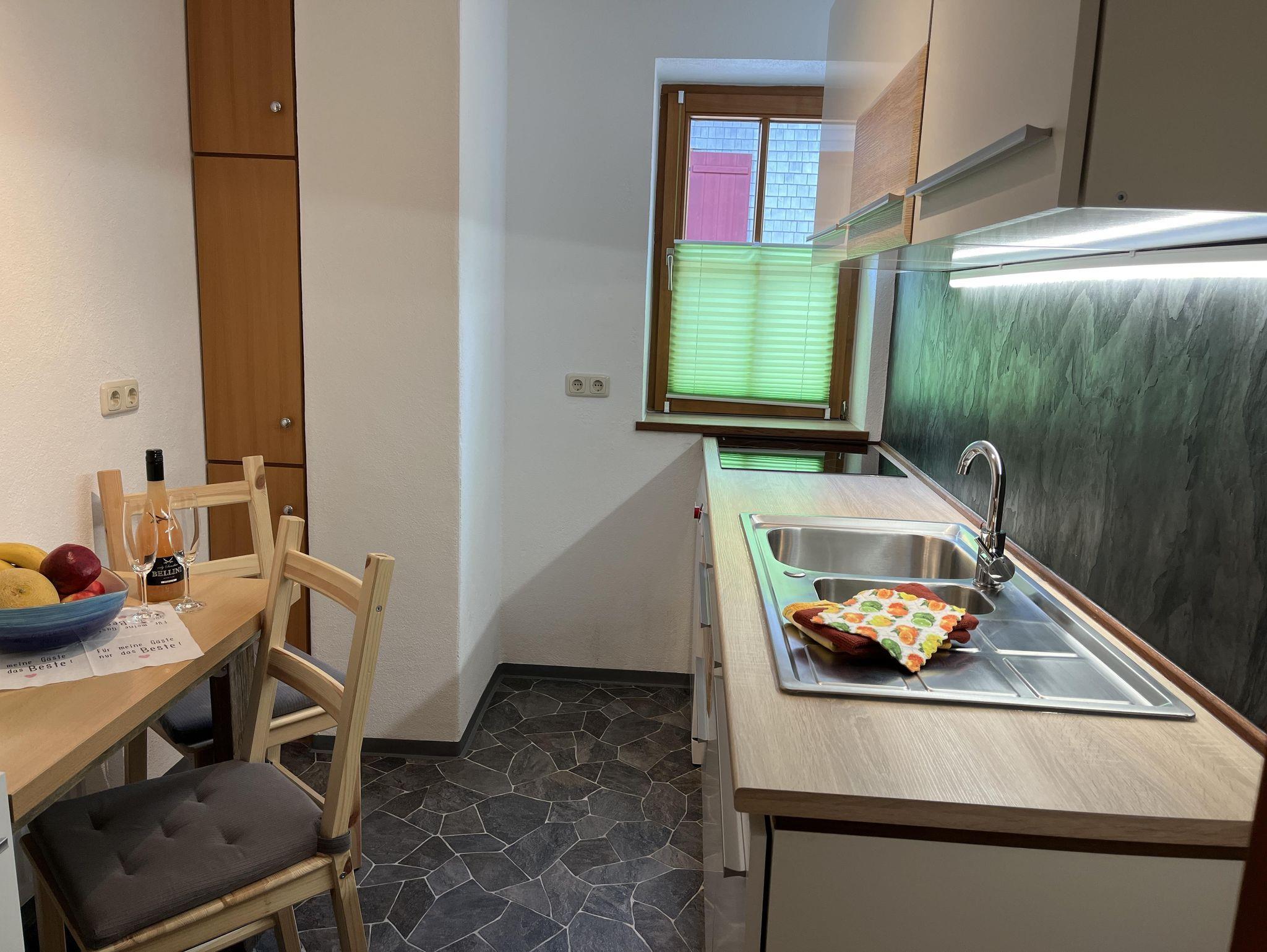 • Gemütliche Küche mit Eßplatz, Geschirrspülmaschine, großer Kühlschrank mit Gefrierfach, Kaffeemaschine und Wasserkocher