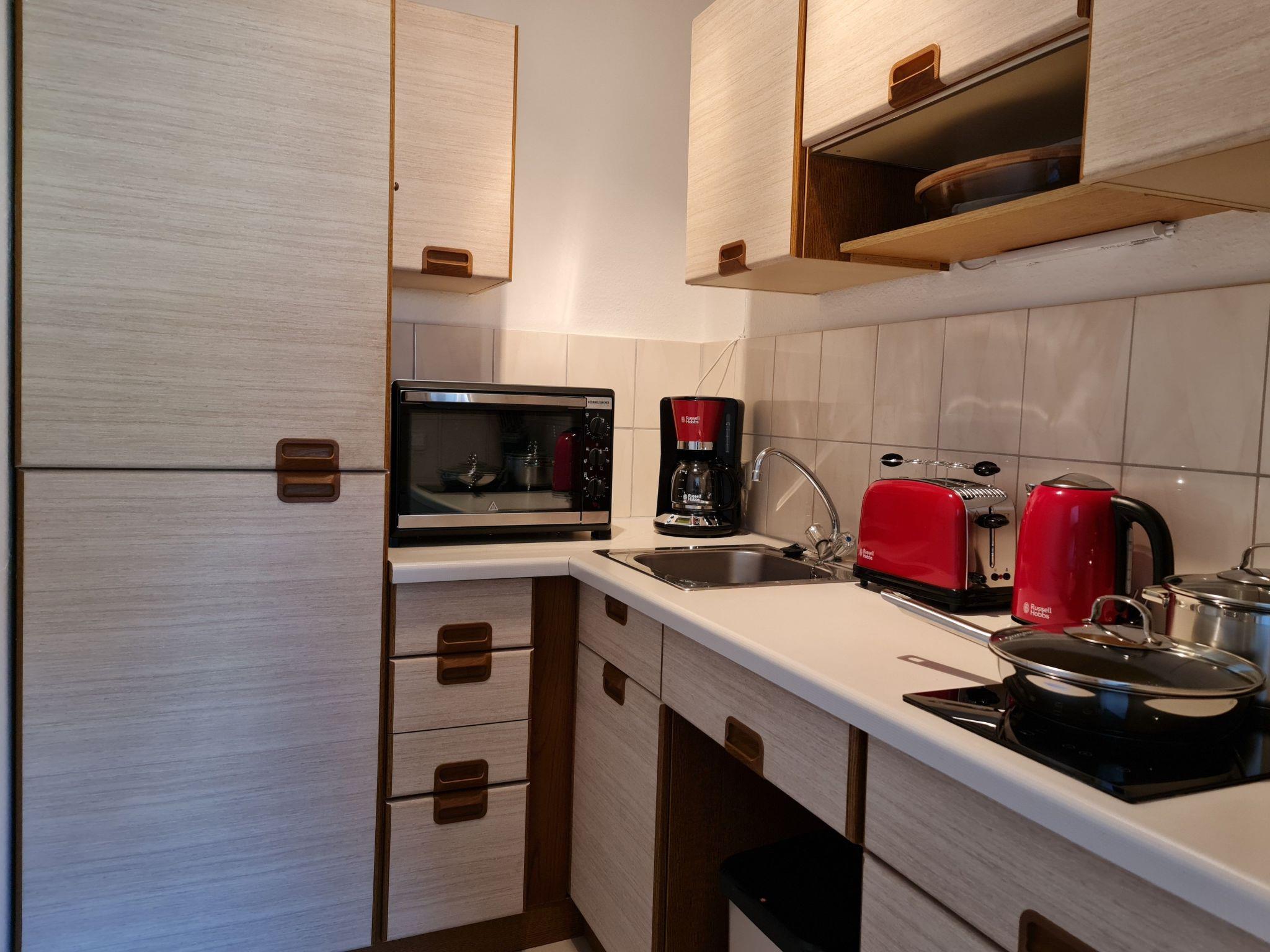 This beautiful, light-filled holiday apartment (approx. 47 sqm) features a spacious living/sleeping area and large windows. Exterior shutters are provided. The entrance area features a spacious built-in closet with ample storage space. The bathroom is equipped with a bathtub. The well-equipped kitchen includes a ceramic hob and a kitchenette with a baking/grilling and frying function.