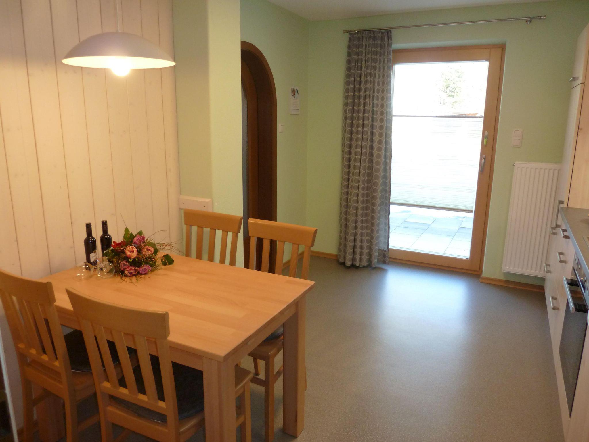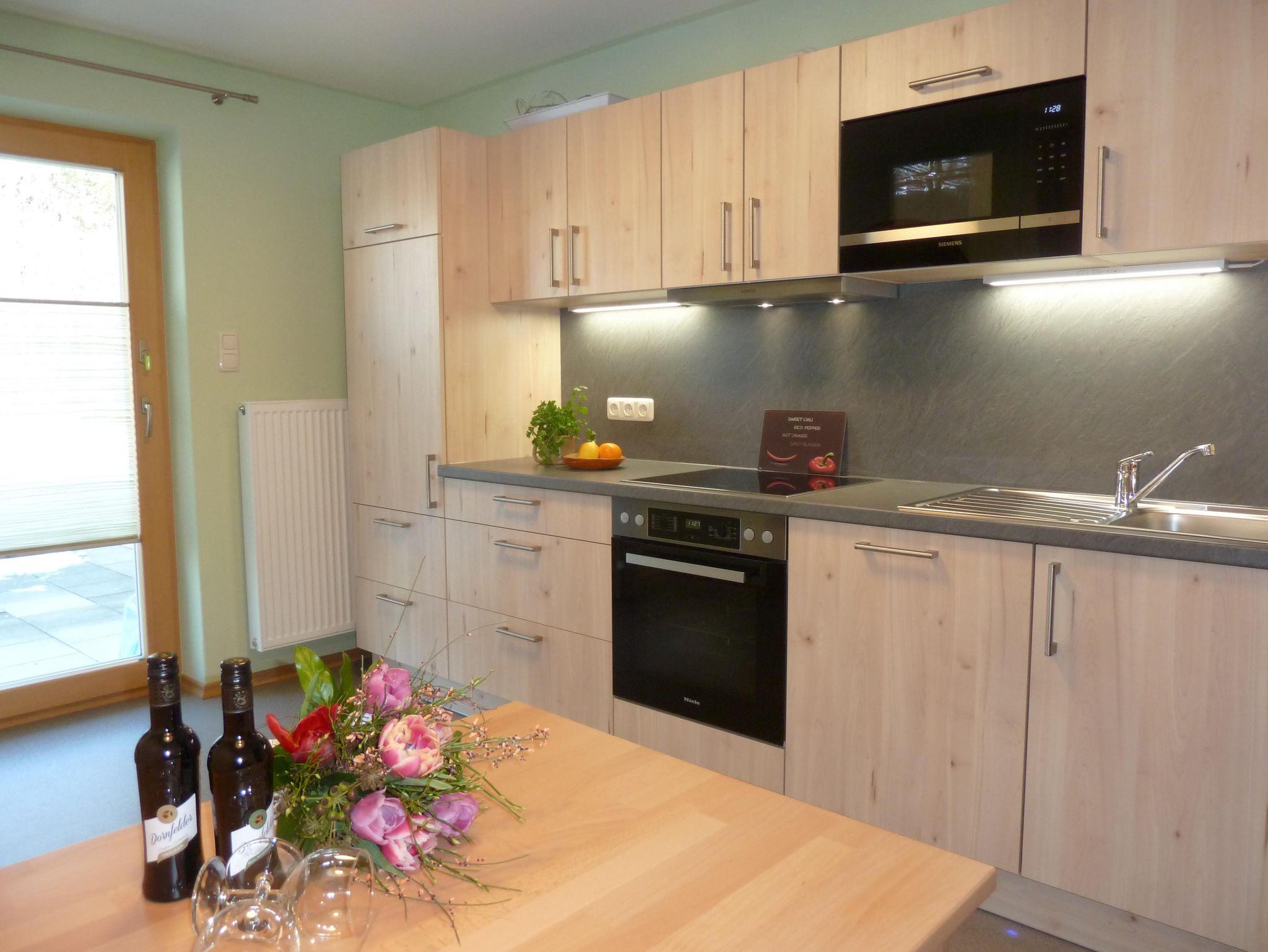 Die neue Küche mit Essecke und Terrassentüre mit Gartenblick ist komplett ausgestattet mit Geschirr, Kochutensilien,Wasserkocher, Kaffeemschine mit Filter, Mikrowelle, Kühlschrank mit Gefrierfach, 4-Zonen Cerankochfeld, Backofen, Spülmaschine, Reinigungsmittel und Staubsauger.