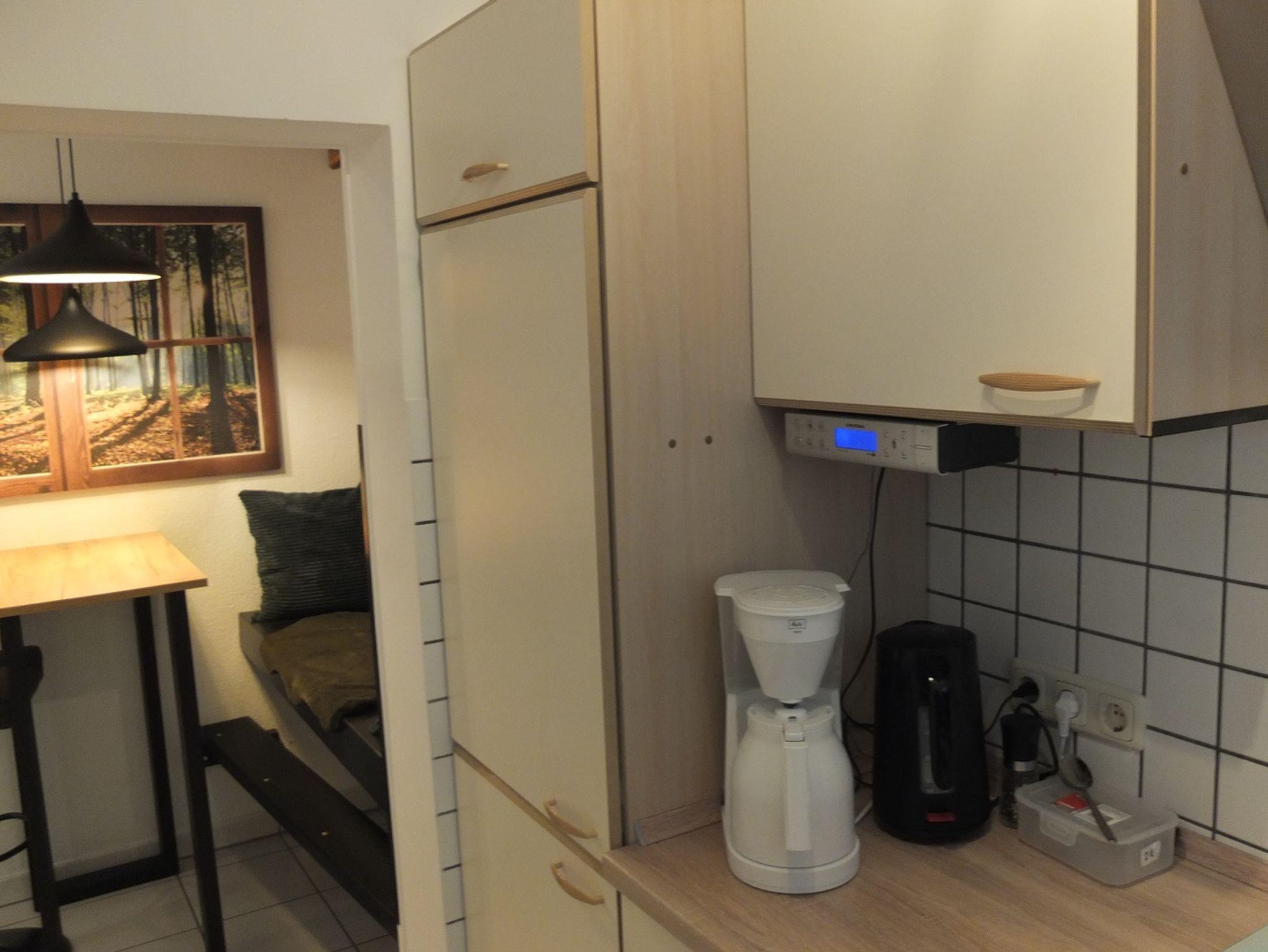 Küche mit Spüle, Dunstabzug, 4-Plattenherd, Backofen, Mikrowelle, Kaffeemaschine, Wasserkocher, Kühl-/Gefrierkombination