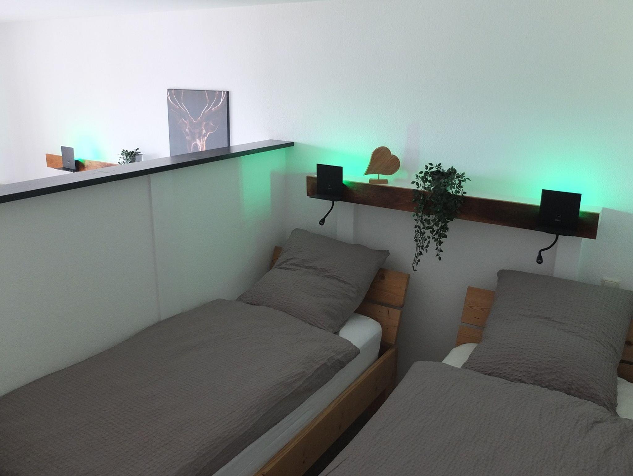 Schlafnische mit zwei 90 cm Einzelbetten in Komforthöhe, optional nebeneinander zu positionieren.