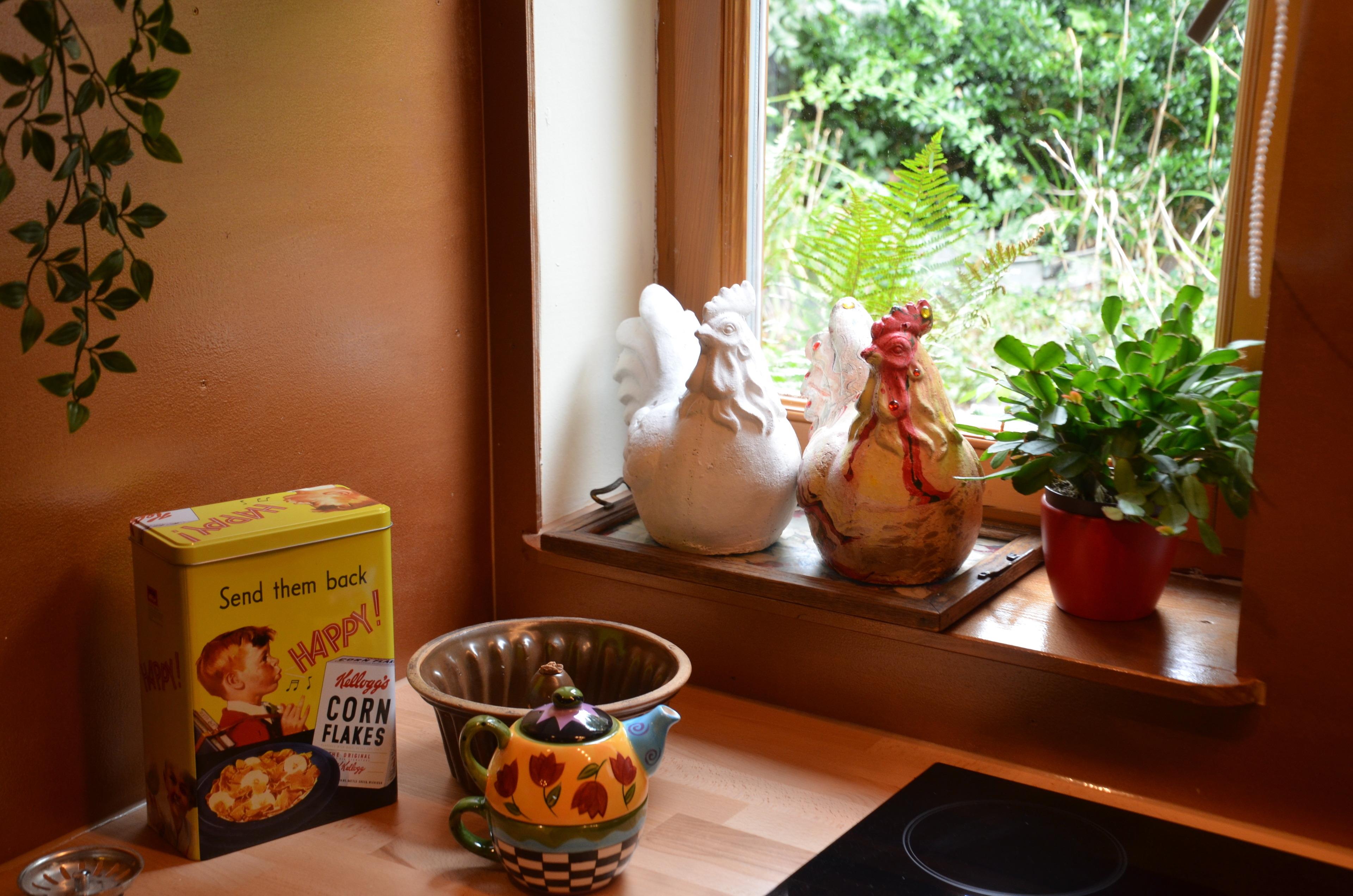 • Kleine Küche mit Herd, Backofen, Kühlschrank, Kaffeemaschine, Toaster