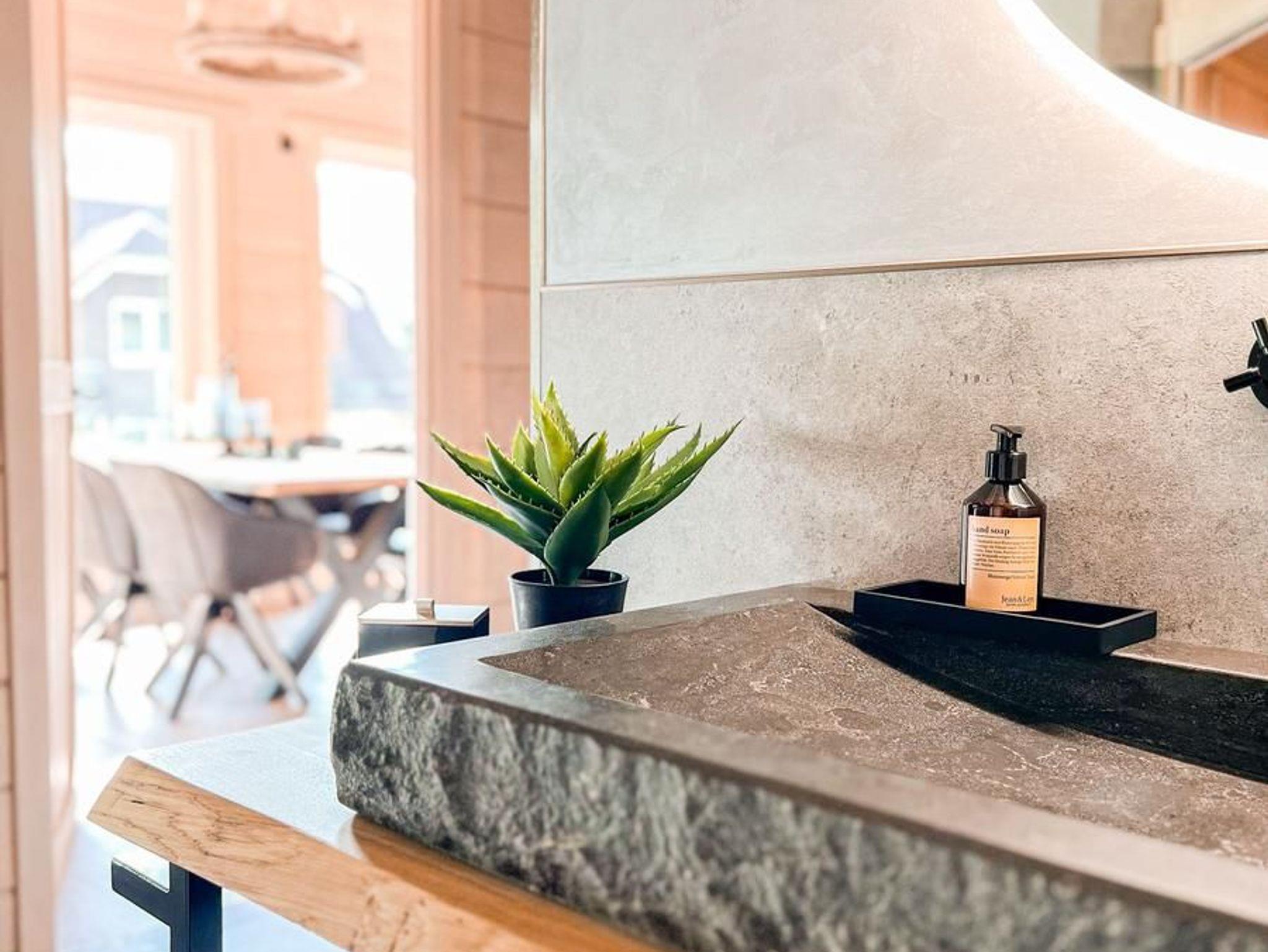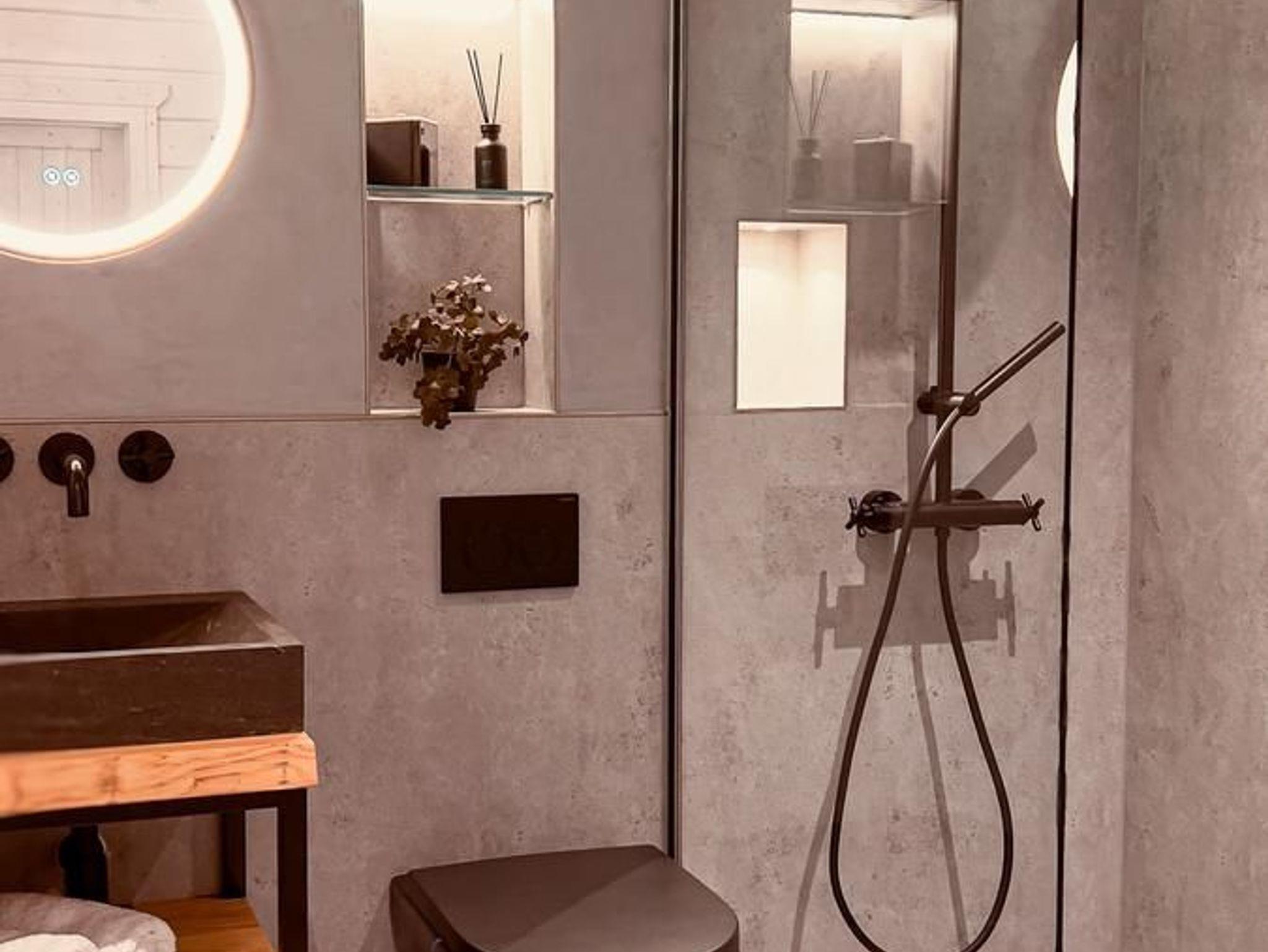 Angrenzend an den offenen Wohn- und Essbereich befindet sich der finnische Saunabereich, das stilvolle Bad mit italienischem Fliesenboden, großzügiger Dusche und einem Naturstein-Waschtisch aus Blaustein mit Design-Armaturen, in dem an kühlen Wintertagen angenehme Wärme getankt werden kann. Außerdem steht ein separates WC zur Verfügung.