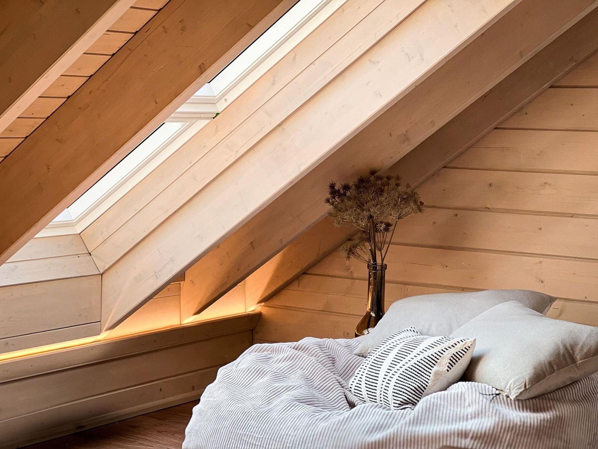 Von der Wohngalerie gelangt man über eine kleine Holzbrücke zum dritten Schlafzimmer, welches in der Dachschräge des Hauses liegt, mit großen Doppelbett, Massivholzschrank, geräumig und sehr gemütlich ausgestattet ist.