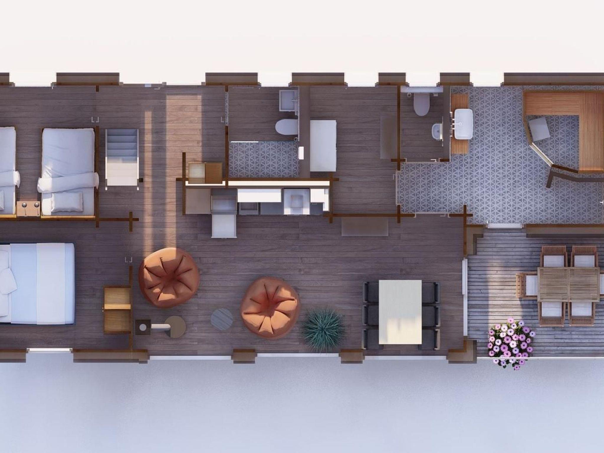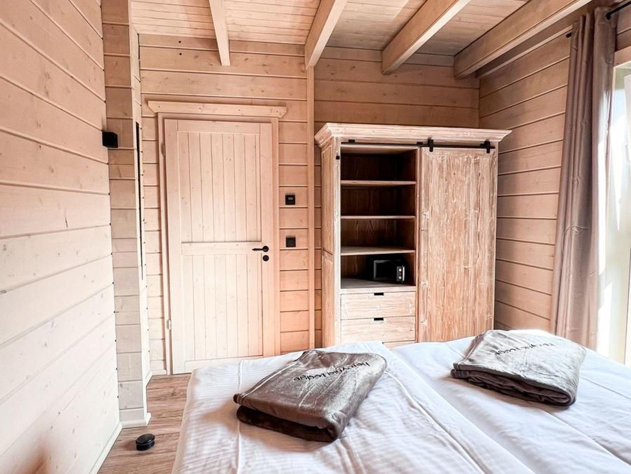 Auf 110 m² Wohnfläche über zwei Etagen bietet die Lodge Platz für bis zu 6 Personen. Der Duft von Holz empfängt Sie beim Eintreten und schafft sofort eine warme, entspannte Atmosphäre. Im offen gestalteten Wohn- und Essbereich erwarten Sie ein gemütlicher Holzofen, ein großer Flatscreen-TV und eine außergewöhnliche Retro-Küche im modernen Stil. Die überdachte Terrasse mit hochwertigen Gartenmöbeln und Gasgrill lädt zu geselligen Abenden im Freien ein bei jedem Wetter.