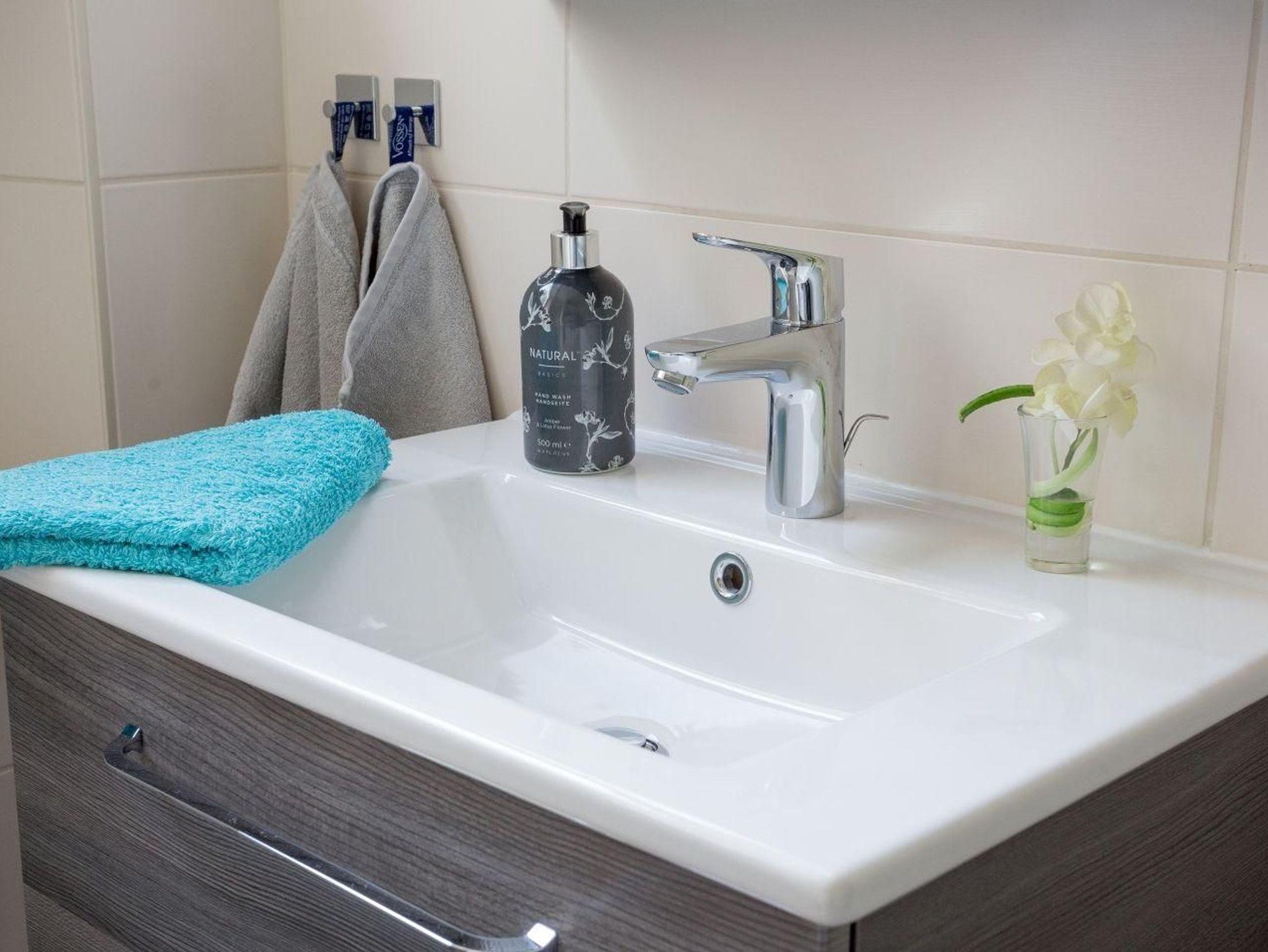 Das großzügige Bad mit großzügigem Waschtischmöbel, Fön, Hygieneartikel und Dusche runden das Gesamtbild. Das WC befindet sich in einem separaten Raum.