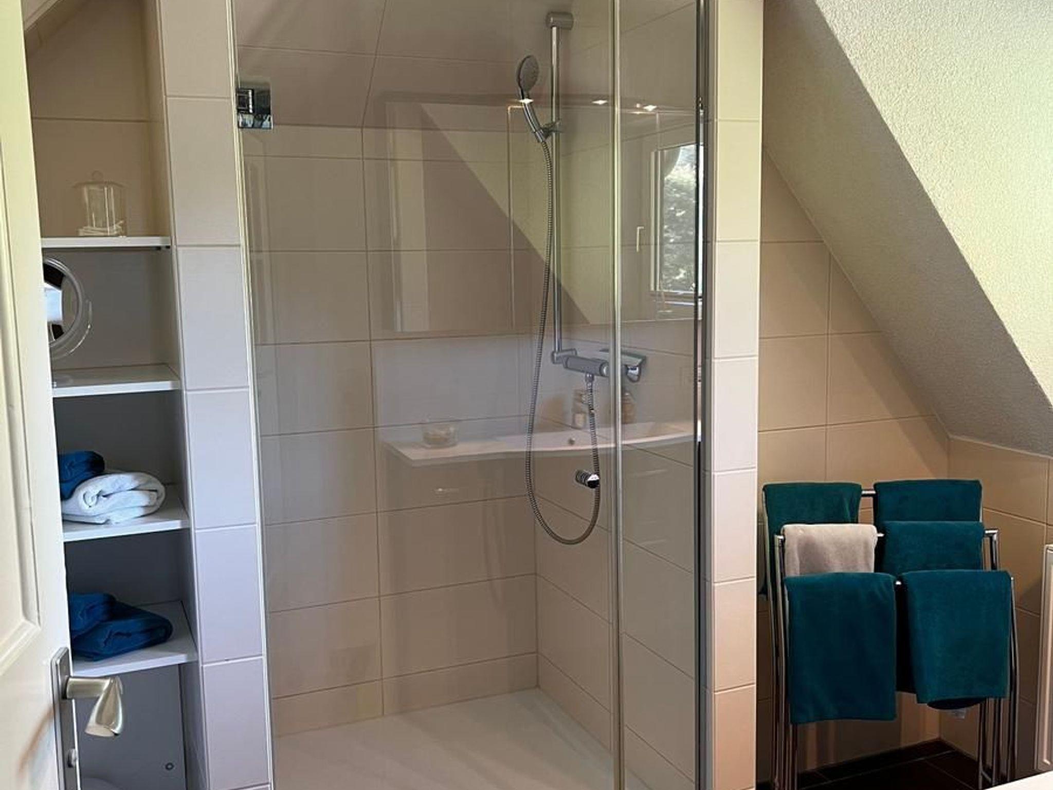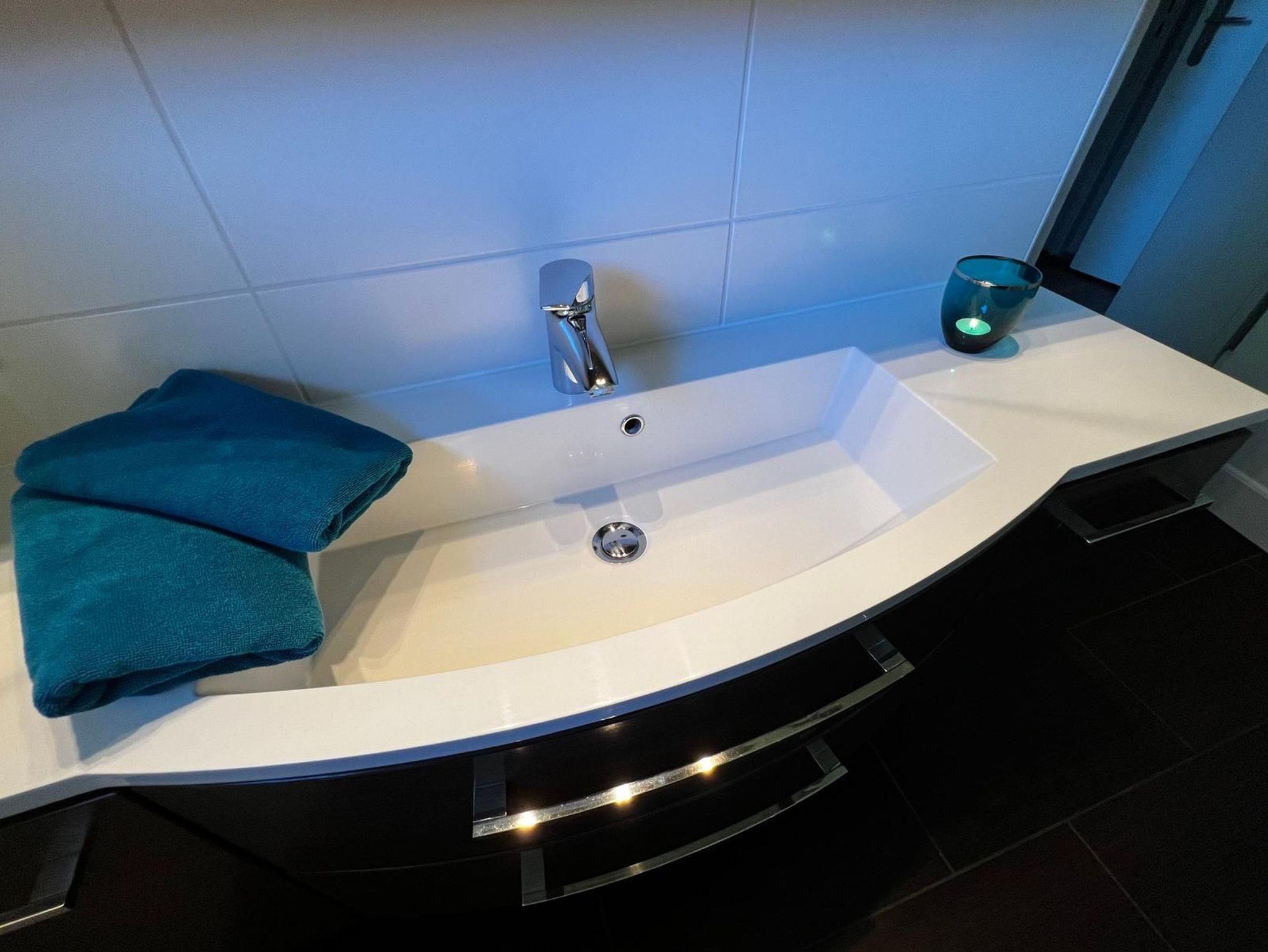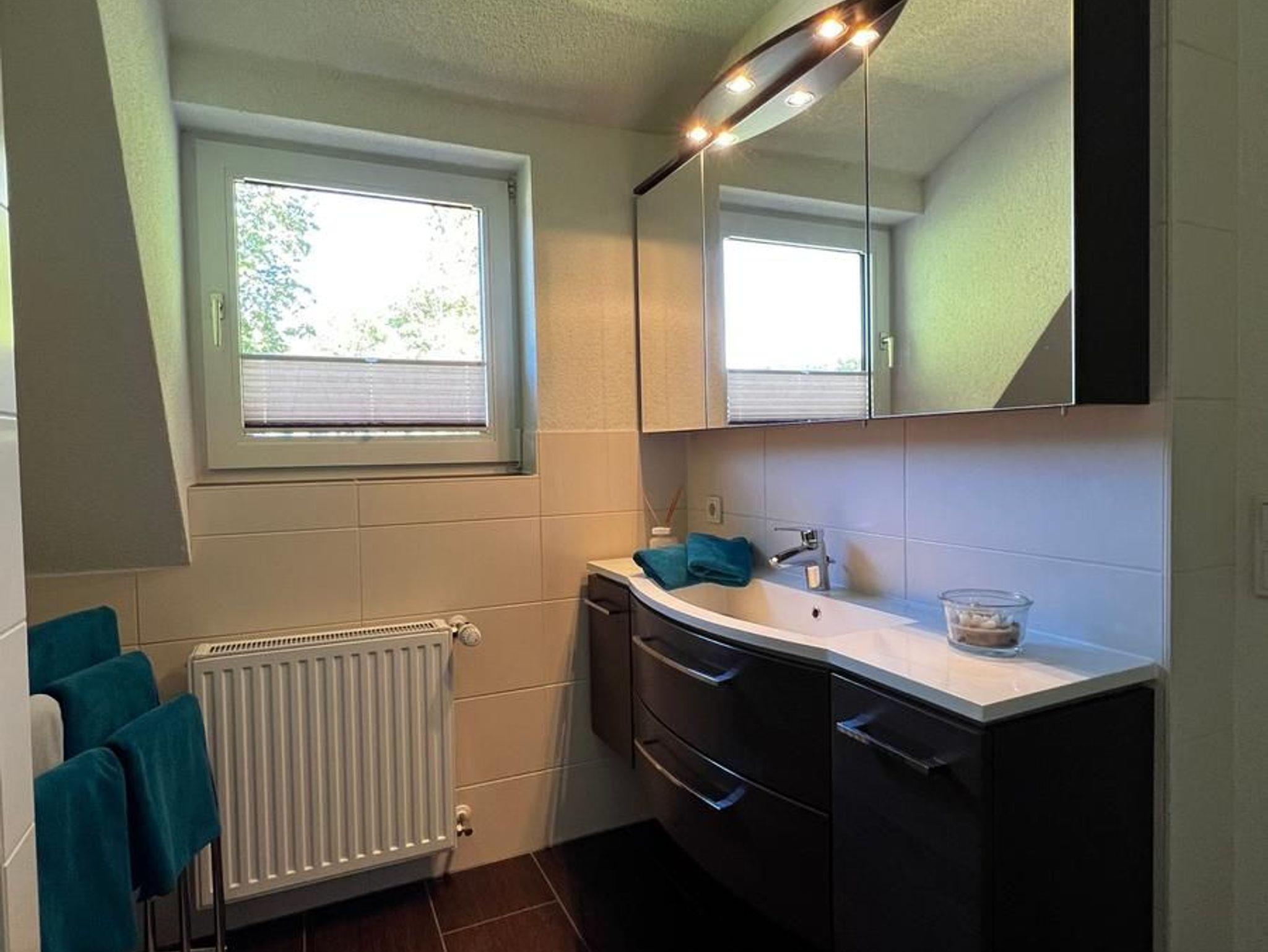Das schöne Bad mit großzügiger Waschtischeinheit mit Fön, großer Dusche, Kosmetiktüchern und Handtuchheizkörper und einem separatem WC rundet das Gesamtbild ab.
