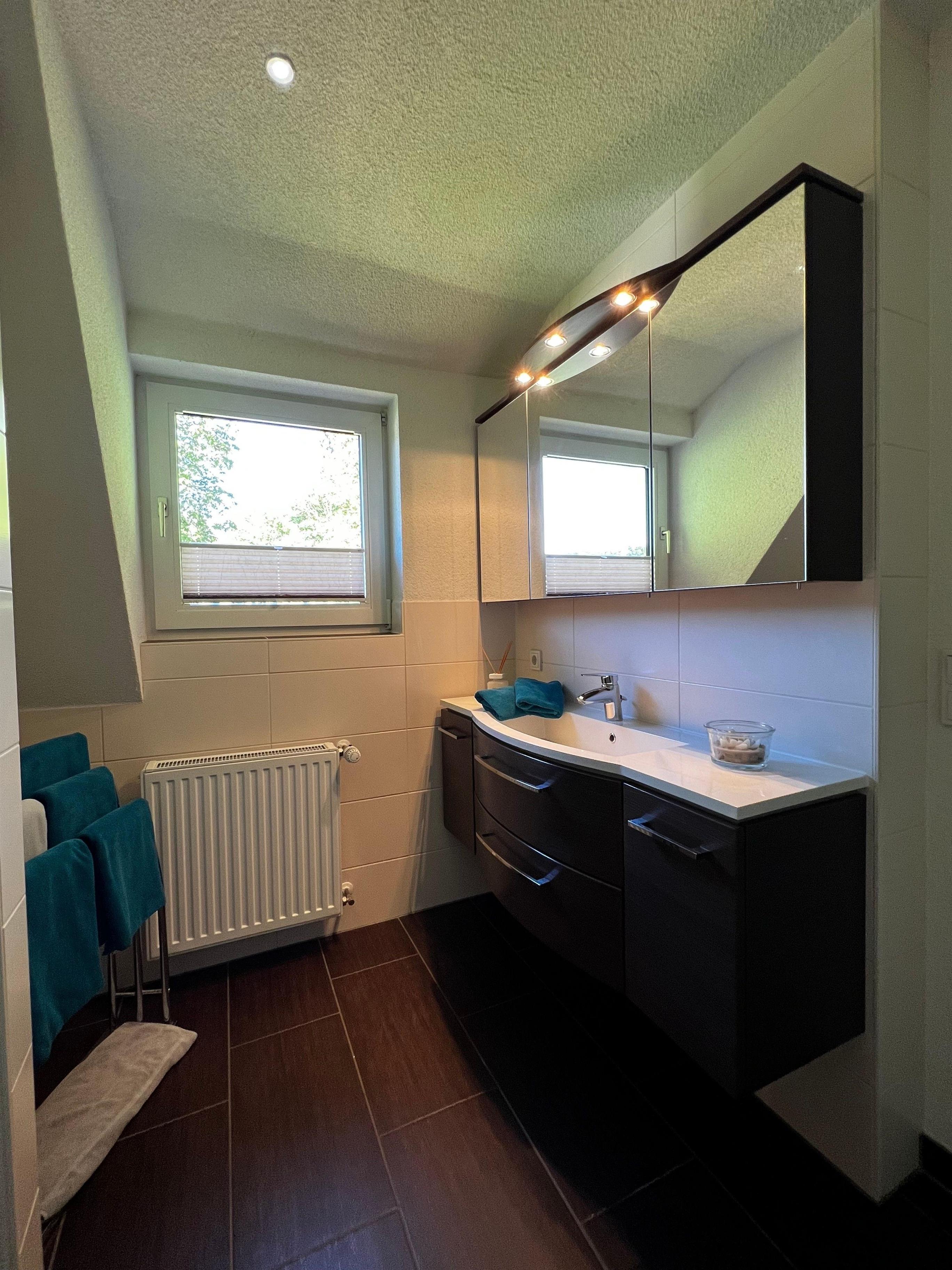 Das schöne Bad mit großzügiger Waschtischeinheit mit Fön, großer Dusche, Kosmetiktüchern und Handtuchheizkörper und einem separatem WC rundet das Gesamtbild ab.