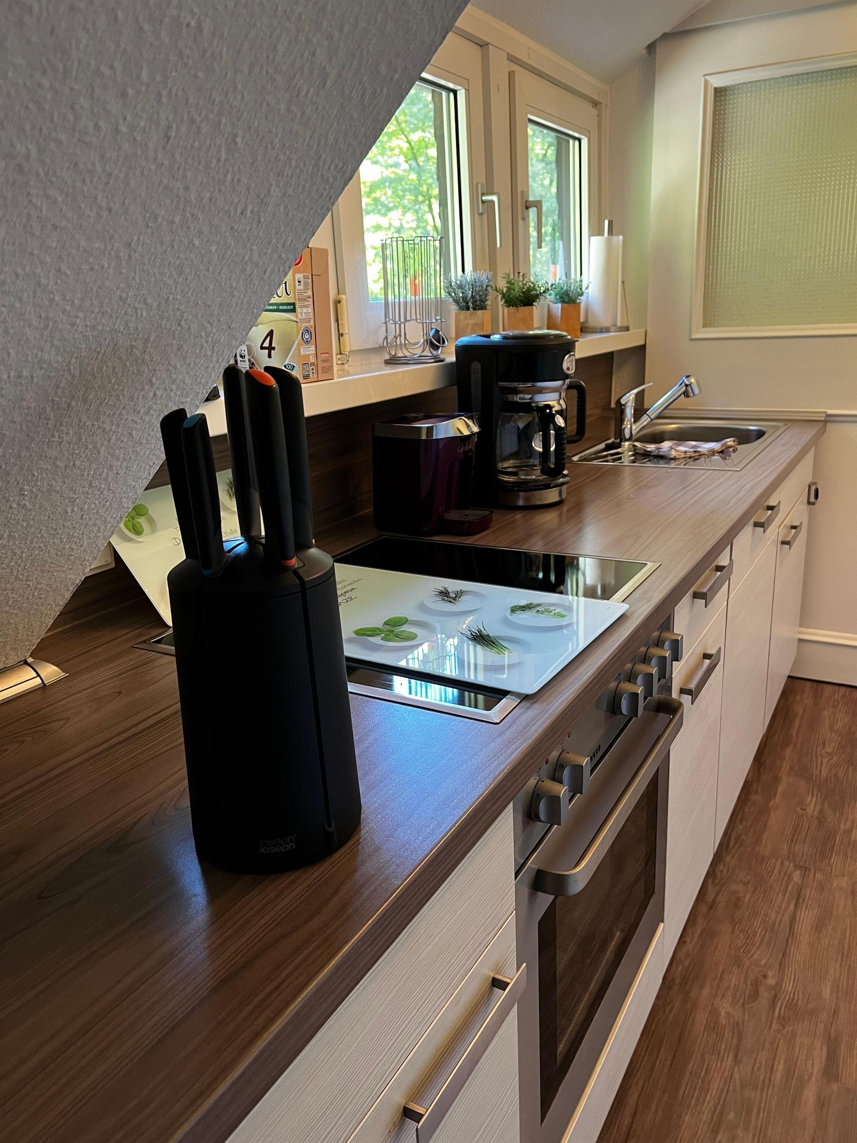 In der modernen Küche mit Spülmaschine, Cerankochfeld, Backofen, Mikrowelle, Wasserkocher, Gewürzen und modernen Küchenutensilien können Sie einfach und schnell Ihr Lieblingsessen zaubern. Für Ihren Kaffeegenuss stehen Ihnen eine Filterkaffee- sowie eine Kapselmaschine zur Verfügung.