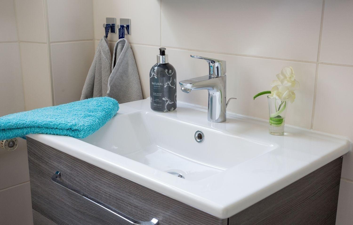 Eine Erstausstattung von Spülmittel, Tabs, Toilettenpapier und Handwaschseife ist vorhanden.