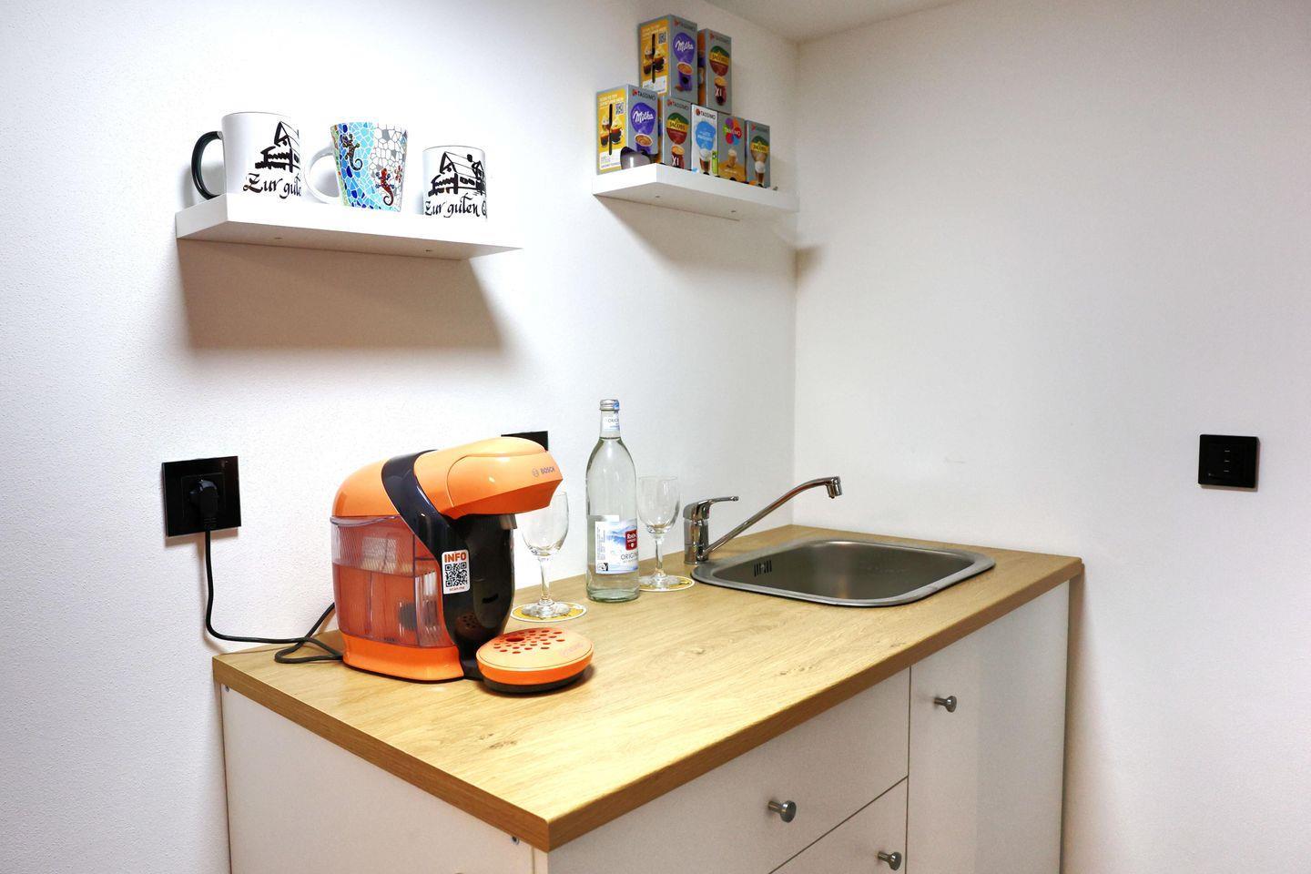In der Fewo Storchennest erwartet Sie ein behagliches Schlafzimmer, das nach einem aktiven Urlaubstag erholsamen Schlaf verspricht. Der kleine Eingangsbereich führt Sie direkt zur praktischen Küchennische mit Espressomaschine. Hier lassen sich kleine Snacks mühelos zubereiten. Vom Eingangsbereich haben Sie direkten Zugang zum Schlafzimmer und einem Highlight der Ferienwohnung, der großen ebenerdigen Dusche.