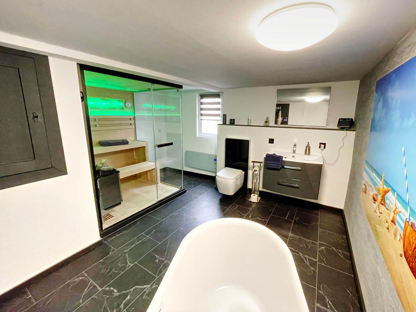 Ihnen steht ein separates Badezimmer mit privater Sauna und Badewanne zur Verfügung, das sich über den Flur befindet. Trotz der räumlichen Trennung steht Ihnen die gesamte Wohnetage zur alleinigen Nutzung bereit, sodass Sie Ihre Privatsphäre in vollen Zügen genießen können.