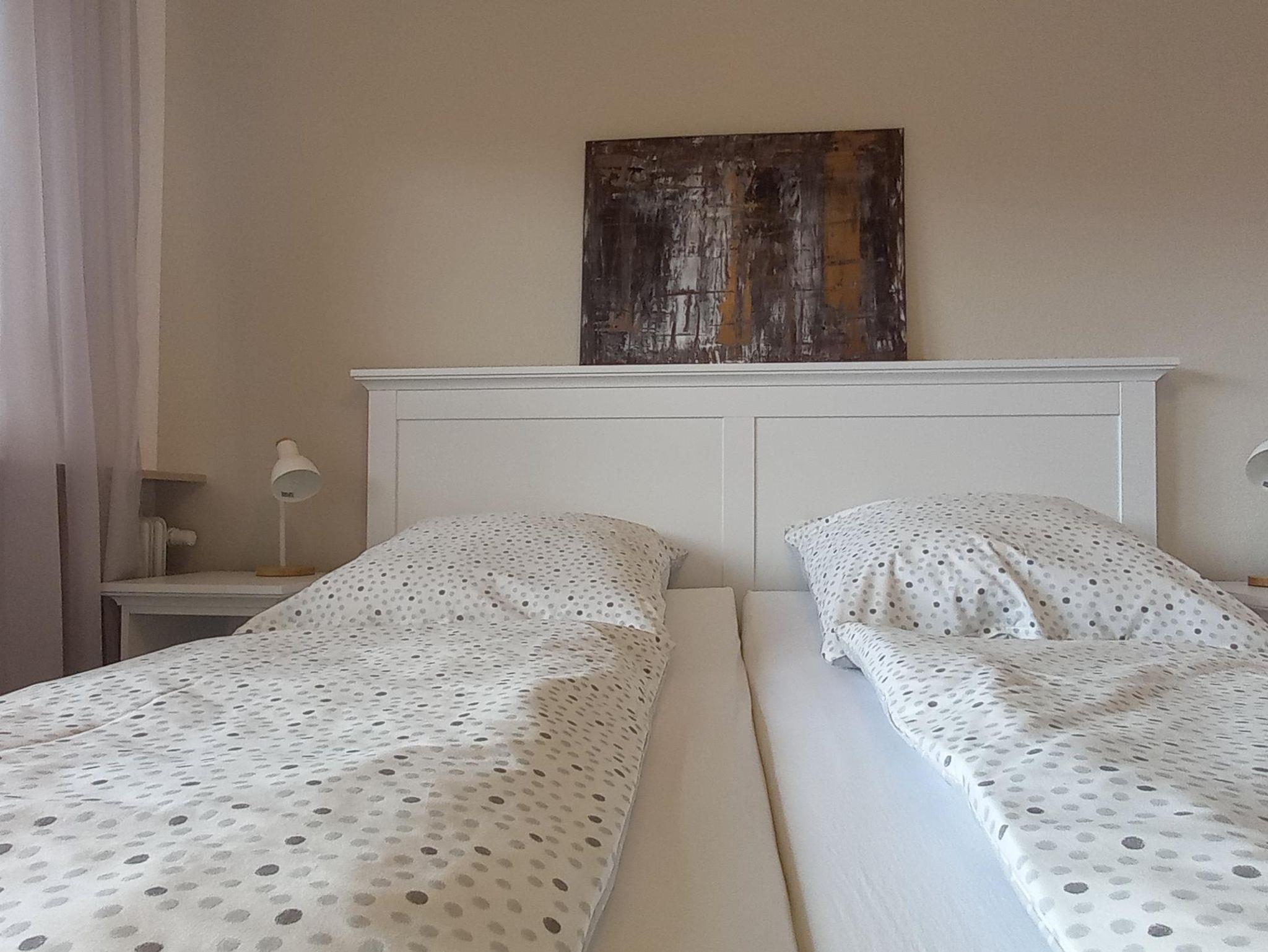 Die Ferienwohnung besteht aus einer vollständig eingerichteten Küche mit Cerankochfeld (4 Platten), Backofen, Dunstabzugshaube, Mikrowelle, Geschirrspüler, Kaffeemaschine (Senseo), Wasserkocher, Toaster sowie Kühlschrank mit Gefrierfach u.v.m, ein Esszimmer mit Durchbruch zum Wohnzimmer, einem separaten Schlafzimmer mit einem Doppelbett (180x200 cm) und Kleiderschrank, einem geräumigen Flur sowie Balkon mit herrlichem Ausblick. Tee, einige Kaffeepats, Dosenmilch und eine Flasche Wasser stehen für Sie bereit. Die Wohnung ist 66 qm groß und bietet viel Platz für max. 3 Erwachsene oder 2 Erwachsene mit max. 2 Kindern. Im Wohnzimmer befindet sich eine ausziehbare Couch (130x200 cm). Ein Kinderreisebett kann bei Bedarf ebenfalls aufgestellt werden. Im Preis enthalten sind Bettwäsche, Handtücher, 2 Bademäntel sowie Wäsche für die Küche. Kostenfreies Wlan ist ebenfalls vorhanden. Ihr Fahrzeug kann im Hof (je nach Größe, bei Buchung bitte nachfragen) kostenfrei geparkt werden. Das Badezimmer besteht aus Dusche, WC und Waschtisch inklusive Fön. Das Rauchen in der Wohnung ist nicht gestattet.