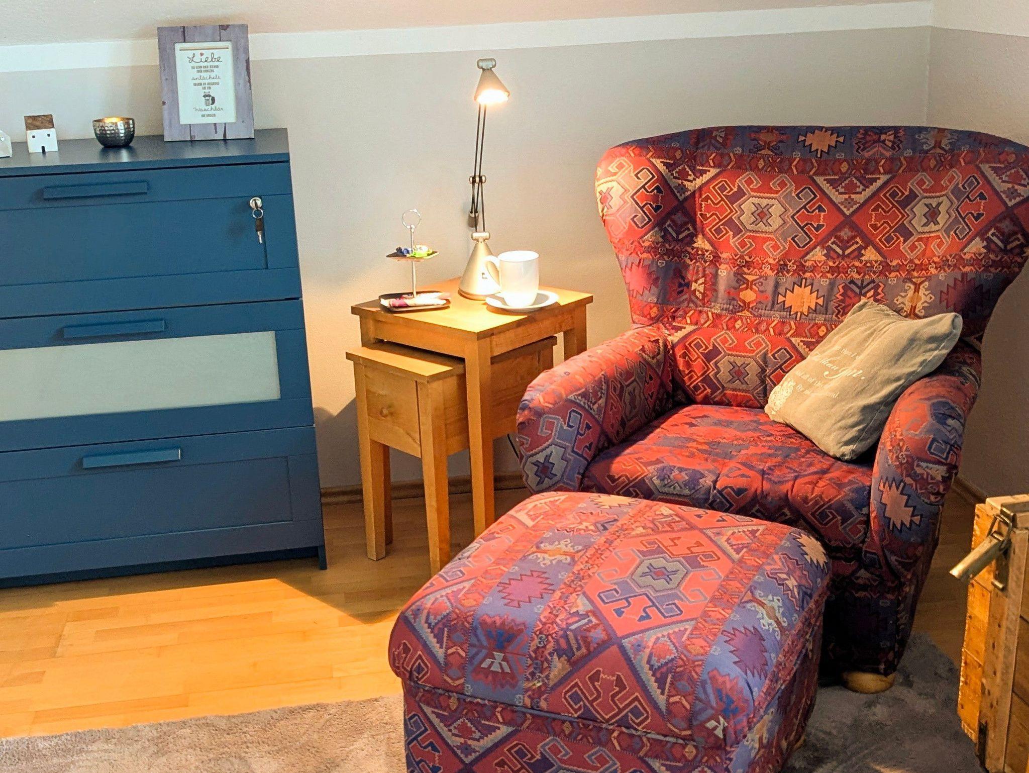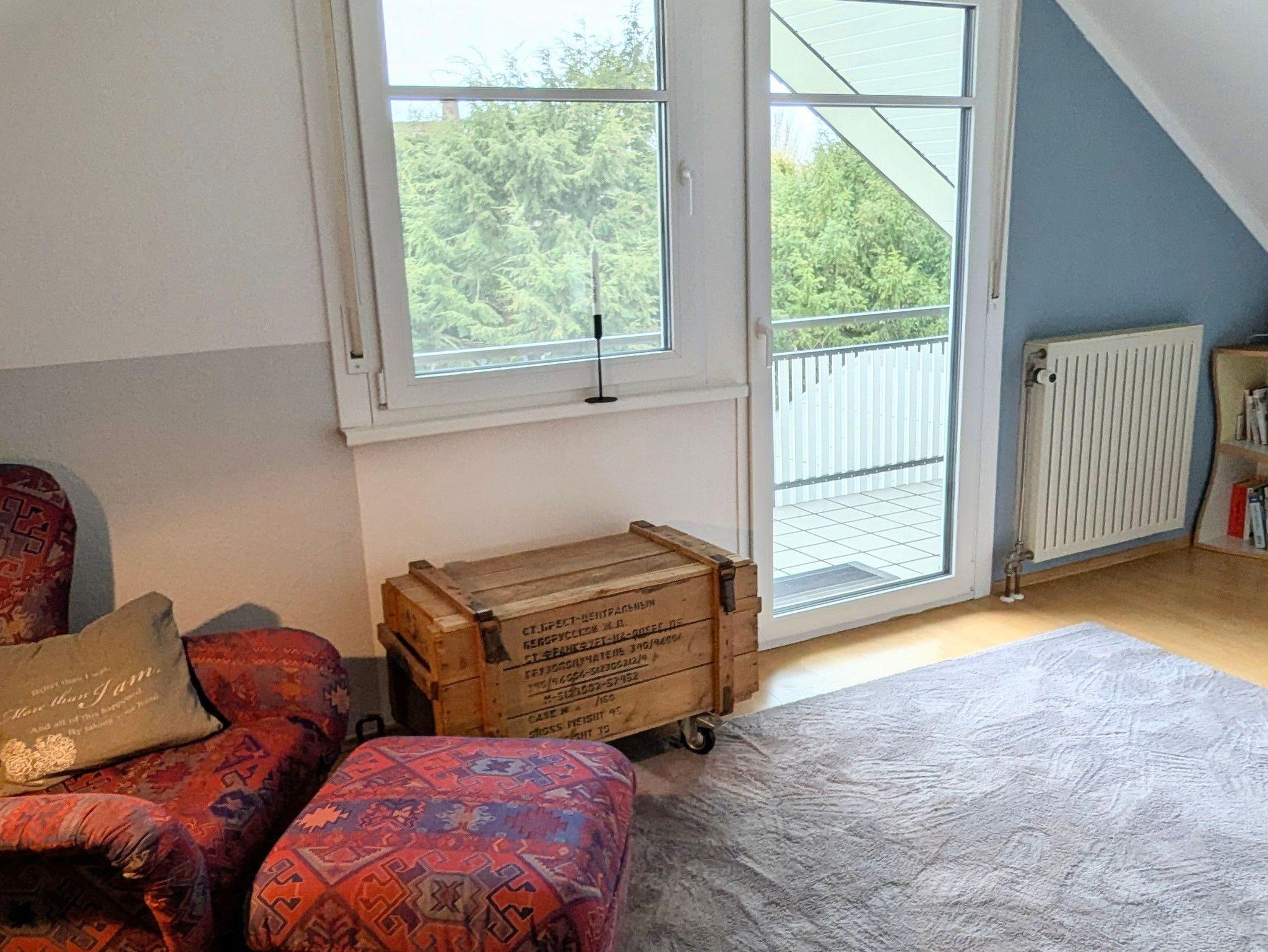 Im Schlafzimmer : 1,40 m Bett, Leseecke mit gemütlichem Sessel, Balkon mit Sitzbereich