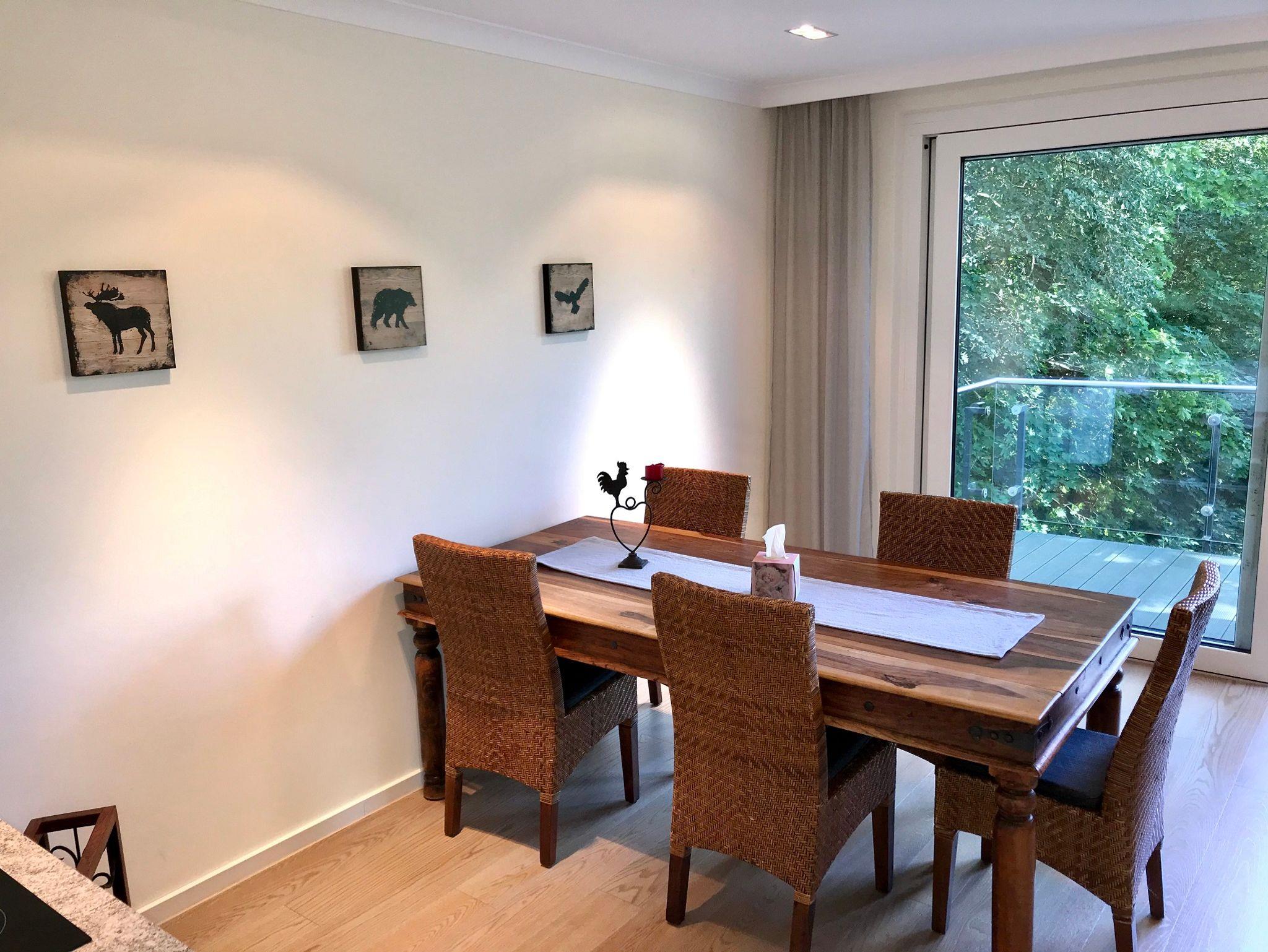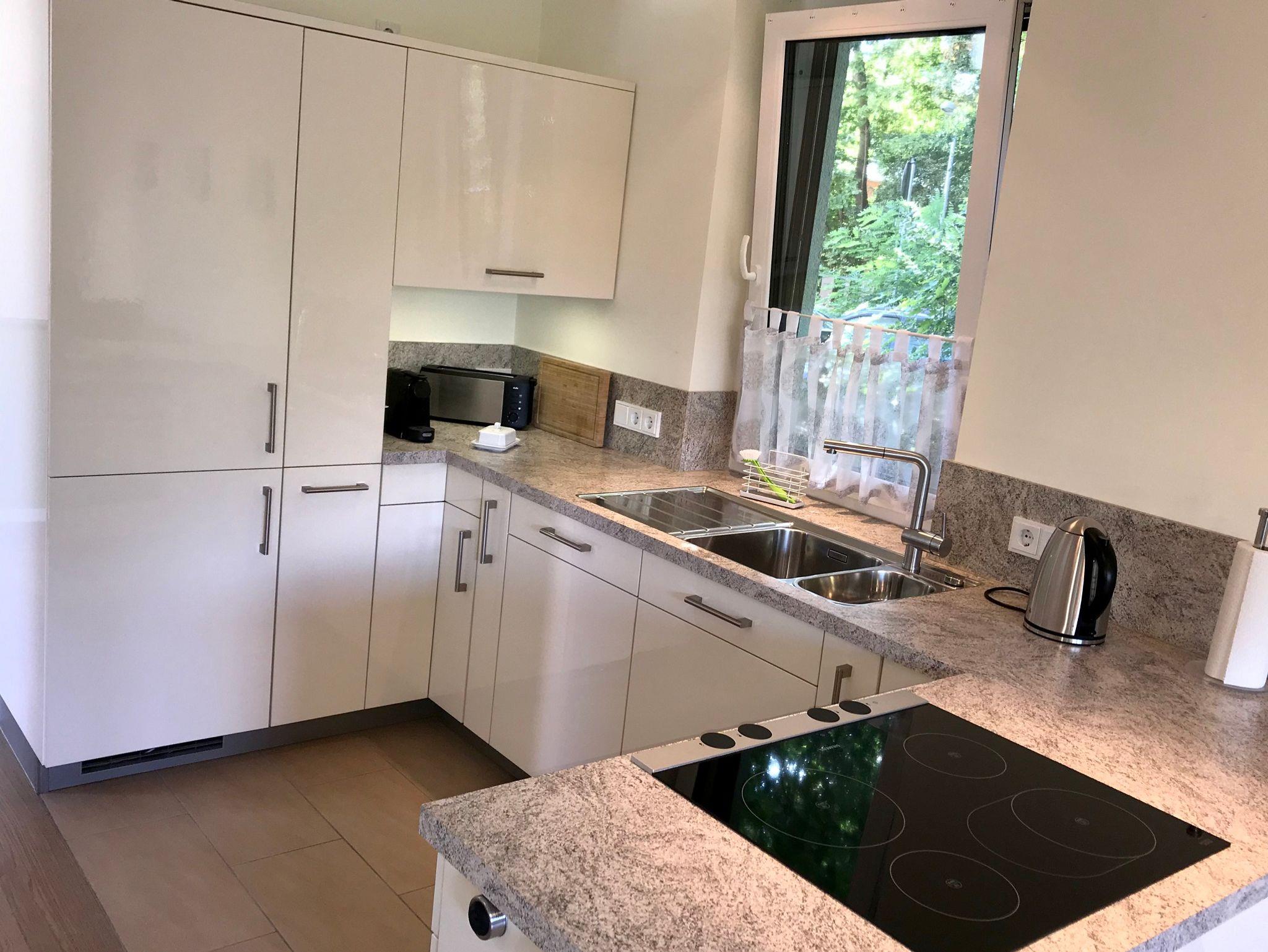 Die komplett ausgestattete Einbauküche erwartet Sie mit Annehmlichkeiten wie einem Ceran-Kochfeld, Backofen sowie einer Spülmaschine.