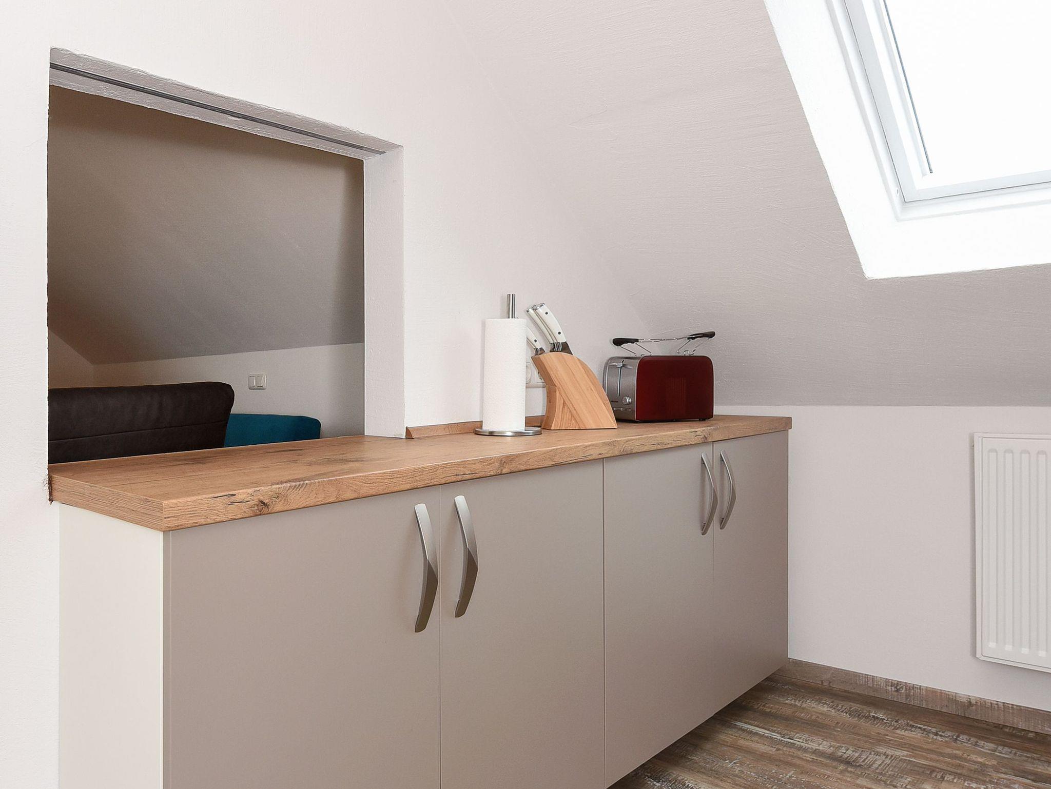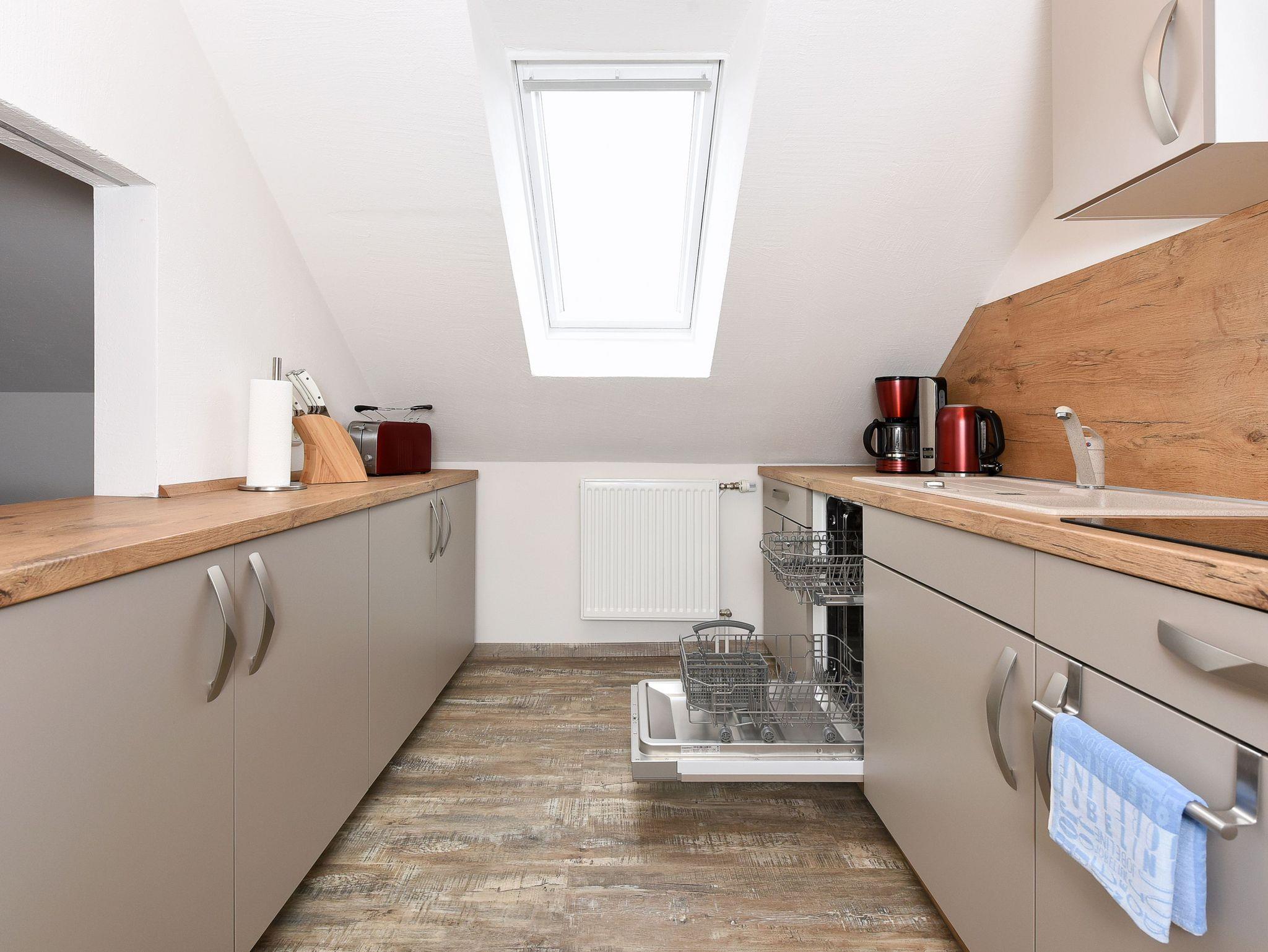 Wohnzimmer mit Schlafmöglichkeit, Küche, Schlafzimmer, Badezimmer mit Dusche, Waschtisch und WC, Obergeschoss, optimal für 2 Personen.