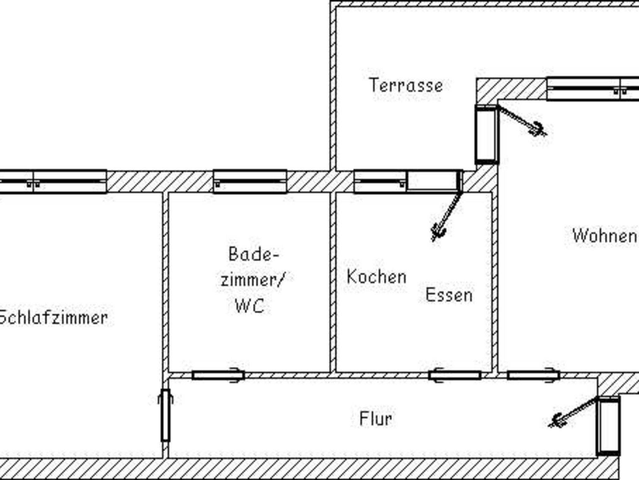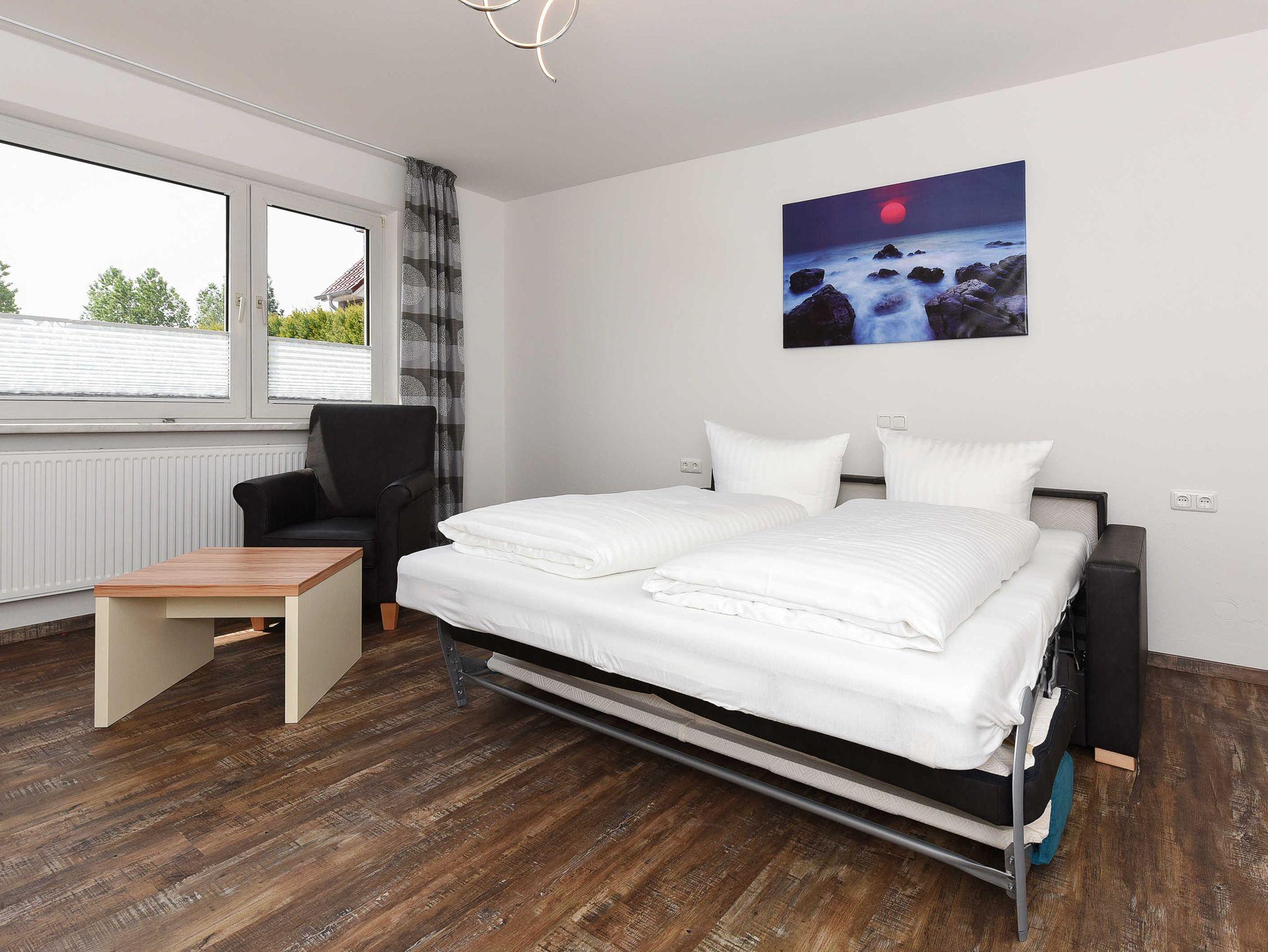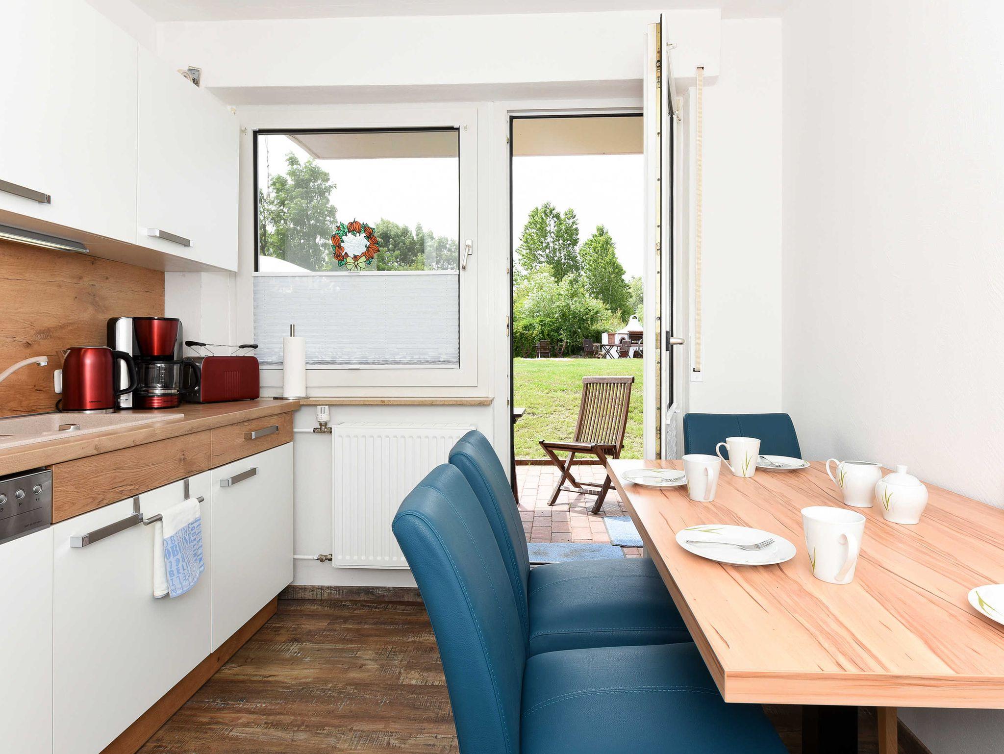Wohnzimmer mit Schlafmöglichkeit, Küche, Schlafzimmer, Badezimmer mit Dusche, Waschtisch und WC, Erdgeschoss, Terrasse, optimal für 2 bis 4 Personen und zusätzlich ein Kleinkind.