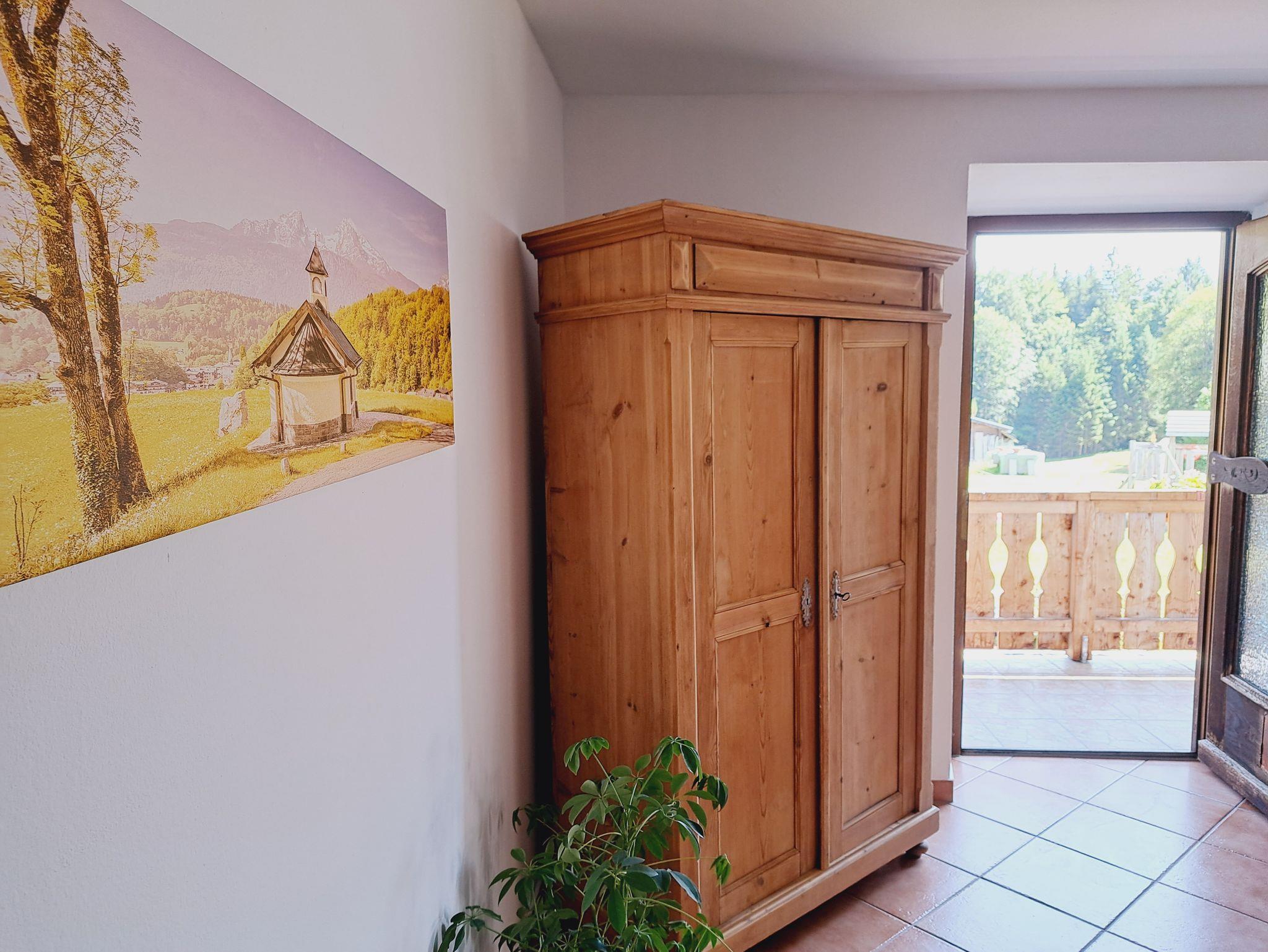 Top ausgestattete Ferienwohnung mit neu renoviertem Bad inkl. Fußbodenheizung sowie ebenerdiger Dusche und Handtuchheizung. Separates WC. Großes Schlafzimmer mit bequemem Bett und geräumigem Kleiderschrank. Geräumiges Wohnzimmer mit bequemer, ausklappbarer Couch, Kachelofen (Brennholz im Winter vorhanden) und TV. Voll ausgestattete Küche mit Geschirrspüler, Backofen, Mikrowelle, Herd, Kühlschrank mit Gefrierfach, Kaffeemaschine, Toaster, Wasserkocher und Radio. Geräumige Diele mit Garderobe. Gemütlicher Balkon mit Blick auf den Watzmann. Hier laden eine Essecke, eine schöne Holzbank und ein Sonnenschirm zum Verweilen ein. Kostenloses W-LAN in allen Zimmern.